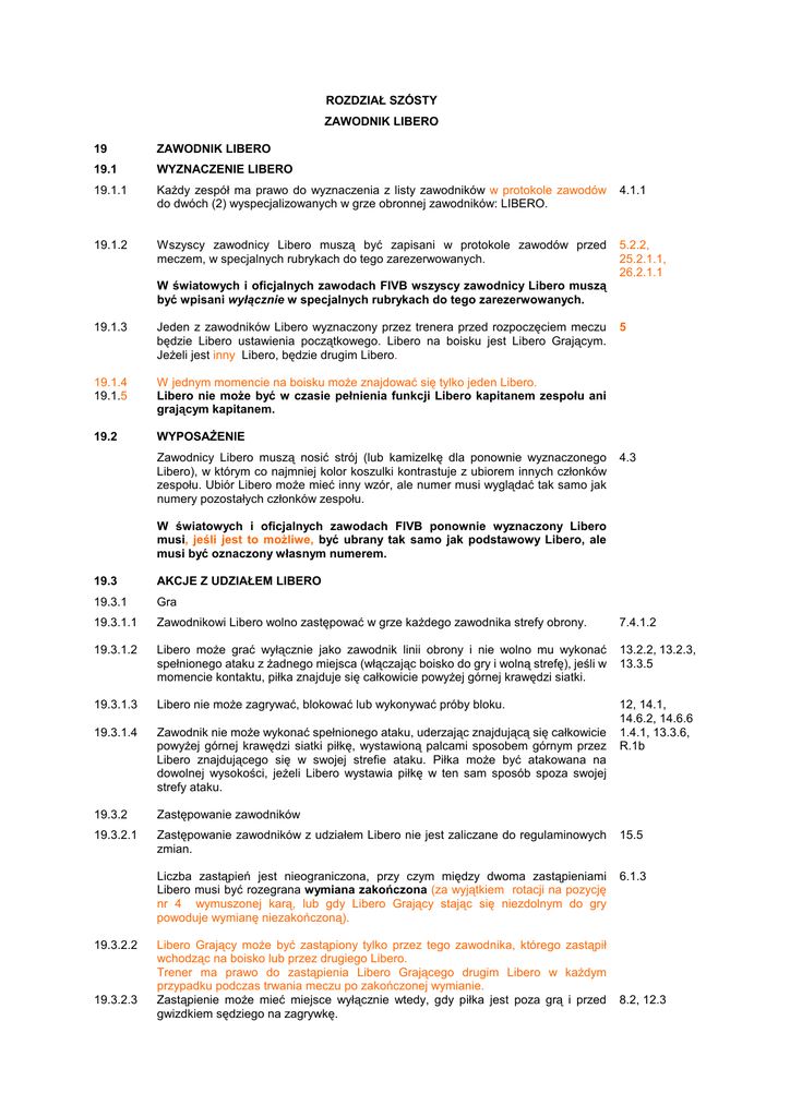 ROZDZIAŁ SZÓSTY ZAWODNIK LIBERO 19 ZAWODNIK LIBERO 19.1 WYZNACZENIE LIBERO 19.1.1 Każdy zespół ma prawo do wyznaczenia z listy zawodników w protokole zawodów do dwóch (2) wyspecjalizowanych w grze obronnej zawodników: LIBERO. 4.1.1 19.1.2 Wszyscy zawodnicy Libero muszą być zapisani w protokole zawodów przed meczem, w specjalnych rubrykach do tego zarezerwowanych. 5.2.2, 25.2.1.1, 26.2.1.1 W światowych i oficjalnych zawodach FIVB wszyscy zawodnicy Libero muszą być wpisani wyłącznie w specjalnych rubrykach do tego zarezerwowanych. 19.1.3 Jeden z zawodników Libero wyznaczony przez trenera przed rozpoczęciem meczu będzie Libero ustawienia początkowego. Libero na boisku jest Libero Grającym. Jeżeli jest inny Libero, będzie drugim Libero. 19.1.4 19.1.5 W jednym momencie na boisku może znajdować się tylko jeden Libero. Libero nie może być w czasie pełnienia funkcji Libero kapitanem zespołu ani grającym kapitanem. 19.2 WYPOSAŻENIE Zawodnicy Libero muszą nosić strój (lub kamizelkę dla ponownie wyznaczonego Libero), w którym co najmniej kolor koszulki kontrastuje z ubiorem innych członków zespołu. Ubiór Libero może mieć inny wzór, ale numer musi wyglądać tak samo jak numery pozostałych członków zespołu. 5 4.3 W światowych i oficjalnych zawodach FIVB ponownie wyznaczony Libero musi, jeśli jest to możliwe, być ubrany tak samo jak podstawowy Libero, ale musi być oznaczony własnym numerem. 19.3 AKCJE Z UDZIAŁEM LIBERO 19.3.1 Gra 19.3.1.1 Zawodnikowi Libero wolno zastępować w grze każdego zawodnika strefy obrony. 7.4.1.2 19.3.1.2 Libero może grać wyłącznie jako zawodnik linii obrony i nie wolno mu wykonać spełnionego ataku z żadnego miejsca (włączając boisko do gry i wolną strefę), jeśli w momencie kontaktu, piłka znajduje się całkowicie powyżej górnej krawędzi siatki. 13.2.2, 13.2.3, 13.3.5 19.3.1.3 Libero nie może zagrywać, blokować lub wykonywać próby bloku. 19.3.1.4 Zawodnik nie może wykonać spełnionego ataku, uderzając znajdującą się całkowicie powyżej górnej krawędzi siatki piłkę, wystawioną palcami sposobem górnym przez Libero znajdującego się w swojej strefie ataku. Piłka może być atakowana na dowolnej wysokości, jeżeli Libero wystawia piłkę w ten sam sposób spoza swojej strefy ataku. 12, 14.1, 14.6.2, 14.6.6 1.4.1, 13.3.6, R.1b 19.3.2 Zastępowanie zawodników 19.3.2.1 Zastępowanie zawodników z udziałem Libero nie jest zaliczane do regulaminowych zmian. 15.5 Liczba zastąpień jest nieograniczona, przy czym między dwoma zastąpieniami Libero musi być rozegrana wymiana zakończona (za wyjątkiem rotacji na pozycję nr 4 wymuszonej karą, lub gdy Libero Grający stając się niezdolnym do gry powoduje wymianę niezakończoną). 6.1.3 19.3.2.2 19.3.2.3 Libero Grający może być zastąpiony tylko przez tego zawodnika, którego zastąpił wchodząc na boisko lub przez drugiego Libero. Trener ma prawo do zastąpienia Libero Grającego drugim Libero w każdym przypadku podczas trwania meczu po zakończonej wymianie. Zastąpienie może mieć miejsce wyłącznie wtedy, gdy piłka jest poza grą i przed gwizdkiem sędziego na zagrywkę. 8.2, 12.3 19.3.2.4 19.3.2.5 Przed rozpoczęciem każdego seta Libero nie może wejść na boisko, zanim sędzia drugi nie sprawdzi ustawienia początkowego zespołu. Zastąpienie wykonane po gwizdku sędziego na zagrywkę, lecz przed wykonaniem zagrywki, nie jest wycofywane, ale po zakończeniu wymiany kapitan zespołu musi być poinformowany że jest to nieprawidłowe postępowanie i jej ponowne wykonanie będzie podstawą do udzielenia sankcji za opóźnianie. 7.3.2, 12.1 12.3, 12.4, 19.3.2.6 Każde kolejne spóźnione zastąpienie powoduje natychmiastowe przerwanie gry i sankcjonowanie zespołu za opóźnianie. Rodzaj sankcji za opóźnianie wpływa na wskazanie zespołu, który będzie następnie zagrywał. 16.2, R9 19.3.2.7 Libero i zastępowany przez niego zawodnik mogą wchodzić i opuszczać boisko wyłącznie przez ”strefę zastąpień Libero”. 1.4.4, 7.5.1, R.1b 19.3.2.8 Wszystkie zastąpienia z Udziałem zawodników Libero muszą być zapisane w protokole kontroli Libero ( lub w protokole elektronicznym, jeśli jest on używany) Nieregulaminowe zastąpienie zawodnika Libero to między innymi: - pomiędzy dwoma zastąpieniami nie było zakończonej wymiany, - Libero został zastąpiony przez zawodnika innego, niż ten, którego zastępował. 7.7.2,26.2.2.1, 26.2.2.2 7.7.2, 26.2.2.2 19.3.2.9 Konsekwencje nieprzepisowego zastąpienia z udziałem Libero są takie same jak błędu rotacji. 19.4 Ponowne wyznaczenie nowego Libero 19.4.1 Zespół z dwoma zawodnikami Libero: 19.4.1.1 Kiedy zespół posiada dwóch Libero, ale jeden jest niezdolny do gry (wykluczenie, choroba, kontuzja, itd.), zespół ma prawo do gry tylko z jednym Libero i drugi Libero staje się Libero Grającym. Ponowne wyznaczenie nie będzie dozwolone, chyba że, Libero Grający stanie się niezdolny do gry przed końcem meczu, a drugi Libero również jest niezdolny do gry. 19.4.2 Zespół z jednym zawodnikiem Libero: 19.4.2.1 Jeżeli tylko jeden Libero jest wpisany do protokołu zawodów, w przypadku gdy jest on niezdolny do gry, trener może wyznaczyć jako nowego Libero na czas do końca meczu jednego spośród zawodników nie znajdujących się na boisku podczas ponownego wyznaczenia (z wyjątkiem zawodnika zastępowanego przez Libero). Trener (lub grający kapitan w przypadku nieobecności trenera) powinien zwrócić się do drugiego sędziego z prośbą o ponowne wyznaczenie. 19.3.2.1 19.4.2.2 Jeśli ponownie wyznaczony Libero jest niezdolny do gry, dalsze ponowne wyznaczania są możliwe, ale wcześniej grający jako Libero nie mogą powrócić do gry do końca meczu. Jeżeli trener zgłosi taką prośbę, kapitan zespołu może zrzec się swej funkcji, aby pełnić rolę nowego Libero. 19.4.2.1 19.4.2.3 19.4.2.4 W przypadku ponownego wyznaczenia Libero, numer zawodnika wy