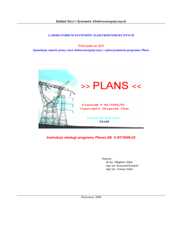 Zakład Sieci i Systemów Elektroenergetycznych LABORATORIUM SYSTEMÓW ELEKTROENERGECZNYCH Ćwiczenie nr S21 Symulacja stanów pracy sieci elektroenergetycznej z wykorzystaniem programu Plans Instrukcja obsługi programu PlansLAB V.NT/2006.02 Autorzy: dr inż. Zbigniew Zdun mgr inż. Krzysztof Księżyk mgr inż. Tomasz Zdun Warszawa, 2006 Spis treści 1.Uruchamianie i ogólne zasady pracy programu Plans...........................................................................................................4 1.1.Uruchamianie programu Plans.........................................................................................................................................4 1.2.Ogólne zasady korzystania z programu Plans.................................................................................................................4 2.Wprowadzanie i edycja danych sieciowych............................................................................................................................5 2.1.Odczyt danych sieciowych................................................................................................................................................5 2.2.Edycja danych sieciowych................................................................................................................................................5 2.2.1.Edycja danych gałęziowych........................................................................................................................................7 2.2.2.Edycja danych linii przesyłowych...............................................................................................................................7 2.2.3.Edycja danych transformatorów sieciowych...............................................................................................................8 2.2.4.Edycja danych węzłowych..........................................................................................................................................8 2.2.5.Edycja danych generatorowych...................................................................................................................................9 2.2.6.Edycja danych opisujących odbiory..........................................................................................................................10 2.2.7.Edycja danych definiujących obszary.......................................................................................................................11 2.2.8.Edycja opisu danych (komentarz).............................................................................................................................11 2.3.Zapis danych sieciowych................................................................................................................................................11 3.Obliczenia rozpływowe.........................................................................................................................................................12 3.1.Obliczenia rozpływowe - iterowanie napięć..................................................................................................................12 3.2.Typowe przyczyny rozbieżności procesu iteracyjnego:.................................................................................................13 4.Wykonywanie obliczeń rozpływowych na schematach........................................................................................................14 5.Tabelaryczny wydruk wyników obliczeń rozpływowych.....................................................................................................18 6.Kontrola ograniczeń..............................................................................................................................................................18 7.Obliczanie rozpływowe według reguły N-1..........................................................................................................................19 8.Przebieg ćwiczenia................................................................................................................................................................20 4 Uruchamianie i ogólne zasady pracy programu Plans 1. Uruchamianie i ogólne zasady pracy programu Plans 1.1. Uruchamianie programu Plans Uruchamianie programu Plans następuje poprzez dwukrotne kliknięcie ikony Plans znajdującej się na pulpicie. Możliwe jest też uruchomienie programu poprzez wybranie polecenia: StartProgramyPlansPlans. Program Plans może być uruchamiany z dwoma parametrami z linii poleceń. Pierwszy parametr oznacza nazwę pliku z danymi sieciowymi, a drugi nazwę pliku z rysunkiem sieci na której zostaną wyświetlone wyniki obliczeń rozpływowych. Wprowadzenie tych nazw jest możliwe w opcji ”właściwości” ikony programu. Uruchomienie programu tak skonfigurowanego spowoduje automatyczne wczytanie danych sieciowych z podanego pliku, obliczenie rozpływu mocy (wykonanie obliczeń iteracyjnych), otwarcie pliku z rysunkiem sieci i naniesienie na ten rysunek przepływów mocy (wyników obliczeń rozpływowych). Można program uruchamiać tylko z jednym parametrem – nazwą pliku z danymi sieciowymi, wtedy program w czasie uruchamiania wczyta dane z pliku (nie wykona obliczeń iteracyjnych). 1.2. Ogólne zasady korzystania z programu Plans Po uruchomieniu programu Plans pojawi się ekran powitalny na czas około trzech sekund, a następnie program jest gotowy do wykonywania obliczeń. Pierwszą funkcją jaka powinna zostać uruchomiona jest wczytanie danych sieciowych z pliku dyskowego po czym można przejść do obliczania rozpływów mocy (iterowania napięć), wydruku wyników obliczeń czy prezentacji graficznej wyników obliczeń na schematach sieci. Główne menu programu składa się z następujących opcji: - wczytywanie i zapis danych sieciowych, wprowadzanie uzupełnień, uruchamianie makr, Plik ustawianie 