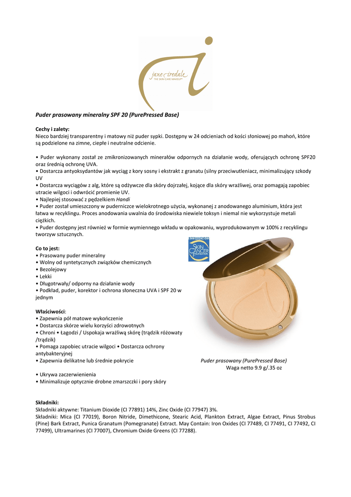 Puder prasowany mineralny SPF 20 (PurePressed Base) Cechy i zalety: Nieco bardziej transparentny i matowy niż puder sypki. Dostępny w 24 odcieniach od kości słoniowej po mahoń, które są podzielone na zimne, ciepłe i neutralne odcienie. • Puder wykonany został ze zmikronizowanych minerałów odpornych na działanie wody, oferujących ochronę SPF20 oraz średnią ochronę UVA. • Dostarcza antyoksydantów jak wyciąg z kory sosny i ekstrakt z granatu (silny przeciwutleniacz, minimalizujący szkody UV • Dostarcza wyciągów z alg, które są odżywcze dla skóry dojrzałej, kojące dla skóry wrażliwej, oraz pomagają zapobiec utracie wilgoci i odwrócić promienie UV. • Najlepiej stosować z pędzelkiem Handi • Puder został umieszczony w puderniczce wielokrotnego użycia, wykonanej z anodowanego aluminium, która jest łatwa w recyklingu. Proces anodowania uwalnia do środowiska niewiele toksyn i niemal nie wykorzystuje metali ciężkich. • Puder dostępny jest również w formie wymiennego wkładu w opakowaniu, wyprodukowanym w 100% z recyklingu tworzyw sztucznych. Co to jest: • Prasowany puder mineralny • Wolny od syntetycznych związków chemicznych • Bezolejowy • Lekki • Długotrwały/ odporny na działanie wody • Podkład, puder, korektor i ochrona słoneczna UVA i SPF 20 w jednym Właściwości: • Zapewnia pół matowe wykończenie • Dostarcza skórze wielu korzyści zdrowotnych • Chroni • Łagodzi / Uspokaja wrażliwą skórę (trądzik różowaty /trądzik) • Pomaga zapobiec utracie wilgoci • Dostarcza ochrony antybakteryjnej • Zapewnia delikatne lub średnie pokrycie Puder prasowany (PurePressed Base) Waga netto 9.9 g/.35 oz • Ukrywa zaczerwienienia • Minimalizuje optycznie drobne zmarszczki i pory skóry Składniki: Składniki aktywne: Titanium Dioxide (CI 77891) 14%, Zinc Oxide (CI 77947) 3%. Składniki: Mica (CI 77019), Boron Nitride, Dimethicone, Stearic Acid, Plankton Extract, Algae Extract, Pinus Strobus (Pine) Bark Extract, Punica Granatum (Pomegranate) Extract. May Contain: Iron Oxides (CI 77489, CI 77491, CI 77492, CI 77499), Ultramarines (CI 77007), Chromium Oxide Greens (CI 77288). Kluczowe składniki: • Nadtlenek tytanu (Titanium Dioxide) o Zapewnia pokrycie i kolor, oraz aktywną ochronę przeciwsłoneczną o Łagodzi stany zapalne • Tlenek cynku (Zinc Oxide) o Zapewnia ochronę przeciwbakteryjną o Łagodzi stany zapalne • Azotek boru (Boron Nitride) o Doskonałe właściwości przylegające o Poślizg o Rozproszenie światła • Ekstrakt z minerałów morza: planktonu oraz alg (Extracts of Sea Minerals – Plankton Extract, Algae Extract) o Łagodzi o Odżywia o Pomaga w nawilżeniu skóry • Ekstrakt z granatu (Pomegranate Extract) o Chroni o Pomaga minimalizować zniszczenia UV Rodzaje skóry: Przeznaczony dla skóry normalnej, tłustej lub trądzikowej. Może być również stosowany przez osoby z cerą suchą, jeśli została ona wcześniej prawidłowo nawilżona. System: • Pędzel Handi • Woda nawilżająca (D2O, Balance, Pommisst) Zalecane przygotowanie: • Oczyść skórę twarzy rękawicą Magic Mitt bądź innym wybranym zmywaczem. • Zastosuj odpowiedni produkt nawilżający i poczekaj do całkowitego wchłonięcia. • Jeżeli jest to niezbędne, spryskaj skórę twarz odpowiednią wodą nawilżającą, a następnie poczekaj do całkowitego wyschnięcia. • Wykonaj aplikację pudru prasowanego PurePressed według instrukcji. Aplikacja: 1.Okrągłym ruchem, za pomocą lekkiego ucisku, nabierz puder na pędzel Handi z zewnętrznych krawędzi opakowania. 2.Przed aplikacją pudru, jego nadmiar dwukrotnie strzepnij do środkowej części pudru, lekko uderzając o puderniczkę. 3.Za pomocą średniego ucisku, aplikuj puder na prawym policzku zaczynając od kości policzkowych, od części skroniowej, długimi posuwistymi ruchami w dół do żuchwy. 4.Powtórz kroki 1 i 2. Za pomocą średniego ucisku, aplikuj puder na lewym policzku zaczynając od kości policzkowych, od części skroniowej, długimi posuwistymi ruchami w dół do żuchwy. 5.Powtórz kroki 1 i 2. Za pomocą średniego ucisku, aplikuj puder na czoło i skroń, na nos I jego okolice, wokół ust I podbródka. 6.Powtórz kroki 1 i 2 . Wykonując długie, posuwiste ruchy nałóż produkt od ucha do szczęki i brody, tak aby pokryć obydwie strony szyi. 7.Jeżeli istnieje taka potrzeba, nałóż produkt na uszy i dekolt. 8.Spryskaj twarz i dekolt odpowiednią wodą nawilżającą. Puder nałóż pędzlem Handi, specjalnie zaprojektowanym dla bazy mineralnej PurePressed Base. Pędzel Handi, wykonany został z oczyszczonego włosia kozy, dzięki czemu jest bardzo delikatny i umożliwia doskonałe pokrycie skóry pudrem. Pędzel Handi jest na tyle mały, iż bez problemu zmieści się w każdej kosmetyczce. Możesz go również wykorzystać do nałożenia różu oraz do rozcierania makijażu. Puder prasowany PurePressed Base nadaje matowe pokrycie w większym stopniuj niż puder sypki Amazing Base dlatego też, stanowi doskonałe rozwiązanie dla skór tłustych. Wskazówki Nałóż jaśniejszy puder w centrum twarzy a ciemniejszy na jej brzegach. Dzięki temu, Twoja twarz będzie bardziej pociągła i rozświetlona.