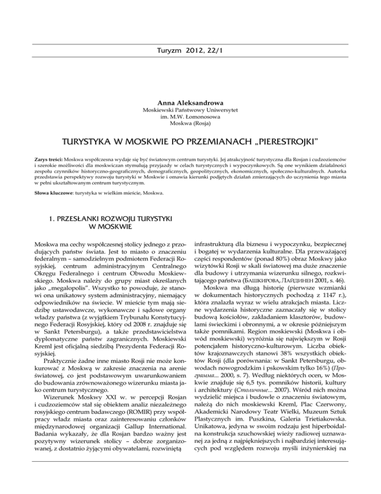 Turyzm 2012, 22/1 Anna Aleksandrowa Moskiewski Państwowy Uniwersytet im. M.W. Łomonosowa Moskwa (Rosja) TURYSTYKA W MOSKWIE PO PRZEMIANACH „PIERESTROJKI” Zarys treści: Moskwa współczesna wydaje się być światowym centrum turystyki. Jej atrakcyjność turystyczna dla Rosjan i cudzoziemców i szerokie możliwości dla moskwiczan stymulują przyjazdy w celach turystycznych i wypoczynkowych. Są one wynikiem działalności zespołu czynników historyczno-geograficznych, demograficznych, geopolitycznych, ekonomicznych, społeczno-kulturalnych. Autorka przedstawia perspektywy rozwoju turystyki w Moskwie i omawia kierunki podjętych działań zmierzających do uczynienia tego miasta w pełni ukształtowanym centrum turystycznym. Słowa kluczowe: turystyka w wielkim mieście, Moskwa. 1. PRZESŁANKI ROZWOJU TURYSTYKI W MOSKWIE Moskwa ma cechy współczesnej stolicy jednego z przodujących państw świata. Jest to miasto o znaczeniu federalnym – samodzielnym podmiotem Federacji Rosyjskiej, centrum administracyjnym Centralnego Okręgu Federalnego i centrum Obwodu Moskiewskiego. Moskwa należy do grupy miast określanych jako „megalopolis”. Wszystko to powoduje, że stanowi ona unikatowy system administracyjny, niemający odpowiedników na świecie. W mieście tym mają siedzibę ustawodawcze, wykonawcze i sądowe organy władzy państwa (z wyjątkiem Trybunału Konstytucyjnego Federacji Rosyjskiej, który od 2008 r. znajduje się w Sankt Petersburgu), a także przedstawicielstwa dyplomatyczne państw zagranicznych. Moskiewski Kreml jest oficjalną siedzibą Prezydenta Federacji Rosyjskiej. Praktycznie żadne inne miasto Rosji nie może konkurować z Moskwą w zakresie znaczenia na arenie światowej, co jest podstawowym uwarunkowaniem do budowania zrównoważonego wizerunku miasta jako centrum turystycznego. Wizerunek Moskwy XXI w. w percepcji Rosjan i cudzoziemców stał się obiektem analiz niezależnego rosyjskiego centrum badawczego (ROMIR) przy współpracy władz miasta oraz zainteresowaniu członków międzynarodowej organizacji Gallup International. Badania wykazały, że dla Rosjan bardzo ważny jest pozytywny wizerunek stolicy – dobrze zorganizowanej, z dostatnio żyjącymi obywatelami, rozwiniętą infrastrukturą dla biznesu i wypoczynku, bezpiecznej i bogatej w wydarzenia kulturalne. Dla przeważającej części respondentów (ponad 80%) obraz Moskwy jako wizytówki Rosji w skali światowej ma duże znaczenie dla budowy i utrzymania wizerunku silnego, rozkwitającego państwa (БАШКИРОВА, ЛАЙДИНЕН 2001, s. 46). Moskwa ma długą historię (pierwsze wzmianki w dokumentach historycznych pochodzą z 1147 r.), która znalazła wyraz w wielu atrakcjach miasta. Liczne wydarzenia historyczne zaznaczały się w stolicy budową kościołów, zakładaniem klasztorów, budowlami świeckimi i obronnymi, a w okresie późniejszym także pomnikami. Region moskiewski (Moskwa i obwód moskiewski) wyróżnia się największym w Rosji potencjałem historyczno-kulturowym. Liczba obiektów krajoznawczych stanowi 38% wszystkich obiektów Rosji (dla porównania: w Sankt Petersburgu, obwodach nowogrodzkim i pskowskim tylko 16%) (Программа... 2000, s. 7). Według niektórych ocen, w Moskwie znajduje się 6,5 tys. pomników historii, kultury i architektury (Столичные... 2007). Wśród nich można wydzielić miejsca i budowle o znaczeniu światowym, należą do nich moskiewski Kreml, Plac Czerwony, Akademicki Narodowy Teatr Wielki, Muzeum Sztuk Plastycznych im. Puszkina, Galeria Trietiakowska. Unikatowa, jedyna w swoim rodzaju jest hiperboidalna konstrukcja szuchowskiej wieży radiowej uznawanej za jedną z najpiękniejszych i najbardziej interesujących pod względem rozwoju myśli inżynierskiej na 44 Turyzm 2012, 22/1 T a b e l a 1. Szczególnie cenne pomniki historii i kultury w Moskwie Obiekty dziedzictwa narodowego Federacji Rosyjskieja Lp. 1 2 3 4 5 6 7 8 9 10 11 12 13 14 15 16 17 18 19 20 21 22 23 Obiekt Kreml Narodowy Akademicki Teatr Wielki Narodowy Akademicki Teatr Mały Państwowe Moskiewskie Konserwatorium im. P.I. Czajkowskiego Rosyjska Biblioteka Narodowa Akademia Artystów ZSRR Państwowy Uniwersytet im. M. W. Łomonosowa Narodowe Muzeum Historyczne Państwowe Muzeum Sztuk Plastycznych im. A. S. Puszkina Ogólnozwiązkowe Zjednoczenie Muzealne Narodowa Galeria Trietiakowska Muzeum Staroruskiej Kultury i Sztuki im. A. Rublowa Państwowe Muzeum Sztuki Narodów Dalekiego Wschodu Muzeum Politechniczne Państwowe Naukowo-Badawcze Muzeum Architektury im. A.W. Szusewa Państwowe Centralne Muzeum im. A.A. Bachruszina Państwowe Muzeum L. N. Tołstoja Cerkiew Katedralna Chrystusa Zbawiciela Państwowe Muzeum Historyczno-Wojskowe Państwowe Archiwum Federacji Rosyjskiej Rosyjskie Narodowe Archiwum Akt Dawnych Państwowe Centralne Muzeum Kultury Muzycznej im. M. I. Glinki Państwowe Rosyjskie Archiwum Literatury i Sztuki Państwowa Fundacja Programów Radiowych i Telewizyjnych Obiekty światowego dziedzictwa UNESCO Lp. 1 2 3 Obiekt Kreml i Plac Czerwony Cerkiew Wniebowzięcia w Kołomeńskim Zespół historyczno-architektoniczny klasztoru Nowodziewiczego Kryteriumb I, II, IV, VI II I, IV, VI a – Status nadany Rozporządzeniem Prezydenta Federacji Rosyjskiej № 294 z 18.12.1991, № 1847 z 6.11.1993, № 64 z 24.01.1995, № 275 z 2.04.1997, № 30 z 15.01.1998. b – Kryteria wpisania obiektu na listę Światowego Dziedzictwa UNESCO: I – obiekt, arcydzieło geniuszu ludzkiego; II – obiekt świadczy o znaczącym wpływie atrakcji antropogenicznych w danym okresie lub określonej przestrzeni kulturowej, w architekturze lub technologiach, sztuce monumentalnej, w planowaniu miast lub tworzeniu krajobrazów; IV – obiekt jest ważnym przykładem konstrukcji zespołu architektonicznego, technologicznego lub krajobrazowego, które ilustrują znaczący okres historii ludzkości; VI – obiekt bezpośrednio lub pośrednio związany jest z wydarzeniami, tra