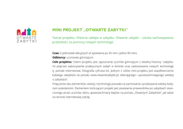 Mini projekt „Otwarte zabytki” Temat projektu: Historia zaklęta w zabytku. Otwarte zabytki – sztuka zachowywania przeszłości za pomocą nowych technologii. Czas: 6 jednostek lekcyjnych (4 spotkania po 45 min i jedno 90 min). Odbiorcy: uczniowie gimnazjum. Cele projektu: Celem projektu jest zapoznanie uczniów gimnazjum z lokalną historią i zabytkami poprzez wykonywanie praktycznych zadań w terenie oraz zastosowanie nowych technologii tj. portale internetowe, fotografia cyfrowa itd. Jednym z celów mini-projektu jest współtworzenie katalogu zabytków na portalu www.otwartezabytki.pl, zbierającego i upowszechniającego wiedzę o zabytkach. Połączenie obu elementów: wiedzy i technologii pozwala na zachowanie i przekazanie wiedzy kolejnym pokoleniom. Elementem kończącym projekt jest powstanie przewodnika po zabytkach stworzonego przez uczniów, który upowszechniany będzie na portalu „Otwartych Zabytków”, jak także na stronie internetowej szkoły. Lekcja I Temat zajęć: Czas: 45 Moja mała ojczyzna. Zabytki historyczne naszego regionu. min Odbiorcy: uczniowie gimnazjum Treści programowe: • lokalne zabytki historyczne, • historia zabytków, informacje o nich, lokalizacja zabytków. Cele ogólne: • poznanie przez uczniów najcenniejszych zabytków regionu, poszerzenie wiedzy na temat historii lokalnej, • nabycie umiejętności nazywania, opisywania, umiejscawiania na mapie oraz określania czasu powstania zabytku, • kształcenie umiejętności pracy w grupie. Cele szczegółowe: Po skończonej lekcji uczeń: • zna historię regionu na poziomie szkoły gimnazjalnej, • nazywa i opisuje najważniejsze zabytki historyczne regionu, • umiejscawia w czasie oraz lokalizuje na mapie poszczególne zabytki. Metody Wykład problemowy, opis, metody aktywizujące (dyskusja dydaktyczna), burza mózgów. 2 Pomoce Ilustracje, plansze, mapa ścienna. Forma pracy: • praca indywidualna, • praca w grupie. Przebieg lekcji: • sprawy organizacyjne (sprawdzenie obecności), • zapisanie tematu lekcji, • przedstawienie krótkiej historii regionu w kilku punktach na podstawie 5 zabytków istniejących w katalogu „Otwartych zabytków” i 5 które nie są skatalogowane, • podzielenie uczniów na 2-4 osobowe grupy (w zależności od wielkości klasy i liczby zabytków, które zostaną wykorzystane w projekcie). W ramach grup uczniowie mają za zadanie wypisać jak najwięcej informacji na temat zabytków (podać nazwę, lokalizację, jeśli wcześniej słyszeli, podać datę powstania zabytku ewentualnie historię związaną z jego wzniesieniem), • wspólna dyskusja, podczas której uczniowie przedstawiają znane im z autopsji lub opowieści zabytki, • pod koniec lekcji nauczyciel informuje, że kolejne zajęcia przyjmą formę gry terenowej trwającej 90 min (2 godz. lekcyjne). Uczniowie mają za zadanie wziąć ze sobą aparaty cyfrowe (jeden na grupę) oraz notesy i długopisy. Nauczyciel podaje miejsce i czas zbiórki, np. szkoła, rynek miasta itd. 3 Lekcja II Temat zajęć: Szlakiem zabytków z przeszłości – gra terenowa Czas: 90 min Odbiorcy: uczniowie gimnazjum Treści programowe: • lokalne zabytki historyczne – praca w terenie, • historia zabytków, informacje o nich, lokalizacja zabytków na mapie, • praca własna uczniów, zajęcia praktyczne, sporządzanie zdjęć, ocenianie stanu zabytków. Cele ogólne: • poznanie przez uczniów najcenniejszych zabytków regionu, poszerzenie wiedzy na temat historii lokalnej, • nabycie umiejętności nazywania, opisywania, umiejscawiania na mapie oraz określania czasu powstania zabytku, • zapoznanie się z zabytkami w terenie, sporządzenie dokumentacji fotograficznej zabytków oraz oceniania stanu ich zachowania, • kształcenie umiejętności pracy w grupie. Cele szczegółowe: Po skończonej lekcji uczeń potrafi: • wskazywać zabytki lokalne w terenie, • sporządzać dokumentację fotograficzną zabytków, • opisywać zabytki, które znajdują się w terenie, • umiejscawiać w czasie oraz lokalizować na mapie poszczególne zabytki. 4 Metody Gra terenowa. Pomoce Mapy (np. google maps, mapy na licencji CC Creative Commons), wydruki zawierające informacje o zabytkach, aparaty, krzyżówki, puzzle, układanki literowe, taśma, nożyczki, aparaty fotograficzne. Forma pracy: • praca indywidualna, • praca w grupie. Przebieg zajęć: Przed przystąpieniem do gry terenowej, nauczyciel musi ją odpowiednio przygotować min. wyznaczyć trasę dla każdej grupy, uwzględniając zabytki omawiane na poprzedniej lekcji, przygotować krzyżówki, puzzle, układanki itp. • Sprawy organizacyjne (sprawdzenie obecności). • Wytłumaczenie reguł gry. • Każda grupa otrzymuje mapkę regionu z zaznaczonym pierwszym punktem (mapy można pobrać bez naruszenia praw autorskich z Google maps lub ze stron oznaczonych licencją CC Creative Commons) Pod mapkami powinna być wyszczególniona legenda, zawierająca cyfry odpowiadające kolejnym zabytkom, pod którymi uczniowie powinni wpisać w odpowiedniej kolejności zabytki, do których dotarli, a także powinni je zaznaczyć na mapie zgodnie z legendą. 5 np. 1. Kościół Św. Jerzego (uczniowie sami wpisują nazwę zabytku, do którego aktualnie dotarli w ramach gry terenowej, cyfrę 1 mają zaś nanieść na mapę w miejscu odpowiadającym faktycznemu położeniu Kościoła): • Na każdym punkcie, do którego dochodzą uczniowie powinny być umieszczone informacje o danym zabytku (może być to w formie wydruków). Uczniowie mają za zadania zapoznanie się z nimi. Następnie uczniowie udają się do kolejnego zabytku. Wskazówką dotyczącą kolejnego punktu mogą to być np.: a) hasło krzyżówki np. Ruiny Zamku (krzyżówka powinna być związana tematycznie z grą terenową i zabytkami), b) układanka z puzzli przedstawiająca konkretny zabytek np. pomnik, c) układanka z literek, z których należy ułożyć nazwę kolejnego zabytku np. 
