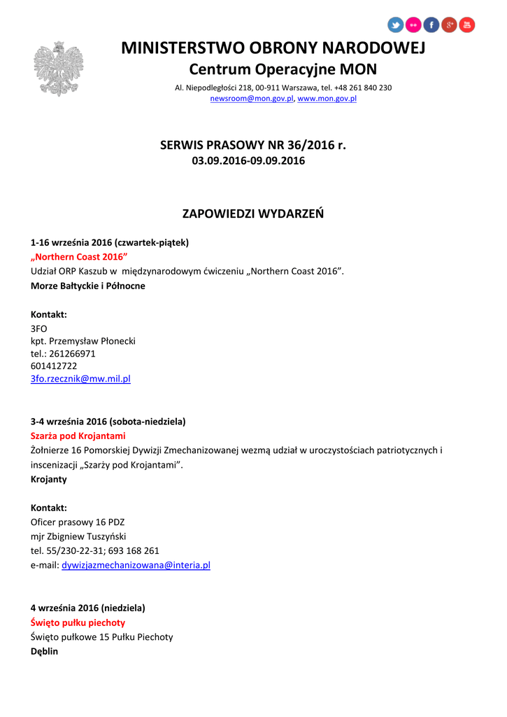 MINISTERSTWO OBRONY NARODOWEJ Centrum Operacyjne MON Al. Niepodległości 218, 00-911 Warszawa, tel. +48 261 840 230 [email protected], www.mon.gov.pl SERWIS PRASOWY NR 36/2016 r. 03.09.2016-09.09.2016 ZAPOWIEDZI WYDARZEŃ 1-16 września 2016 (czwartek-piątek) „Northern Coast 2016” Udział ORP Kaszub w międzynarodowym ćwiczeniu „Northern Coast 2016”. Morze Bałtyckie i Północne Kontakt: 3FO kpt. Przemysław Płonecki tel.: 261266971 601412722 [email protected] 3-4 września 2016 (sobota-niedziela) Szarża pod Krojantami Żołnierze 16 Pomorskiej Dywizji Zmechanizowanej wezmą udział w uroczystościach patriotycznych i inscenizacji „Szarży pod Krojantami”. Krojanty Kontakt: Oficer prasowy 16 PDZ mjr Zbigniew Tuszyński tel. 55/230-22-31; 693 168 261 e-mail: [email protected] 4 września 2016 (niedziela) Święto pułku piechoty Święto pułkowe 15 Pułku Piechoty Dęblin Kontakt: Oficer prasowy 1 BDM kpt. Krzysztof Pokorski tel. 519 039 073 e-mail: [email protected] 4-9 września 2016 (niedziela-piątek) Udział żołnierzy w Międzynarodowym Salonie Przemysłu Obronnego Żołnierze 3 Flotylli Okrętów, 12 Szczecińskiej Dywizji Zmechanizowanej i 10 Brygady Logistycznej wezmą udział w XXIV MSPO. Kielce (Targi Kielce, ul. Kongresowa) Kontakt: Oficer prasowy 10 Blog por. Piotr Płuciennik tel. 261 625 611, kom. 669 924 221 e-mail: [email protected] Oficer prasowy 3 FO kpt. Przemysław Płonecki kom. 601 412 722; tel. 261 266 971 e-mail: [email protected] Podoficer Sekcji Prasowej 12 SDZ st. chor. Artur Walento kom. 668 814 714 e-mail: [email protected] 5 września 2016 (poniedziałek), godz. 10.30 Konferencja prasowa PGZ Sekretarz stanu w MON Bartosz Kownacki weźmie udział w konferencji pasowej pt. „Polski przemysł obronny w procesie modernizacji Sił Zbrojnych”. Spotkanie organizuje Polska Grupa Zbrojeniowa S.A.. Biuro PGZ S.A. w Warszawie przy ul. Nowy Świat 4a Kontakt: Hanna Węglewska Rzecznik Prasowy Dyrektor Biura PR tel. (+48) 22 718 43 08 e-mail: hanna.weglewska@pgzsa 5-9 września 2016 (poniedziałek-piątek), godz. 8:00-14:00 Szkolenie doskonalące i certyfikacja Szkolenie doskonalące oraz certyfikacja części specjalistycznej Zespołu Łączności i Informatyki XXXV zmiany PKW KFOR oraz Grupy Łączności V zmiany PKW Afganistan RSM. Zegrze (CSŁiI, ul. Juzistek 2) Kontakt: Oficer prasowy CSŁiI kpt. Krzysztof Baran kom. 722 380 054 e-mail: [email protected] Kierownik Cyklu Telekomunikacji mjr Paweł Nowotnik Tel. 261 883 336 5-23 września 2016 Ćwiczenie „Venerable Gantlet 16” Udział żołnierzy 10 Brygady Kawalerii Pancernej w ćwiczeniu „Venerable Gantlet 16" Niemcy Kontakt: Oficer prasowy 10 BKPanc. Kpt. Adriana Wołyńska tel. 261 685 033 e-mail: [email protected] 5-23 września 2016 Szkolenie poligonowe Szkolenie poligonowe pododdziałów 22 Karpackiego Batalionu Piechoty Górskiej. W czasie szkolenia odbędą się ćwiczenia dobowe wybranych pododdziałów. Wędrzyn Kontakt: 21 BSP kpt. Kamila Sochacka kom. 693 090 198 5-30 września 2016 Szkolenie poligonowe Szkolenie poligonowe pododdziałów 9 Braniewskiej Brygady Kawalerii Pancernej. Bemowo Piskie (OSPWL Orzysz) Kontakt: Rzecznik prasowy 9 BBKPanc. Marta Hajkowicz tel. 261 316 131; kom. 727 041 100 e-mail: [email protected] 6 września 2016 (wtorek) Ćwiczenie-przeprawa na rzece Przeprawa na rzece pododdziałów 2 Brygady Zmechanizowanej i 2 Batalionu Piechoty zmotoryzowanej 12 Brygady Zmechanizowanej. Biała Góra Kontakt: Oficer prasowy 12 SDZ por. Błażej Łukaszewski kom. 695 301 720 e-mail: [email protected] 6-7 września 2016 (wtorek-środa) Turnus służby przygotowawczej Przyjęcie żołnierzy III turnusu służby przygotowawczej . Poznań (ul. Wojska Polskiego) Kontakt: Oficer prasowy CSWL kpt. Piotr Wójcik kom. 785 402 919, tel. 261 575 227 e-mail: [email protected] 6-7 września 2016 (wtorek-środa) Wcielenie żołnierzy Wcielenie żołnierzy III turnusu Narodowych Sił Rezerwowych. Wrocław (CSWliChem) Kontakt: Oficer prasowy CSWliChem kpt. Marek Gwóźdź tel. 261 657 283; kom. 723 694 403 e-mail: [email protected] 6-7 września 2016 (wtorek-środa) Wcielenie kandydatów do służby przygotowawczej Wcielenie kandydatów do służby przygotowawczej do Narodowych Sił Rezerwowych. Bolesławiec Kontakt: 11 LDKPanc mjr Jerzy Juchaniuk tel. 261 646 622, 261 646 613 e-mail: [email protected] 6 września-23 grudnia 2016 Szkolenie elewów Szkolenie elewów służby przygotowawczej. Kłodzko Kontakt: 21 BSP kpt. Kamila Sochacka kom. 693 090 198 6 września-23 grudnia 2016 Szkolenie żołnierzy służby przygotowawczej Szkolenie żołnierzy III turnusu służby przygotowawczej. Inowrocław Kontakt: Oficer prasowy 2 Pinż. kpt. Sylwester Ludwiczak tel. 261 436 243 e-mail: [email protected] 6 września-23 grudnia 2016 Szkolenie żołnierzy służby przygotowawczej Szkolenie żołnierzy III turnusu służby przygotowawczej. Hel Kontakt: Oficer prasowy 3 FO. kpt. Przemysław Płonecki tel. 261 266 971, kom. 601 412 722 e-mail: [email protected] KRONIKA 26 sierpnia 2016 (piątek) Obchody Święta Lotnictwa Wojskowego W dniach 25 - 27 sierpnia pod Patronatem Honorowym Prezydenta Rzeczpospolitej Andrzeja Dudy na poznańskich Krzesinach odbyły się centralne obchody Święta Lotnictwa Wojskowego, jubileusz 10-lecia samolotów F-16 w Siłach Powietrznych RP oraz święto 31 Bazy Lotnictwa Taktycznego. Więcej... 27 sierpnia 2016 (sobota) Szef MON na Święcie Lotnictwa Mamy prawo być z Was dumni, z tego, czego codziennie dokonujecie, z Waszego wielkiego wysiłku, z Waszej determinacji, z Waszej pracy – powiedział minister obrony narodowej Antoni Macierewicz zwracając się do lotników podczas Ich święta. Więcej... 27 sierpnia 2016 (sobota) Wojska Lądowe świętowały pod Mławą 350 rekonstruktorów, piechota, kawaleria, czołgi i samoloty – miłośnicy historii odtworzyli sceny bitwy pod Mławą, do której doszło we wrześniu 1939 roku. Przeważającym siłom niemieck