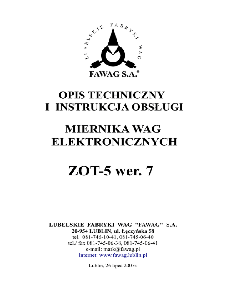 OPIS TECHNICZNY I INSTRUKCJA OBSŁUGI MIERNIKA WAG ELEKTRONICZNYCH ZOT-5 wer. 7 LUBELSKIE FABRYKI WAG "FAWAG" S.A. 20-954 LUBLIN, ul. Łęczyńska 58 tel. 081-746-10-41, 081-745-06-40 tel./ fax 081-745-06-38, 081-745-06-41 e-mail: [email protected] internet: www.fawag.lublin.pl Lublin, 26 lipca 2007r. Spis treści 1.WSTĘP.............................................................................................................................................3 2. CHARAKTERYSTYKA TECHNICZNA....................................................................................6 3. BUDOWA MIERNIKA ELEKTRONICZNEGO........................................................................7 4. TRANSPORT I PRZECHOWYWANIE......................................................................................8 5. WYPOSAŻENIE I ROZPAKOWANIE MIERNIKA.................................................................8 6. ZASILANIE....................................................................................................................................8 7. OBSŁUGA MIERNIKA................................................................................................................8 7.1 WAŻENIE.................................................................................................................................10 7.2 ZEROWANIE...........................................................................................................................11 7.3 TAROWANIE...........................................................................................................................11 7.4 BLOKADA TARY (nie dotyczy wagi dwuzakresowej)...........................................................11 7.5 PODGLĄD WARTOŚCI BRUTTO.........................................................................................12 7.6 SYGNALIZACJA BŁĘDÓW WAŻENIA ...............................................................................12 8. PROGRAMOWANIE FUNKCJI MIERNIKA.........................................................................12 8.1 WPROWADZANIE TARY Z KLAWIATURY (nie dotyczy wagi legalizowanej)..................12 8.2 WYBÓR SPOSOBU INICJOWANIA TRANSMISJI .............................................................13 8.3 WYBÓR PROTOKOŁU TRANSMISJI .................................................................................13 8.4 PROGRAMOWANIE PARAMETRÓW I PRĘDKOŚCI TRANSMISJI................................13 8.5 WYŚWIETLENIE DATY I WERSJI PROGRAMU................................................................14 8.6 OBCIĄŻENIE WSTĘPNE.......................................................................................................14 8.7 USTAWIENIE CZASU BADANIA STABILNOŚCI..............................................................15 8.8 PROGRAMOWANIE TŁUMIENIA FILTRU.........................................................................15 8.9 PROGRAMOWANIE CZASU WYŁĄCZENIA MIERNIKA................................................15 8.10 ZAŁĄCZANIE BRZĘCZYKA..............................................................................................15 8.11 ZAŁĄCZANIE PODŚWIETLENIA WYŚWIETLACZA LCD............................................16 8.12 FUNKCJA AUTOZERO........................................................................................................16 8.13 POMIAR SIŁY NACISKU NA SZALKĘ MIERNIKA ........................................................16 8.14 FUNKCJA PRZELICZANIA PROCENTOWEGO ..............................................................16 8.15 POMIAR TEMPERATURY ..................................................................................................17 8.16 WAGA KONTROLNA +/- (opcja – tylko program z obsługą płytki wyjść)........................17 8.17 LICZENIE ILOŚCI SZTUK ..................................................................................................18 9. WYJŚCIE RS 232C lub USB (opcja)..........................................................................................20 9.1 SPOSÓB INICJOWANIA TRANSMISJI ...............................................................................21 9.2 PROTOKOŁY TRANSMISJI .................................................................................................21 Lubelskie Fabryki Wag „FAWAG” S.A. -2- 1.WSTĘP Miernik wag elektronicznych ZOT5 jest uniwersalnym układem elektronicznym posiadającym następujące funkcje: funkcję liczenia sztuk dostępną po naciśnięciu klawisza oraz poniższe funkcje dostępne po naciśnięciu klawisza F : TARA TRAN PROT BOD PROG OBC STAB FILTR CZAS BUZER PODS ZERO NIUT PROC TEMP KONT – wprowadzenie tary z klawiatury (tylko waga nielegalizowana), – sposób transmisji (S R - ręczny, S RU - ręczny ustabilizowany, S U - ustabilizowany, S C - ciągły), – numer protokołu transmisji, – prędkość transmisji (600 – 57600 bodów), parametry transmisji, – data i wersja programu, – obciążenie wstępne, – ustawienie czasu badania stabilności, – programowanie tłumienia filtru, – programowanie czasu wyłączenia wagi, – załączanie brzęczyka, – załączanie podświetlenia wyświetlacza LCD, – funkcja AUTOZERO, – pomiar siły nacisku na szalkę wagi, – funkcja przeliczania procentowego, – funkcja pomiaru temperatury, – waga kontrolna +/-.(opcja - tylko waga z obsługą płytki wyjść) Oznaczenie stosowanego w mierniku oprogramowania: LUPXXX - waga legalizowana z interfejsem USB i obsługą płytki wyjść, LU XXX - waga legalizowana z interfejsem USB, LRPXXX - waga legalizowana z interfejsem RS232C i obsługą płytki wyjść, LR XXX - waga legalizowana z interfejsem RS232C, NUPXXX - waga nielegalizowana z interfejsem USB i obsługą płytki wyjść, NU XXX - waga nielegalizowana z interfejsem USB, NRPXXX - waga nielegalizowana z interfejsem RS232C i obsługą płytki wyjść, NR XXX - waga nielegalizowana z interfejsem RS232C, gdzie:XXX – wersj