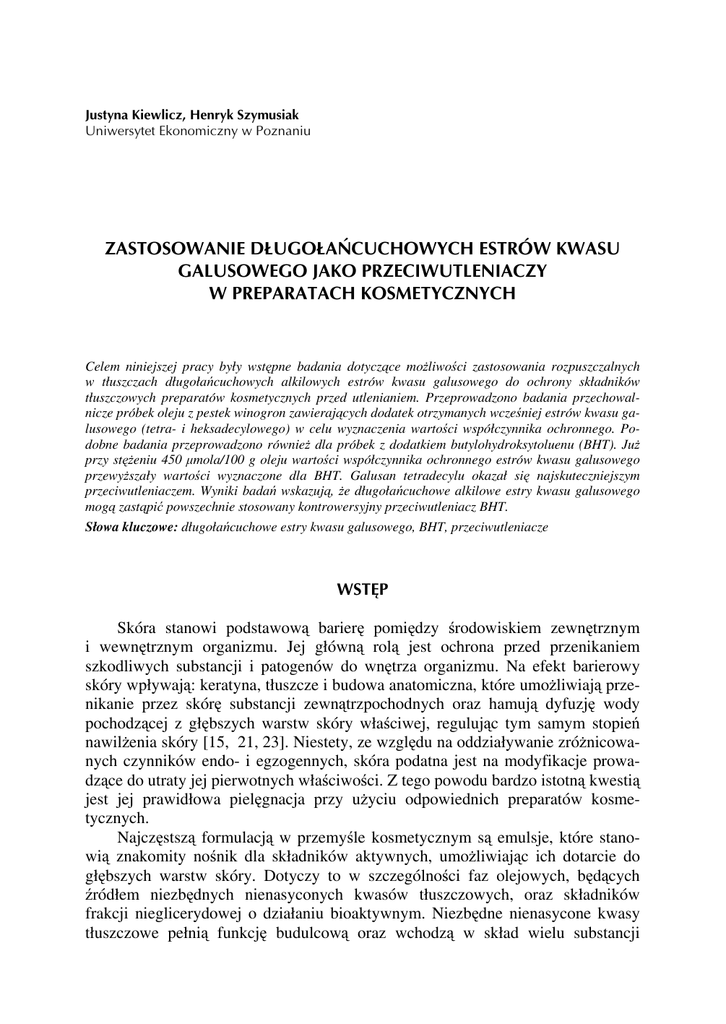 Justyna Kiewlicz, Henryk Szymusiak Uniwersytet Ekonomiczny w Poznaniu ZASTOSOWANIE DŁUGOŁAŃCUCHOWYCH ESTRÓW KWASU GALUSOWEGO JAKO PRZECIWUTLENIACZY W PREPARATACH KOSMETYCZNYCH Celem niniejszej pracy były wstępne badania dotyczące możliwości zastosowania rozpuszczalnych w tłuszczach długołańcuchowych alkilowych estrów kwasu galusowego do ochrony składników tłuszczowych preparatów kosmetycznych przed utlenianiem. Przeprowadzono badania przechowalnicze próbek oleju z pestek winogron zawierających dodatek otrzymanych wcześniej estrów kwasu galusowego (tetra- i heksadecylowego) w celu wyznaczenia wartości współczynnika ochronnego. Podobne badania przeprowadzono również dla próbek z dodatkiem butylohydroksytoluenu (BHT). Już przy stężeniu 450 μmola/100 g oleju wartości współczynnika ochronnego estrów kwasu galusowego przewyższały wartości wyznaczone dla BHT. Galusan tetradecylu okazał się najskuteczniejszym przeciwutleniaczem. Wyniki badań wskazują, że długołańcuchowe alkilowe estry kwasu galusowego mogą zastąpić powszechnie stosowany kontrowersyjny przeciwutleniacz BHT. Słowa kluczowe: długołańcuchowe estry kwasu galusowego, BHT, przeciwutleniacze WSTĘP Skóra stanowi podstawową barierę pomiędzy środowiskiem zewnętrznym i wewnętrznym organizmu. Jej główną rolą jest ochrona przed przenikaniem szkodliwych substancji i patogenów do wnętrza organizmu. Na efekt barierowy skóry wpływają: keratyna, tłuszcze i budowa anatomiczna, które umożliwiają przenikanie przez skórę substancji zewnątrzpochodnych oraz hamują dyfuzję wody pochodzącej z głębszych warstw skóry właściwej, regulując tym samym stopień nawilżenia skóry [15, 21, 23]. Niestety, ze względu na oddziaływanie zróżnicowanych czynników endo- i egzogennych, skóra podatna jest na modyfikacje prowadzące do utraty jej pierwotnych właściwości. Z tego powodu bardzo istotną kwestią jest jej prawidłowa pielęgnacja przy użyciu odpowiednich preparatów kosmetycznych. Najczęstszą formulacją w przemyśle kosmetycznym są emulsje, które stanowią znakomity nośnik dla składników aktywnych, umożliwiając ich dotarcie do głębszych warstw skóry. Dotyczy to w szczególności faz olejowych, będących źródłem niezbędnych nienasyconych kwasów tłuszczowych, oraz składników frakcji nieglicerydowej o działaniu bioaktywnym. Niezbędne nienasycone kwasy tłuszczowe pełnią funkcję budulcową oraz wchodzą w skład wielu substancji J. Kiewlicz, H. Szymusiak, Zastosowanie długołańcuchowych estrów kwasu galusowego... 259 biologicznie czynnych, dzięki czemu wpływają na homeostazę skóry i całego organizmu [1, 3, 22]. Niedobór tych składników, zwłaszcza kwasu linolowego i γ-linolenowego, a także zaburzenia ich metabolizmu mogą skutkować występowaniem wielu schorzeń i dysfunkcji, takich jak łuszczyca, zapalenie atopowe skóry oraz nadmierne wysuszenie skóry [3, 12]. Emulsje kosmetyczne bogate w nienasycone kwasy tłuszczowe są jednak układami nietrwałymi, szczególnie podatnymi na procesy utleniania. W wyniku tych niekorzystnych przemian może nastąpić znaczne pogorszenie jakości preparatów kosmetycznych, przejawiające się nie tylko zmianami ich cech sensorycznych, ale także utratą ich właściwości pielęgnacyjnych oraz powstawaniem toksycznych pierwotnych i wtórnych produktów utleniania [2, 4, 5, 9, 10, 11, 14, 25, 26]. Dążenie do wyeliminowania negatywnych skutków procesów utleniania spowodowało, że są one kontrolowane na drodze różnych zabiegów technologicznych i dodatków funkcjonalnych, spośród których największą popularnością cieszy się stosowanie przeciwutleniaczy. W przemyśle kosmetycznym najczęściej wykorzystuje się przeciwutleniacze syntetyczne, takie jak BHA, BHT i palmitynian askorbylu [35]. Butylohydroksytoluen (BHT) jest jednym z najpowszechniej stosowanych przeciwutleniaczy syntetycznych. Substancję tę wykorzystuje się w przemyśle spożywczym do stabilizowania olejów roślinnych, tłuszczów zwierzęcych, chrupek, orzechów, mięsa przetworzonego, przypraw, a także niektórych składników gumy do żucia [18]. W przemyśle kosmetycznym stosuje się go natomiast jako dodatek do emulsji kosmetycznych, szminek, kredek do oczu i oliwek dla dzieci [30]. Wśród zalet BHT wyróżnia się wysoką skuteczność działania w niskich stężeniach, wysoką stabilność termiczną oraz niską cenę. Niestety nadmierna ekspozycja na ten składnik może wywierać niekorzystny wpływ na funkcjonowanie organizmu. Dowiedziono, że przyjmowanie wysokich dawek BHT wywiera toksyczny wpływ na wątrobę, płuca, nerki i mechanizm koagulacji krwi u szczurów [20]. Stwierdzono także, że po uprzednim podaniu inicjatora kancerogenezy BHT pełnił rolę promotora kancerogenezy pęcherza moczowego, okrężnicy, tarczycy i płuc u zwierząt [8, 20, 36]. Wyniki badań prowadzonych przez Yamaki i współpracowników [38] wskazują natomiast na istotny udział BHT w rozwoju pokrzywki związanej z alergią typu I, alergicznego zapalenia śluzówki nosa, a nawet astmy u ludzi. Szczególną uwagę zwraca się również na metabolity BHT, które uznawane są za substancje o potencjalnie większej toksyczności niż ich związek wyjściowy. Nadprodukcja niektórych pochodnych BHT może skutkować tworzeniem przez nie wiązań kowalencyjnych z białkami i DNA oraz apoptozą komórek, która jest istotnym czynnikiem w patogenezie wielu chorób [19, 24, 33]. Ponadto istnieją doniesienia dotyczące oddziaływania metabolitów BHT w roli promotora wieloetapowej kancerogenezy w komórkach skóry i płuc u myszy [7, 29, 31]. 260 ZESZYTY NAUKOWE AKADEMII MORSKIEJ W GDYNI, nr 86, grudzień 2014 Brak dostatecznych danych na temat oddziaływania BHT na organizm ludzki utrudnia jednoznaczne określenie stopnia bezpieczeństwa jego stosowania. Mimo to aktualne doniesienia dotyczące wpływu tego składnika na organizmy