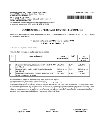 Komornik Sądowy przy Sądzie Rejonowym w Zabrzu Marcin Gołda - Kancelaria Komornicza w Zabrzu 41-800 Zabrze ul. Wolności 345 tel. 32 777 21 39, 728 559 512 konto: ING Bank Śląski SA O. w Gliwicach ul.Zwycięstwa 28 29105012981000009091004128 www.komornik-zabrze.com.pl, e-mail: [email protected] W odpowiedzi podać sygn.akt: KM Zabrze dnia 2015-11-27 r. *6015112700389* 2618/14, KM 2621/14 OBWIESZCZENIE O PIERWSZEJ LICYTACJI RUCHOMOŚCI Komornik Sądowy przy Sądzie Rejonowym w Zabrzu Marcin Gołda na podstawie art. 867 § 1 k.p.c. podaje do publicznej wiadomości, w dniu 11 stycznia 2016roku o godz. 9.00 w Zabrzu ul. Galla 1A odbędzie się licytacja ruchomości. Przedmiotem licytacji są następujące ruchomości: l.p. 1. 2. 3. opis ruchomości suma oszacowania telewizor Samsung, plazma model PS42C4301AW ok 5-letni komplet mebli stolik pod TV, szafka, komoda, ok 5-letni lodówka dwudrzwiowa Daewoo z funkcją lodu, kolor srebrny, ok 5 letnia ilość cena wywołania brutto 300,00 zł 1,00 225,00 zł 300,00 zł za całość 300,00 zł 3,00 225,00 zł za całość 225,00 zł 1,00 Ruchomości można oglądać w miejscu licytacji przed rozpoczęciem licytacji. Licytacja może zostać odwołana bez podania przyczyny. Jeżeli drzwi będą zamknięte, będą otwierane na koszt i odpowiedzialność dłużnika. Przystępujący do przetargu obowiązany jest złożyć rękojmię w wysokości 1/10 części sumy oszacowania. Rękojmię złożoną przez licytanta, któremu udzielono przybicia, zatrzymuje się; pozostałym licytantom rękojmię zwraca się niezwłocznie. Jeżeli nabywca nie wykonał w terminie warunków licytacji co do zapłaty ceny, traci rękojmię, a skutki przybicia wygasają. Z utraconej rękojmi pokrywa się koszty egzekucji związanej ze sprzedażą, a reszta wchodzi w skład sumy uzyskanej w egzekucji albo jeżeli egzekucja została umorzona jest przelewana na dochód Skarbu Państwa (art. 867 ze zn 1 K.p.c). Asesor Agnieszka Błasik Asesor Robert Łukasiak Komornik Sądowy Marcin Gołda