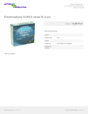 Apteka Derlatka Sp. j. Ul. Źródłowa 20, 25-335 Kielce +48 530 145 138 Prezerwatywy DUREX close fit 3 szt. Cena: 10,58 PLN Opis słownikowy Dawka - Opakowanie 3 szt. Postać - Producent LRC PRODUCTS LONDON Substancja czynna - Opis produktu Plik wygenerowano: 02-03-2017 Powered by TCPDF (www.tcpdf.org) Oprogramowanie sklepu: AptusShop