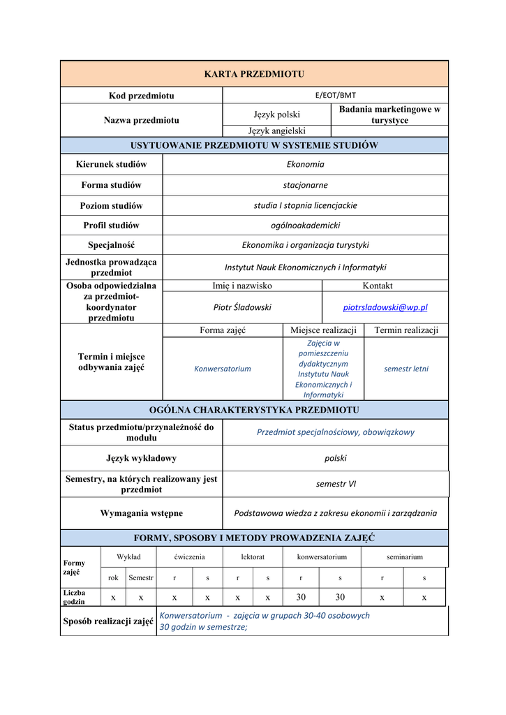 KARTA PRZEDMIOTU E/EOT/BMT Kod przedmiotu Badania marketingowe w turystyce Język polski Nazwa przedmiotu Język angielski USYTUOWANIE PRZEDMIOTU W SYSTEMIE STUDIÓW Kierunek studiów Ekonomia Forma studiów stacjonarne Poziom studiów studia I stopnia licencjackie Profil studiów ogólnoakademicki Specjalność Ekonomika i organizacja turystyki Jednostka prowadząca przedmiot Osoba odpowiedzialna za przedmiotkoordynator przedmiotu Instytut Nauk Ekonomicznych i Informatyki Imię i nazwisko Kontakt Piotr Śladowski Termin i miejsce odbywania zajęć [email protected] Forma zajęć Miejsce realizacji Termin realizacji Konwersatorium Zajęcia w pomieszczeniu dydaktycznym Instytutu Nauk Ekonomicznych i Informatyki semestr letni OGÓLNA CHARAKTERYSTYKA PRZEDMIOTU Status przedmiotu/przynależność do modułu Przedmiot specjalnościowy, obowiązkowy Język wykładowy polski Semestry, na których realizowany jest przedmiot semestr VI Wymagania wstępne Podstawowa wiedza z zakresu ekonomii i zarządzania FORMY, SPOSOBY I METODY PROWADZENIA ZAJĘĆ Formy zajęć Liczba godzin Wykład ćwiczenia lektorat konwersatorium seminarium rok Semestr r s r s r s r s x x x x x x 30 30 x x Sposób realizacji zajęć Konwersatorium - zajęcia w grupach 30-40 osobowych 30 godzin w semestrze; Sposób zaliczenia zajęć Zaliczenie z oceną 1. Wykład z prezentacją multimedialną, 2. Zadania i przykłady do rozwiązania 3. Dyskusja 4. Analiza - Studium przypadków Metody dydaktyczne Przedmioty powiązane/moduł Podstawowa Wykaz literatury brak 1. Holloway J., Christopher R.Ch.:, Marketing w turystyce, Wydawnictwo PWE, Warszawa 1997. 2. Altkorn J.: Marketing w turystyce, Wydawnictwo PWN, Warszawa 2000. 1. Uzupełnia 2. jąca Kaczmarczyk S.: Zastosowanie badao marketingowych, Wydawnictwo PWE, Warszawa 2007. G.A. Churchill, Badania marketingowe. Podstawy metodologiczne, Wydawnictwo PWN, Warszawa, 2002 CELE, TREŚCI I EFEKTY KSZTAŁCENIA Cele przedmiotu 1. Nauczyd podejmowania decyzji dotyczących marketingu na szczeblu przedsiębiorstwa turystycznego w taki sposób, aby firma mogła z powodzeniem funkcjonowad w warunkach gospodarki rynkowej. 2. Zapoznad z istotą marketingu w turystyce z punktu widzenia marketingu obszaru (terytorialnego) i marketingu przedsiębiorstw turystycznych. 3. Zapoznad z zasadami, sposobami i technikami marketingowymi, strategiami i różnymi metodami badao oraz uwarunkowaniem tych zjawisk ze szczególnym uwzględnieniem zmieniających się warunków zarówno w otoczeniu zewnętrznym, jak i wewnętrznym organizacji. Treści programowe Efekty kształcenia (kody) W01 U01 K01 Forma zajęć Temat K1 Podstawowe pojęcia oraz istota marketingu w turystyce. Badania marketingowe zagadnienia wstępne K2 Segmentacja rynku turystycznego. Pozycjonowanie na rynku turystycznym – istota i znaczenie. K3 Marketing - mix w turystyce. Klient usług turystycznych. K4 Proces badawczy – etapy. Dane wtórne rodzaje i źródła. Dane pierwotne - rodzaje i metody ich pozyskiwania. Problematyka doboru Konwersatorium próby i jej liczebności (próby reprezentacyjne i niereprezentacyjne) K5 Metody badao – ankiety, wywiady, obserwacje, metody projekcyjne. Pomiar i instrumenty pomiarowe. Zasady budowy kwestionariusza jako narzędzia badawczego. K6 Analiza i interpretacja danych oraz zasady sporządzania raportu z badao. Błędy i problemy w realizacji badao marketingowych K7 Pojęcie produktu turystycznego, innowacje produktowe w turystyce, cena i jej znaczenie, formuły kalkulacji cen, różnicowanie cen w Liczba godzin 30 turystyce. K8 Marketing bezpośredni w turystyce. K9 Promocja turystyczna obszaru i przedsiębiorstw. Rola targów turystycznych. K10 Strategie marketingowe na rynku turystycznym. Strategie marketingowe atrakcji turystycznych. Strategie przedsiębiorstw hotelarskich. Efekty kształcenia Odniesienie do efektów kształcenia Student, który zaliczył przedmiot kod w zakresie WIEDZY W01 dla kierunku Zna pojęcia, mechanizmy i techniki marketingowe w odniesieniu do różnych organizacji, ze szczególnym zwróceniem uwagi na organizacje rolnictwa i agrobiznesu. K_W16 UMIĘTNOŚCI U01 Potrafi zastosowad pojęcia marketingowe oraz rozpoznad stosowane techniki marketingowe oraz dostosowad je do zmieniających się warunków. K01 Student jest potrafi myśled i działad w sposób kreatywny i przedsiębiorczy, rozwiązując podstawowe problemy z zakresu marketingu usług turystycznych K_U20 K_U21 KOMPETENCJI K_K15 Metody oceny 1. Referat 2. Kolokwium koocowe składające się z 4 pytao i 1 zadania problemowego do rozwiązania. Maksymalna liczba pkt. 50. Czas trwania 90 minut Egzamin ustny Egzamin pisemny Projekt Efekty kształce nia (kody) Kolokwium Sprawozdanie W01 U01 K01 Referat/ prezentacja Inne W01 U01 K01 Punkty ECTS Obciążenie studenta Liczba punktów Liczba godzin ECTS Godziny kontaktowe z nauczycielem akademickim, w tym: wykłady Forma aktywności ćwiczenia 30 1,2 20 0,8 Konsultacje przedmiotowe w ramach wykładów Konsultacje przedmiotowe w ramach konwersatorium/ćwiczeń Łącznie godzin/punktów ECTS wynikających z zajęć kontaktowych z nauczycielem akademickim 50 2,0 Godziny bez udziału nauczyciela akademickiego wynikające z nakładu pracy studenta, w tym: Przygotowanie się do egzaminu + zdawanie egzaminu Przygotowanie się do kolokwium zaliczeniowego Przygotowanie się do zajęć, w tym studiowanie zalecanej literatury w ramach wykładów Przygotowanie się do zajęć, w tym studiowanie zalecanej literatury w ramach konwersatorium/ćwiczeń Przygotowanie raportu, projektu, prezentacji, dyskusji Łącznie godzin/punktów ECTS wynikających z samodzielnej pracy studenta Sumaryczna liczba godzin/punktów ECTS dla przedmiotu wynikająca z całego nakładu pracy studenta Odsetek godzin/punktów ECTS wynikających z zajęć kontaktowych z nauczycielem akademickim 15 0,6 15 20 0,6 0,8 50 2,0 100 4 50% 50%