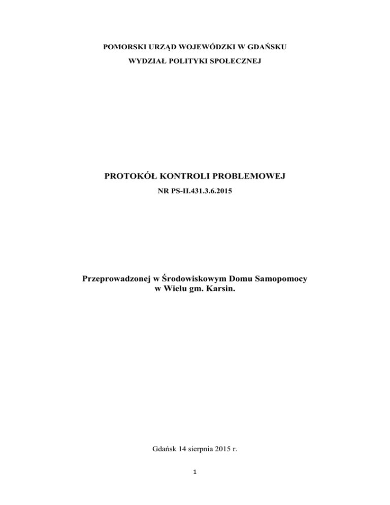 POMORSKI URZĄD WOJEWÓDZKI W GDAŃSKU WYDZIAŁ POLITYKI SPOŁECZNEJ PROTOKÓŁ KONTROLI PROBLEMOWEJ NR PS-II.431.3.6.2015 Przeprowadzonej w Środowiskowym Domu Samopomocy w Wielu gm. Karsin. Gdańsk 14 sierpnia 2015 r. 1 I. Warunki organizacji kontroli Jednostka kontrolowana; Kontrolę przeprowadzono w Środowiskowym Domu Samopomocy w Wielu gm. Karsin, który funkcjonuje jako jednostka organizacyjna Gminnego Ośrodka Pomocy Społecznej w Karsinie. Reprezentowaną przez: Kierownika GOPS Karsin: Magdalenę Jereczek p.o. Koordynatora ŚDS : Annę Datta Jednostka kontrolująca: Kontrolę prowadził Zespół Inspektorów Wydziału Polityki Społecznej Pomorskiego Urzędu Wojewódzkiego w Gdańsku w składzie: - Ewa Szczypior – starszy inspektor wojewódzki - kierująca zespołem inspektorów upoważnienie Nr 219/2015 z dnia 4 sierpnia 2015 r. - Małgorzata Szady – starszy inspektor wojewódzki – upoważnienie Nr 220/2015 z dnia 4 sierpnia 2015 r. Termin kontroli: Kontrolę przeprowadzono w dniu 14 sierpnia 2015 r. Okres podlegający kontroli: realizacja zadań merytorycznych ŚDS w roku 2014. Podstawy prawne przeprowadzonej kontroli: art.28 ust.1 ustawy z dnia 23 stycznia 2009 r. o wojewodzie i administracji rządowej w województwie (Dz. U. Nr 31 poz. 206 z późn. zm.), art.126 i art.127 ustawy z dnia 12 marca 2004 r. o pomocy społecznej (Dz. U. z 2013 poz. 182 z późn zm. ), Rozporządzenia Ministra Polityki Społecznej z dnia 23 marca 2005 r. w sprawie nadzoru i kontroli w pomocy społecznej (Dz. U. Nr 61 poz. 543 z późn. zm. ), Rozporządzenie Ministra Pracy i Polityki Społecznej z dnia 9 grudnia 2010 r. w sprawie środowiskowych domów samopomocy (Dz. U. Nr 238 poz. 1586). art.1, art. 9 ustawy z dnia 19 sierpnia 1994r. o ochronie zdrowia psychicznego (Dz. U. z 2011 r. Nr 231, poz. 1375 z późn. zm.) Zakres kontroli problemowej: Ocena merytoryczna działań w zakresie realizacji zadań umożliwiających wsparcie osób z zaburzeniami psychicznymi, służących poprawie jakości życia uczestników, rodzaj i zakres usług świadczonych w Środowiskowym Domu Samopomocy w Wielu (określanego dalej jako ŚDS) oraz realizacja standardów zawartych w Rozporządzeniu Ministra Pracy i Polityki Społecznej z dnia 9 grudnia 2010 r. w sprawie środowiskowych domów samopomocy. W trakcie czynności kontrolnych analizie poddane zostały następujące zagadnienia: dokumenty formalne, dotyczące funkcjonowania ŚDS (Uchwała Rady Gminy dotycząca utworzenia ŚDS w Wielu, Uchwała Rady Gminy dotycząca zmiany statutu GOPS Karsin, statut i regulamin ŚDS, program, plan pracy), liczba osób przebywających w ŚDS w 2014 roku, formy działań terapeutycznych i innych usług skierowanych na rzecz uczestników ŚDS, współpraca z rodzinami, instytucjami w środowisku lokalnym w celu integracji społecznej uczestników ŚDS, przygotowanie merytoryczne zatrudnionych pracowników ŚDS, 2 przebieg i efekty oddziaływań terapeutycznych wobec uczestników ŚDS, stan bazy technicznej i wyposażenia budynku ŚDS w odniesieniu do obowiązujących standardów. Osoby udzielające wyjaśnień: Kierownik GOPS Karsin: Magdalena Jereczek p.o. Koordynatora ŚDS : Anna Datta Przed przystąpieniem do czynności kontrolnych dokonano wpisu do zeszytu kontroli Gminnego Ośrodka Pomocy Społecznej w Karsinie oraz poinformowano kierownika o prawie odmowy podpisania protokołu i obowiązku złożenia na piśmie do dyrektora Wydziału Polityki Społecznej Pomorskiego Urzędu Wojewódzkiego w Gdańsku w terminie 7 dni od dnia otrzymania protokołu, wyjaśnień przyczyn tej odmowy oraz umotywowanych zastrzeżeń, dotyczących ustaleń zwartych w protokole. W przypadku zgłoszenia zastrzeżeń do protokołu, o których mowa powyżej, termin odmowy podpisania protokołu wraz z podaniem jej przyczyn biegnie od dnia doręczenia stanowiska dyrektora Wydziału Polityki Społecznej Urzędu Wojewódzkiego w Gdańsku wobec zastrzeżeń. Odmowa podpisania protokołu kontroli nie stanowi przeszkody do podpisania protokołu przez zespół inspektorów i sporządzenia zaleceń pokontrolnych (§ 16 Rozporządzenia Ministra Polityki Społecznej z dnia 23 marca 2005r w sprawie nadzoru i kontroli w pomocy społecznej (Dz. U. z 2005 r. Nr 61 poz. 543 z późn. zm.). II. Podstawa do ustaleń kontroli: Ustaleń do protokołu dokonano na podstawie: oględzin bazy technicznej, lokalowej i kadrowej ŚDS w Wielu, jako miejsca realizacji zadania (czy gwarantuje niezbędną jakość usług), wyjaśnień udzielonych przez Kierownika GOPS oraz p.o. Koordynatora ŚDS, wglądu w dokumenty merytoryczne, dotyczące realizowanych zadań (Uchwały Rady Gminy dotyczące utworzenia i funkcjonowania ŚDS Wiele, statut, regulamin, plan i program działalności ŚDS, procedury postępowania w ŚDS, dokumentacja indywidualna i zbiorowa uczestników, dokumenty dotyczące kwalifikacji pracowników). III. Ustalenia kontrolne: Środowiskowy Dom Samopomocy (ŚDS) w Wielu funkcjonuje od 2010 r. i jest placówką wsparcia dziennego typu A i B. Decyzja o jego utworzeniu podjęta została Uchwałą Nr XXX/197/09 Rady Gminy w Karsinie z dnia 26 listopada 2009 r. (Załącznik Nr 1). Zgodnie z zapisem ww. uchwały jak i zmian wprowadzonych w Statucie Gminnego Ośrodka Pomocy Społecznej (GOPS) w Karsinie Uchwałą Nr I/5/10 Rady Gminy Karsin z dnia 30 listopada 2010 r. (Załącznik Nr 2) - ŚDS wchodzi w skład GOPS jako jednostka organizacyjna pomocy społecznej. Zasady funkcjonowania placówki określone zostały w Statucie ŚDS wprowadzonym Uchwałą Nr XV/105/12 Rady Gminy Karsin z dnia 26 stycznia 2012 r. (załącznik nr 3). Szczegółowe zadania ŚDS określa zatwierdzony przez Kierownika Ośrodka Pomocy Społecznej w Karsinie z Regulamin Organizacyjny Środowiskowego Domu Samopomocy w Wielu (załącznik nr 4). Merytorycznymi podstawami działalności ŚDS są: program działalności, zawierający osobne części dla placówki typu A i B (Załącznik Nr 5 - rok 2014