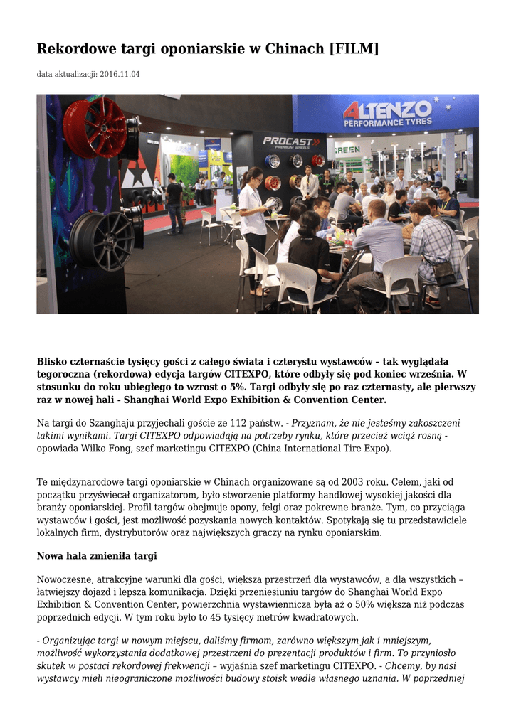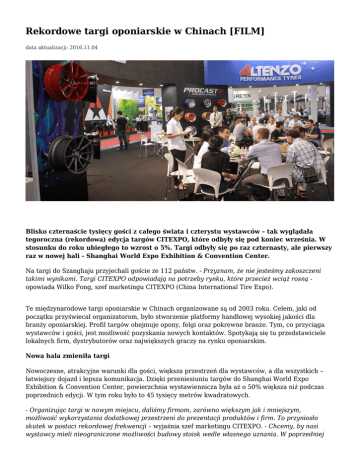 Rekordowe targi oponiarskie w Chinach [FILM] data aktualizacji: 2016.11.04 Blisko czternaście tysięcy gości z całego świata i czterystu wystawców – tak wyglądała tegoroczna (rekordowa) edycja targów CITEXPO, które odbyły się pod koniec września. W stosunku do roku ubiegłego to wzrost o 5%. Targi odbyły się po raz czternasty, ale pierwszy raz w nowej hali - Shanghai World Expo Exhibition & Convention Center. Na targi do Szanghaju przyjechali goście ze 112 państw. - Przyznam, że nie jesteśmy zakoszczeni takimi wynikami. Targi CITEXPO odpowiadają na potrzeby rynku, które przecież wciąż rosną opowiada Wilko Fong, szef marketingu CITEXPO (China International Tire Expo). Te międzynarodowe targi oponiarskie w Chinach organizowane są od 2003 roku. Celem, jaki od początku przyświecał organizatorom, było stworzenie platformy handlowej wysokiej jakości dla branży oponiarskiej. Profil targów obejmuje opony, felgi oraz pokrewne branże. Tym, co przyciąga wystawców i gości, jest możliwość pozyskania nowych kontaktów. Spotykają się tu przedstawiciele lokalnych firm, dystrybutorów oraz największych graczy na rynku oponiarskim. Nowa hala zmieniła targi Nowoczesne, atrakcyjne warunki dla gości, większa przestrzeń dla wystawców, a dla wszystkich – łatwiejszy dojazd i lepsza komunikacja. Dzięki przeniesiuniu targów do Shanghai World Expo Exhibition & Convention Center, powierzchnia wystawiennicza była aż o 50% większa niż podczas poprzednich edycji. W tym roku było to 45 tysięcy metrów kwadratowych. - Organizując targi w nowym miejscu, daliśmy firmom, zarówno większym jak i mniejszym, możliwość wykorzystania dodatkowej przestrzeni do prezentacji produktów i firm. To przyniosło skutek w postaci rekordowej frekwencji – wyjaśnia szef marketingu CITEXPO. - Chcemy, by nasi wystawcy mieli nieograniczone możliwości budowy stoisk wedle własnego uznania. W poprzedniej lokalizacji nie zawsze było to możliwe. Nawet wielkie firmy miały z tym problemy techniczne (przeszkadzały np. schody). W nowym centrum wszyscy wystawcy są ulokowani na dwóch poteżnych halach, dlatego możemy zaoferować bardzo dobre rozwiązania nawet dla największych firm - dodaje Fong. Najbardziej międzynarodowe wydarzenie branżowe w Chinach CITEXPO zyskuje reputację najbardziej międzynarodowego wydarzenia poświęconego branży oponiarskiej w Chinach. - Przed tegoroczną edycją komitet organizacyjny targów podróżował po całym świecie zachęcając lokalny biznes do udziału w targach.Odwiedzililiśmy Tajwan, Japonię, Koreę, Singapur, Dubaj i Niemcy w tym roku, aby poinformować o naszym wydarzeniu i zebrać informację z tamtejszych rynków – mówi Cyrus Cheung, assistant project manager CITEXPO. - Naszym priorytetem jest stworzenie platformy handlowej najwyższej jakości zarówno dla wystawców jak i gości targów. Chcemy przyciągać najlepszych ekspertów z całego świata, dać świetne warunki i dobrą atmosferę. Czekamy też na poprawę relacji transgranicznych. Liczymy na więcej takich inicjatyw jak np. Belt and Road Initiative (inicjatywa władz chińskich polegająca na rozbudowie sieci infrastruktury łączącej Chiny z innymi krajami Azji oraz krajami europejskimi przyp. red.) - dodaje Wilko Fong. Na targach, co wyraźnie pokazała miniona edycja, rośnie liczba gości z Azji Południowo-Wschodniej i Wschodniej, Bliskiego Wschodu i Afryki. Z czternastu tysięcy gości blisko połowa to byli przyjezdni zza granicy. - Będziemy wciąż promować targi w różnych częściach świata. Zrobimy wszystko co w naszej mocy, aby przyciągnąć na CITEXPO jak największą liczbę profesjonalistów z naszej branży, oferować najlepsze możliwe warunki do spotkań oraz współpracy biznesowej – kończy szef marketingu targów CITEXPO. Piętnasta edycja CITEXPO odbędzie się w tym w tym samym miejscu, w dniach 25-27 września. Po więcej informacji organizatorzy targów zapraszają na stronę www.citexpo.com.cn Źródło: