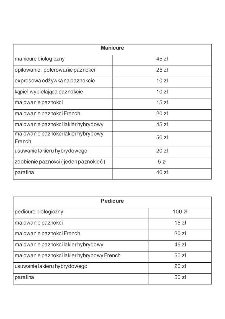 Manicure manicure biologiczny 45 zł opiłowanie i polerowanie paznokci 25 zł expresowa odżywka na paznokcie 10 zł kąpiel wybielająca paznokcie 10 zł malowanie paznokci 15 zł malowanie paznokci French 20 zł malowanie paznokci lakier hybrydowy 45 zł malowanie paznokci lakier hybrybowy French 50 zł usuwanie lakieru hybrydowego 20 zł zdobienie paznokci ( jeden paznokieć ) parafina 5 zł 40 zł Pedicure pedicure biologiczny 100 zł malowanie paznokci 15 zł malowanie paznokci French 20 zł malowanie paznokci lakier hybrydowy 45 zł malowanie paznokci lakier hybrybowy French 50 zł usuwanie lakieru hybrydowego 20 zł parafina 50 zł