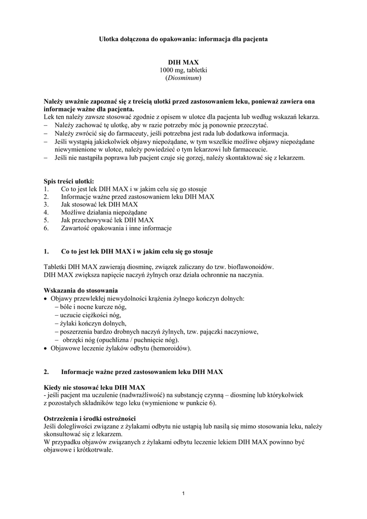 Ulotka dołączona do opakowania: informacja dla pacjenta DIH MAX 1000 mg, tabletki (Diosminum) Należy uważnie zapoznać się z treścią ulotki przed zastosowaniem leku, ponieważ zawiera ona informacje ważne dla pacjenta. Lek ten należy zawsze stosować zgodnie z opisem w ulotce dla pacjenta lub według wskazań lekarza. Należy zachować tę ulotkę, aby w razie potrzeby móc ją ponownie przeczytać. Należy zwrócić się do farmaceuty, jeśli potrzebna jest rada lub dodatkowa informacja. Jeśli wystąpią jakiekolwiek objawy niepożądane, w tym wszelkie możliwe objawy niepożądane niewymienione w ulotce, należy powiedzieć o tym lekarzowi lub farmaceucie. Jeśli nie nastąpiła poprawa lub pacjent czuje się gorzej, należy skontaktować się z lekarzem. Spis treści ulotki: 1. Co to jest lek DIH MAX i w jakim celu się go stosuje 2. Informacje ważne przed zastosowaniem leku DIH MAX 3. Jak stosować lek DIH MAX 4. Możliwe działania niepożądane 5. Jak przechowywać lek DIH MAX 6. Zawartość opakowania i inne informacje 1. Co to jest lek DIH MAX i w jakim celu się go stosuje Tabletki DIH MAX zawierają diosminę, związek zaliczany do tzw. bioflawonoidów. DIH MAX zwiększa napięcie naczyń żylnych oraz działa ochronnie na naczynia. Wskazania do stosowania Objawy przewlekłej niewydolności krążenia żylnego kończyn dolnych: bóle i nocne kurcze nóg, uczucie ciężkości nóg, żylaki kończyn dolnych, poszerzenia bardzo drobnych naczyń żylnych, tzw. pajączki naczyniowe, obrzęki nóg (opuchlizna / puchnięcie nóg). Objawowe leczenie żylaków odbytu (hemoroidów). 2. Informacje ważne przed zastosowaniem leku DIH MAX Kiedy nie stosować leku DIH MAX - jeśli pacjent ma uczulenie (nadwrażliwość) na substancję czynną – diosminę lub którykolwiek z pozostałych składników tego leku (wymienione w punkcie 6). Ostrzeżenia i środki ostrożności Jeśli dolegliwości związane z żylakami odbytu nie ustąpią lub nasilą się mimo stosowania leku, należy skonsultować się z lekarzem. W przypadku objawów związanych z żylakami odbytu leczenie lekiem DIH MAX powinno być objawowe i krótkotrwałe. 1 Inne leki i DIH MAX Należy powiedzieć lekarzowi o wszystkich lekach przyjmowanych obecnie lub ostatnio a także o lekach, które pacjent planuje przyjmować. Nie przeprowadzono badań dotyczących interakcji. DIH MAX z jedzeniem i piciem O ile lekarz nie zaleci inaczej, lek podaje się podczas posiłku. Ciąża i karmienie piersią W ciąży i w okresie karmienia piersią lub gdy istnieje podejrzenie, że kobieta jest w ciąży, lub gdy planuje ciążę, przed zastosowaniem tego leku należy poradzić się lekarza. Z uwagi na brak wystarczających danych, lek DIH MAX może być stosowany w czasie ciąży wyłącznie w przypadku zdecydowanej konieczności. Nie wiadomo, czy lek przenika do mleka kobiet karmiących, dlatego zaleca się unikanie karmienia piersią w okresie jego przyjmowania. Prowadzenie pojazdów i obsługiwanie maszyn Przyjmowanie leku DIH MAX nie ma wpływu na zdolność prowadzenia pojazdów i obsługiwania maszyn. 3. Jak stosować lek DIH MAX Ten lek należy zawsze stosować zgodnie z opisem w ulotce dla pacjenta lub według wskazań lekarza. W razie wątpliwości należy zwrócić się do lekarza lub farmaceuty. Podanie doustne. Zazwyczaj stosowana dawka leku to 1 tabletka na dobę podczas posiłku. Jedynie w przypadkach zaostrzenia dolegliwości spowodowanych żylakami odbytu zaleca się okresowe podawanie większych dawek: po 1 tabletce 3 razy na dobę przez 4 dni, a przez kolejne 3 dni po 1 tabletce 2 razy na dobę, rano i wieczorem. Jeśli dolegliwości związane z żylakami odbytu nie ustąpią lub nasilą się mimo stosowania leku, należy skonsultować się z lekarzem. Zastosowanie większej niż zalecana dawki leku DIH MAX W razie przyjęcia znacznie większej niż zalecana dawki leku, należy zwrócić się do lekarza lub farmaceuty. Nie są znane objawy przedawkowania. Pominięcie zastosowania leku DIH MAX Nie należy stosować dawki podwójnej w celu uzupełnienia pominiętej dawki. Przerwanie stosowania leku DIH MAX W razie jakichkolwiek dalszych wątpliwości związanych ze stosowaniem tego leku należy zwrócić się do lekarza lub farmaceuty. 4. Możliwe działania niepożądane Jak każdy lek, lek ten może powodować działania niepożądane, chociaż nie u każdego one wystąpią. Rzadko (występują u 1 do 10 pacjentów na 10 000): niestrawność, nudności, wymioty, zawroty głowy, ból głowy, złe samopoczucie oraz wysypka, świąd, pokrzywka. 2 W przypadku łagodnych działań niepożądanych dotyczących żołądka i jelit oraz zaburzeń neurowegetatywnych (bezsenność, trudności w zasypianiu, zawroty i bóle głowy, niepokój) nie jest wymagane odstawienie leku. Jeśli wystąpią jakiekolwiek objawy niepożądane, w tym wszelkie możliwe objawy niepożądane niewymienione w ulotce, należy zwrócić się do lekarza lub farmaceuty. 5. Jak przechowywać lek DIH MAX Przechowywać w oryginalnym opakowaniu, w temperaturze poniżej 25°C. Lek należy przechowywać w miejscu niewidocznym i niedostępnym dla dzieci. Nie stosować tego leku, po upływie terminu ważności zamieszczonego na opakowaniu. Termin ważności oznacza ostatni dzień danego miesiąca. Leków nie należy wyrzucać do kanalizacji ani domowych pojemników na odpadki. Należy zapytać farmaceutę, jak usunąć leki, których się już nie używa. Takie postępowanie pomoże chronić środowisko. 6. Zawartość opakowania i inne informacje Co zawiera lek DIH MAX Substancją czynną leku jest zmikronizowana diosmina w ilości 1000 mg w tabletce. Pozostałe substancje pomocnicze to: alkohol poliwinylowy 4-88, kroskarmeloza sodowa i magnezu stearynian. Jak wygląda lek DIH MAX i co zawiera opakowanie Lek DIH MAX są to tabletki owalne, beżowe, obustronnie wypukłe, o gładkiej powierzchni, bezwonne. Jedno opakowanie zawiera 30 lub 60 tabletek w tektu