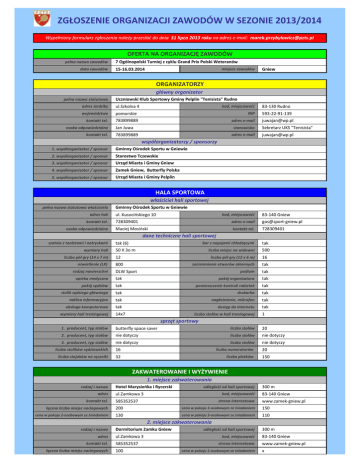 ZGŁOSZENIE ORGANIZACJI ZAWODÓW W SEZONIE 2013/2014 Wypełniony formularz zgłoszenia należy przesłać do dnia 31 lipca 2013 roku na adres e-mail: [email protected] OFERTA NA ORGANIZACJĘ ZAWODÓW pełna nazwa zawodów data zawodów 7 Ogólnopolski Turniej z cyklu Grand Prix Polski Weteranów 15-16.03.2014 miejsce zawodów Gniew ORGANIZATORZY główny organizator pełna nazwa statutowa Uczniowski Klub Sportowy Gminy Pelplin "Tenisista" Rudno adres siedziby ul.Szkolna 4 województwo pomorskie NIP kontakt tel. 783899889 adres e-mail osoba odpowiedzialna kontakt tel. kod, miejscowość Jan Juwa stanowisko 783899889 adres e-mail 83-130 Rudno 593-22-91-139 [email protected] Sekretarz UKS "Tenisista" [email protected] współorganizatorzy / sponsorzy 1. współorganizator / sponsor Gminny Ośrodek Sportu w Gniewie 2. współorganizator / sponsor Starostwo Tczewskie 3. współorganizator / sponsor Urząd Miasta i Gminy Gniew 4. współorganizator / sponsor Zamek Gniew, Butterfly Polska 5. współorganizator / sponsor Urząd Miasta i Gminy Pelplin HALA SPORTOWA właściciel hali sportowej pełna nazwa statutowa właściciela adres hali kontakt tel. osoba odpowiedzialna Gminny Ośrodek Sportu w Gniewie ul. Kusocińskiego 10 kod, miejscowość 728309401 Maciej Mosiński 83-140 Gniew adres e-mail [email protected] kontakt tel. 728309401 dane techniczne hali sportowej szatnie z toaletami i natryskami wymiary hali liczba pół gry (14 x 7 m) oświetlenie (LX) rodzaj nawierzchni tak (6) bar z napojami chłodzącymi tak liczba miejsc na widowni 500 liczba pół gry (12 x 6 m) 16 zaciemnienie otworów okiennych tak podium tak 50 X 3o m 12 800 DLW Sport opieka medyczna tak pokój organizatora tak pokój sędziów tak pomieszczenie kontroli rakietek tak stolik sędziego głównego tak drukarka tak tablica informacyjna tak nagłośnienie, mikrofon tak obsługa komputerowa tak dostęp do internetu tak wymiary hali treningowej 14x7 liczba stołów w hali treningowej 1 sprzęt sportowy 1. producent, typ stołów butterfly space saver liczba stołów 20 2. producent, typ stołów nie dotyczy liczba stołów nie dotyczy 3. producent, typ stołów nie dotyczy liczba stołów nie dotyczy liczba stolików sędziowskich 16 liczba numeratorów liczba stojaków na ręczniki 32 liczba płotków 20 150 ZAKWATEROWANIE I WYŻYWIENIE 1. miejsce zakwaterowania rodzaj i nazwa adres kontakt tel. Hotel Marysieńka i Rycerski odległość od hali sportowej ul.Zamkowa 3 kod, miejscowość 585352537 strona internetowa 300 m 83-140 Gniew www.zamek-gniew.pl łączna liczba miejsc noclegowych 200 cena w pokoju 1-osobowym ze śniadaniem 150 cena w pokoju 2-osobowym ze śniadaniem 130 cena w pokoju 3-osobowym ze śniadaniem 110 2. miejsce zakwaterowania rodzaj i nazwa adres kontakt tel. łączna liczba miejsc noclegowych Dormitorium Zamku Gniew ul.Zamkowa 3 585352537 100 odległość od hali sportowej kod, miejscowość strona internetowa cena w pokoju 1-osobowym ze śniadaniem 300 m 83-140 Gniew www.zamek-gniew.pl x cena w pokoju 2-osobowym ze śniadaniem x 4+ , 60 cena w pokoju 3-osobowym ze śniadaniem 3. miejsce zakwaterowania rodzaj i nazwa adres kontakt tel. Hotel Na Wzgórzu + 3 rezerwa 60 cena w pokoju 2-osobowym ze śniadaniem 70 83-140 Gniew kod, miejscowość 585352445 łączna liczba miejsc noclegowych 2 km odległość od hali sportowej ul.Krasickiego 10 www.hotel-nawzgórzu.pl strona internetowa cena w pokoju 1-osobowym ze śniadaniem 80 cena w pokoju 3-osobowym ze śniadaniem 60 ceny wyżywienia cena obiadu 20 12 cena kolacji NAGRODY suma nagród finansowych (seniorzy) x puchary (i medale) dla 4 najlepszych tak 10000 suma nagród rzeczowych tak dyplomy dla 4 najlepszych INFORMACJE DODATKOWE Komitet Organizacyjny działania promocyjne materiały prasowe ceremonia otwarcia imprezy towarzyszące ceremonia otwarcia sprawozdanie z zawodów dokumentacja fotograficzna tak tak tak tak tak tak tak tak OSOBY UPOWAŻNIONIONE DO REPREZENTOWANIA ORGANIZATORA NAZWISKO imię Juwa Jan Mosiński Maciej funkcja Sekretarz UKS "Tenisista" Dyrektor GOS Gniew kontakt tel. adres e-mail 783899889 [email protected] 728309401 [email protected] Oświadczamy, że w przypadku przyznania nam organizacji zawodów, podejmiemy z należytą starannością wszelkie działania w celu zorganizowania zawodów zgodnie z umową podpisaną z Polskim Związkiem Tenisa Stołowego. UWAGI PZTS data wpłynięcia zgłoszenia 2013.07.27