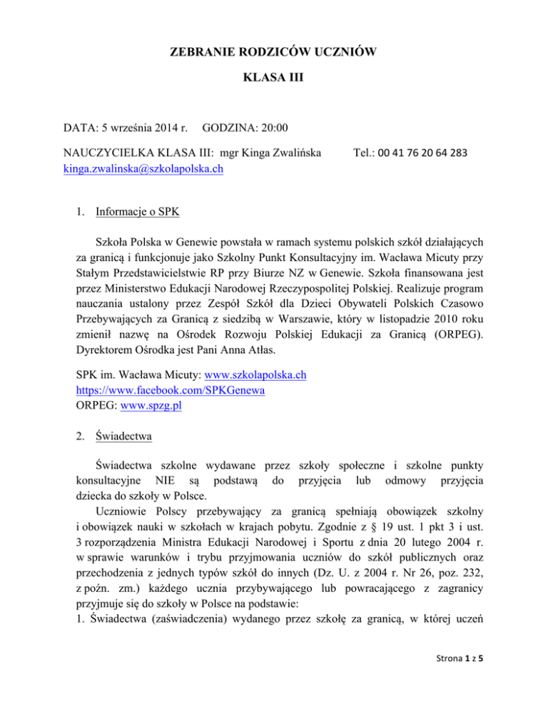 ZEBRANIE RODZICÓW UCZNIÓW KLASA III DATA: 5 września 2014 r. GODZINA: 20:00 NAUCZYCIELKA KLASA III: mgr Kinga Zwalińska [email protected] Tel.: 00 41 76 20 64 283 1. Informacje o SPK Szkoła Polska w Genewie powstała w ramach systemu polskich szkół działających za granicą i funkcjonuje jako Szkolny Punkt Konsultacyjny im. Wacława Micuty przy Stałym Przedstawicielstwie RP przy Biurze NZ w Genewie. Szkoła finansowana jest przez Ministerstwo Edukacji Narodowej Rzeczypospolitej Polskiej. Realizuje program nauczania ustalony przez Zespół Szkół dla Dzieci Obywateli Polskich Czasowo Przebywających za Granicą z siedzibą w Warszawie, który w listopadzie 2010 roku zmienił nazwę na Ośrodek Rozwoju Polskiej Edukacji za Granicą (ORPEG). Dyrektorem Ośrodka jest Pani Anna Atłas. SPK im. Wacława Micuty: www.szkolapolska.ch https://www.facebook.com/SPKGenewa ORPEG: www.spzg.pl 2. Świadectwa Świadectwa szkolne wydawane przez szkoły społeczne i szkolne punkty konsultacyjne NIE są podstawą do przyjęcia lub odmowy przyjęcia dziecka do szkoły w Polsce. Uczniowie Polscy przebywający za granicą spełniają obowiązek szkolny i obowiązek nauki w szkołach w krajach pobytu. Zgodnie z § 19 ust. 1 pkt 3 i ust. 3 rozporządzenia Ministra Edukacji Narodowej i Sportu z dnia 20 lutego 2004 r. w sprawie warunków i trybu przyjmowania uczniów do szkół publicznych oraz przechodzenia z jednych typów szkół do innych (Dz. U. z 2004 r. Nr 26, poz. 232, z poźn. zm.) każdego ucznia przybywającego lub powracającego z zagranicy przyjmuje się do szkoły w Polsce na podstawie: 1. Świadectwa (zaświadczenia) wydanego przez szkołę za granicą, w której uczeń Strona 1 z 5 realizował obowiązek szkolny oraz ew. ostatniego świadectwa wydanego w Polsce, 2. Sumy lat nauki szkolnej ucznia. 3. Strona SPK Na stronie SPK są systematycznie zamieszczane ogłoszenia oraz informacje dotyczące szkoły: www.szkolapolska.ch 4. Kwestionariusz osobowy Bardzo proszę o wypełnienie kwestionariusza osobowego, który jest dostępny na stronie SPK. 5. Ubezpieczenia OC Przypominam o konieczności dostarczenia formularza OC i kopii ubezpieczenia. Informuję, iż za wszelkie szkody wyrządzone przez ucznia odpowiedzialność materialna ponoszą rodzice. Proszę o zapoznanie się z regulaminem BHP. 6. Legitymacja szkolna Do 25 września br. można przynieść legitymację do podbicia na rok szkolny 2014/2015. Osoby, które chcą wyrobić po raz pierwszy legitymację dla swojego dziecka, proszę o wypełnienie wniosku i dołączenie podpisanego zdjęcia o wymiarach 30 mm x 42 mm. 7. Terminarz 2014 / 2015 · Jeûne genevois - czwartek 11 września 2014 r. (zajęcia odrabiamy 10 września 2014r.) · Jesienne wakacje – od wtorku 21 października do piątku 31 października 2014r. · Święta Bożego Narodzenia – od poniedziałku 22 grudnia 2014r. do piątku 2 stycznia 2015r. · Ferie zimowe – od poniedziałku 9 lutego do piątku 13 lutego 2015r. · Ferie w szkole szwajcarskiej - czwartek 2 kwietnia 2015r. (zajęcia będą odrabiane) · Święta Wielkanocne –od poniedziałku 6 kwietnia 2015r.do piątku 17 kwietnia 2015r. · Ascension - czwartek 14 maja 2014r. (zajęcia będą odrabiane) Strona 2 z 5 · Piknik na zakończenie roku szkolnego - 21 czerwca 2015 r., jeżeli będzie brzydka pogoda spotykamy się 28 czerwca 2015r. · Zakończenie Roku – wtorek 23 czerwca 2015r. (klasy I-III), czwartek 25 czerwca 2015r. (klasy IV-V), środa 24 czerwca 2015r. (klasa VI i grupa gimnazjalna) - Uwaga! Może nastąpić zmiana. 8. Podręczniki i przybory szkolne Proszę, aby dzieci przynosiły do szkoły podręczniki, karty pracy i zeszyt. Uczniowie będą korzystać z podręcznika „Wesoła szkoła i przyjaciele”. Podręcznik składa się z pięciu części. Nauczyciel będzie informował, którą część należy przynosić. Uczeń ma mieć na zajęciach szkolnych piórnik z następującymi przyborami: 2 ołówki, temperówka, gumka, kredki, nożyczki, klej. 9. Wykaz lektur Teksty do przeczytania w domu 1) 2) 3) 4) 5) 6) 7) Jan Brzechwa „Akademia Pana Kleksa” Anna Onichimowska „Duch starej kamienicy” Mira Jaworczakowa „Oto jest Kasia” Roman Pisarski „O psie, który jeździł koleją” Anna Onichimowska „Najwyższa góra świata” Czesław Centkiewicz „Anaruk, chłopiec z Grenlandii” Grzegorz Kasdepke, Mira Stanisławska – Meysztowicz „Przyjeciele” fragmenty 8) Wybrana przez ucznia książka ze zbioru bibliotecznego SPK Teksty, które będą czytane w szkole 1) 2) 3) 4) 5) 6) 7) 8) 9) Barbara Tylicka „Polskie miasta w baśni i legendzie” - wybrane Jan Brzechwa „Brzechwa dzieciom” – wybrane Maria Kownacka „Kajtkowe przygody” – fragmenty Jan Twardowski „Patyki i patyczki” – wybrane Wanda Chotomska „O dwunastu Miesiącach” (w: U złotego źródła. Baśnie polskie, S. Wortman) Paweł Beręsewicz „Warszawa - Spacery z Ciumkami” – wybrane Natalia Usenko, Danuta Wawiłow „Wierzbowa 13” – fragmenty Grzegorz Kasdepke „Mam prawo” - wybrane Janusz Christa „Kajko i Kokosz” - wybrane Strona 3 z 5 17 września zaczniemy omawianie lektury „Akademia Pana Kleksa”. Następną lektura, którą należy czytać w domu to „Duch starej kamienicy”. Będziemy ją omawiać po przerwie jesiennej. 10. Biblioteka i kiermasz Książki można wypożyczać drogą elektroniczną lub bezpośrednio w bibliotece. Zamówienia na książki można składać drogą elektroniczną na adres: [email protected] Dostępność poszukiwanej pozycji można sprawdzić na stronie http://www.szkolapolska.ch/backup/biblioteka/opac/ Zamówione lektury są zabierane z biblioteki w każdy poniedziałek i przekazywane nauczycielowi. W zależności od daty zamówienia, pozycja zostanie dostarczona w ciągu - najwyżej - dwóch tygodni. Książki można również wypożyczyć bezpośrednio w bibliotece. Uczniowie mogą wchodzić do biblioteki w godzinach dyżurowania bibliotekark