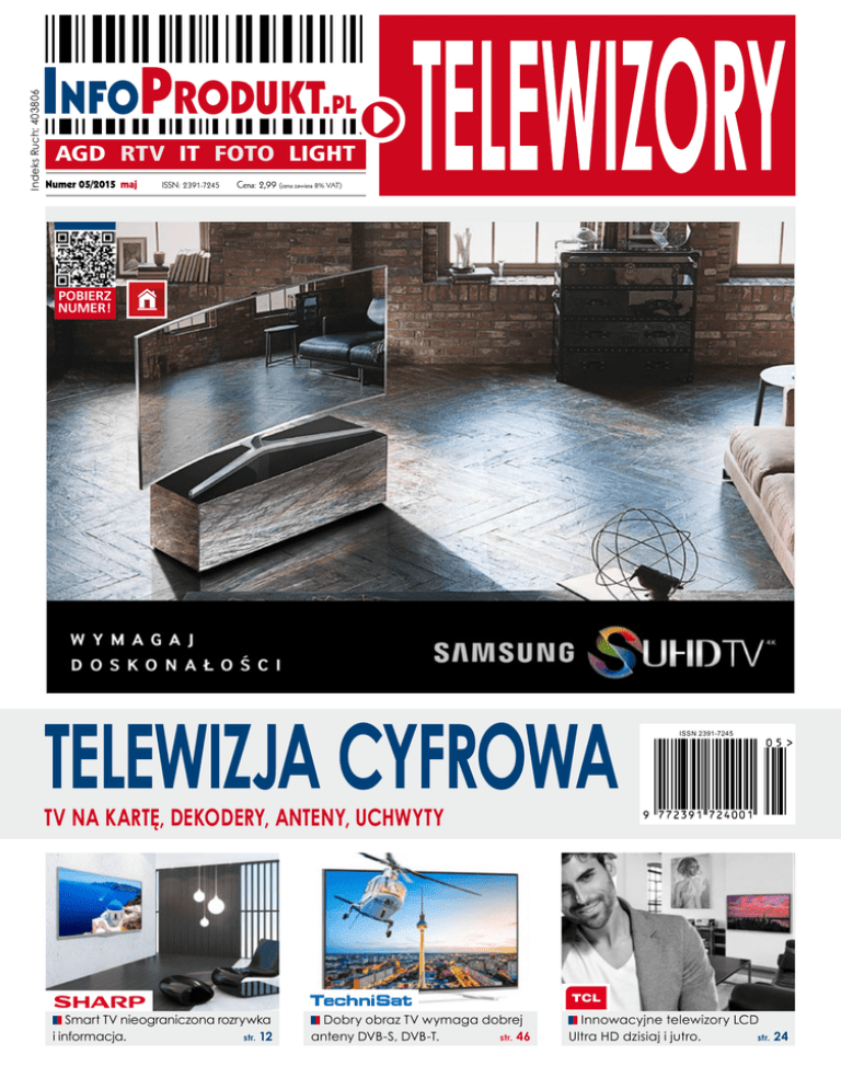 Indeks Ruch: 403806 Infoprodukt. pl AGD RTV IT FOTO LIGHT Numer 05/2015 maj ISSN: 2391-7245 Cena: 2,99 (cena zawiera 8% VAT) Pobierz numer! Telewizja cyfrowa ISSN 2391-7245 TV NA KARTĘ, DEKODERY, ANTENY, uchwyty Smart TV nieograniczona rozrywka i informacja. str. 12 Dobry obraz TV wymaga dobrej anteny DVB-S, DVB-T. str. 46 Innowacyjne telewizory LCD Ultra HD dzisiaj i jutro. str. 24 Roboty sprzątające od redakcji... Telewizja cyfrowa rozwija się coraz szybciej Telewizor pozostaje nadal głównym urządzeniem do oglądania telewizji dla całej rodziny. W tym numerze „InfoProduktu” poświęciliśmy dużo miejsca jego budowie, funkcjom, parametrom oraz akcesoriom. Zwracamy uwagę na rozwój telewizji w aspekcie telewizji Ultra HD, która jest motorem rozwoju telewizji na świecie na najbliższe lata. Pokazujemy zmiany w konstrukcji wyświetlaczy Ultra HD. W planach ich rozwoju do 2020 r. obraz ma osiągnąć „doskonałość”. Wyjaśniamy, czym są nanokryształy i kropka kwantowa, które mają zrewolucjonizować jakość kolorów obrazu. Niestety, pierwsze wyświetlacze z nanokryształami nie mogą pokazać wszystkich swoich możliwości. Za fascynującym rozwojem zmian konstrukcyjnych Roboty sprzątające w telewizorach nie nadążają producenci treści wideo. Brak jest treści 4K, a do tego realizowanych kamerami wideo zapewniającymi parametry jasności, kontrastu, szybkości zapisu wymagane dla materiałów 4K wchodzących na rynek nowej generacji wyświetlaczy LCD Ultra HD, określanych marketingowo jako SUHD TV. Uważamy, że dla przeciętnego użytkownika telewizorów, który chce korzystać z wielu źródeł treści wideo, w tym Internetu, bardzo ważne są sposób zarządzania nimi, szybkość dostępu do poszczególnych aplikacji, grafika menu. Najlepiej już w sklepie sprawdzić, czy szybko znajdziemy potrzebne treści, jak szybko działają gry, wyszukiwarki treści. Tizen, WebOS, Android TV to najnowsze platformy w telewizorach czołowych producentów, które opisujemy i pokazujemy między nimi różnice. Duże znacznie ma także estetyka telewizora. Dobrze przyjęte przez klientów zostały zakrzywione ekrany. Wyjaśniamy, czy to tylko moda czy konkretne korzyści związane z jakością obrazu. Zwracamy uwagę na uchwyty do telewizorów, które ułatwiają umieszczenie telewizora w optymalnym miejscu i poprawiają aranżację pokoju, i ich dobór. Doradzamy, jaką dobrać antenę naziemną i satelitarną, które decydują o jakości odbioru najpopularniejszych źródeł telewizji. Wyjaśniamy, co zrobić, gdy pojawią się zakłócenia w obrazie z anteny DVB-T spowodowane nadajnikami LTE. To tylko niewielki zarys problemów związanych z telewizorami i telewizją, które wyjaśniamy w naszym poradniku. Jerzy Justat [email protected] 2 (a jeszcze do niedawna niezgodność towaru z umową) W odniesieniu do aspektów prawnych na rynku bardzo często używane są niezrozumiałe określenia, nazwy czy definicje. Warto wiedzieć, że w Polsce funkcjonuje naprawdę dobre, efektywne prawo konsumenckie. To jego nieznajomość i brak wiedzy praktycznej sprawiają, że postrzegamy je na co dzień zgoła odmiennie. Inaczej bowiem odniesiemy się, kiedy ktoś (sprzedawca czy klient) mówi o gwarancji, a inaczej, kiedy użyje zwrotu „gwarancja normatywna”. Oczywiście, wszelkie przedrostki czy dopełnienia, i w ogóle zabawa słowem prawnym, ma na celu zwykle wzrost prestiżu i próbę postawienia się „ponad” innymi czy ponad prawem. Tymczasem pamiętajmy, że litera prawa jest tylko jedna i nakłada określone prawa i obowiązki zarówno na konsumenta, jak i sprzedawcę. Rodzaj i tryb transakcji (na odległość przez Intermet, na firmę) jest zagadnieniem drugoplanowym. Pamiętaj: – z umową sprzedaży, a więc ze wszelkiego rodzaju reklamacjami, które miały miejsce do 24 grudnia 2014 roku, wiążą się trzy instytucje prawne. Są nimi: obowiązek zgodności towaru z umową, rękojmia oraz gwarancja; – do transakcji i umów, które miały miejsce po 24 grudnia 2014 roku, stosuje się już tylko dwie instytucje prawne. Są nimi rękojmia oraz gwarancja, przy czym rękojmia dla przedsiębiorców jest inna od rękojmi dla konsumentów; Dlaczego my? Przede wszystkim dlatego, że „InfoProdukt” (Grupa iMEs) zrzesza ponad 50 najlepszych w kraju fachowców i dziennikarzy zajmujących się tematyką sprzętu elektrycznego i elektronicznego. Działamy nieprzerwanie na rynku medialnym, informacyjnym i szkoleniowym od 20 lat i we wszystkich niemal jego kanałach – a na pewno wszystkich najważniejszych – prasie, radio, telewizji i Internecie. Byliśmy nie tylko twórcami pierwszego w Polsce czasopisma dla branży AGD-RTV, ale i e-marketplace (1998 rok, kiedy WWW raczkowało…). Opracowaliśmy i wykonaliśmy też pierwsze w Polsce fachowe testy (dziś testy to parodia). To do nas też należy największy w Polsce magazyn handlowy „InfoMarket”, a przy okazji jesteśmy też czołowym dostawcą treści i informacji dla większości sieci handlowych i sklepów w Polsce (e-kontent). Wiele z nich także szkolimy. Gwarancja i rękojmia Oczywiście, nie jesteśmy najlepsi i najmądrzejsi, ale na pewno jedyni, którzy mogą prosto, szybko (a na pewno wprost) powiedzieć Ci, w którą markę warto inwestować i który jej produkt najlepiej wybrać – tak do domu, jak i do handlu. Nasze dane o produktach dotyczą tylko i wyłącznie aktualnych (liniowych) produktów z bieżącej oferty producentów na polski rynek. Jeśli szukasz najlepszej ceny, okazji i taniochy, nasze produkty medialne nie są dla Ciebie. Warto też dodać, ze nie zajmujemy się pisaniem i tworzeniem (pseudo) opinii, recenzji, konkluzji, reminiscencji czy testów (zwykle pod reklamkę). Nie stawiamy też gwiazdek z nieba i nie jesteśmy uwiązani na jakimkolwiek sznurku. Oczywiście, żyjemy też z reklam, ale mamy ten komfort, że w ciągu 20 lat wystąpiły u nas wszystkie najważniejsze firmy nad 