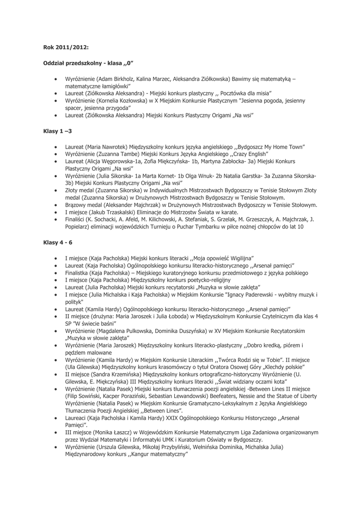 Rok 2011/2012: Oddział przedszkolny - klasa ,,0” Wyróżnienie (Adam Birkholz, Kalina Marzec, Aleksandra Ziółkowska) Bawimy się matematyką – matematyczne łamigłówki” Laureat (Ziółkowska Aleksandra) - Miejski konkurs plastyczny ,, Pocztówka dla misia” Wyróżnienie (Kornelia Kozłowska) w X Miejskim Konkursie Plastycznym "Jesienna pogoda, jesienny spacer, jesienna przygoda” Laureat (Ziółkowska Aleksandra) Miejski Konkurs Plastyczny Origami „Na wsi” Klasy 1 –3 Laureat (Maria Nawrotek) Międzyszkolny konkurs języka angielskiego ,,Bydgoszcz My Home Town” Wyróżnienie (Zuzanna Tambe) Miejski Konkurs Języka Angielskiego ,,Crazy English” Laureat (Alicja Węgorowska-1a, Zofia Miękczyńska- 1b, Martyna Zabłocka- 3a) Miejski Konkurs Plastyczny Origami „Na wsi” Wyróżnienie (Julia Sikorska- 1a Marta Kornet- 1b Olga Wnuk- 2b Natalia Garstka- 3a Zuzanna Sikorska3b) Miejski Konkurs Plastyczny Origami „Na wsi” Złoty medal (Zuzanna Sikorska) w Indywidualnych Mistrzostwach Bydgoszczy w Tenisie Stołowym Złoty medal (Zuzanna Sikorska) w Drużynowych Mistrzostwach Bydgoszczy w Tenisie Stołowym. Brązowy medal (Aleksander Majchrzak) w Drużynowych Mistrzostwach Bydgoszczy w Tenisie Stołowym. I miejsce (Jakub Trzaskalski) Eliminacje do Mistrzostw Świata w karate. Finaliści (K. Sochacki, A. Afeld, M. Kilichowski, A. Stefaniak, S. Grzelak, M. Grzeszczyk, A. Majchrzak, J. Popielarz) eliminacji wojewódzkich Turnieju o Puchar Tymbarku w piłce nożnej chłopców do lat 10 Klasy 4 - 6 I miejsce (Kaja Pacholska) Miejski konkurs literacki ,,Moja opowieść Wigilijna” Laureat (Kaja Pacholska) Ogólnopolskiego konkursu literacko-historycznego ,,Arsenał pamięci” Finalistka (Kaja Pacholska) – Miejskiego kuratoryjnego konkursu przedmiotowego z języka polskiego I miejsce (Kaja Pacholska) Międzyszkolny konkurs poetycko-religijny Laureat (Julia Pacholska) Miejski konkurs recytatorski „Muzyka w słowie zaklęta” I miejsce (Julia Michalska i Kaja Pacholska) w Miejskim Konkursie "Ignacy Paderewski - wybitny muzyk i polityk" Laureat (Kamila Hardy) Ogólnopolskiego konkursu literacko-historycznego ,,Arsenał pamięci” II miejsce (drużyna: Maria Jaroszek i Julia Łoboda) w Międzyszkolnym Konkursie Czytelniczym dla klas 4 SP ”W świecie baśni” Wyróżnienie (Magdalena Pulkowska, Dominika Duszyńska) w XV Miejskim Konkursie Recytatorskim „Muzyka w słowie zaklęta” Wyróżnienie (Maria Jaroszek) Międzyszkolny konkurs literacko-plastyczny ,,Dobro kredką, piórem i pędzlem malowane Wyróżnienie (Kamila Hardy) w Miejskim Konkursie Literackim ,,Twórca Rodzi się w Tobie”. II miejsce (Ula Gilewska) Międzyszkolny konkurs krasomówczy o tytuł Oratora Osowej Góry „Klechdy polskie” II miejsce (Sandra Krzemińska) Międzyszkolny konkurs ortograficzno-historyczny Wyróżnienie (U. Gilewska, E. Miękczyńska) III Międzyszkolny konkurs literacki ,,Świat widziany oczami kota” Wyróżnienie (Natalia Pasek) Miejski konkurs tłumaczenia poezji angielskiej -Between Lines II miejsce (Filip Sowiński, Kacper Poraziński, Sebastian Lewandowski) Beefeaters, Nessie and the Statue of Liberty Wyróżnienie (Natalia Pasek) w Miejskim Konkursie Gramatyczno-Leksykalnym z Języka Angielskiego Tłumaczenia Poezji Angielskiej ,,Between Lines”. Laureaci (Kaja Pacholska i Kamila Hardy) XXIX Ogólnopolskiego Konkursu Historyczego ,,Arsenał Pamięci”. III miejsce (Monika Łaszcz) w Wojewódzkim Konkursie Matematycznym Liga Zadaniowa organizowanym przez Wydział Matematyki i Informatyki UMK i Kuratorium Oświaty w Bydgoszczy. Wyróżnienie (Urszula Gilewska, Mikołaj Przybyliński, Wełnińska Dominika, Michalska Julia) Międzynarodowy konkurs ,,Kangur matematyczny” Wyróżnienie (Maria Nalewajk, Ada Kuras) Konkurs matematyczny „Alfik” I miejsce (Maria Nalewajk) Międzyszkolny Konkurs Matematyczny „Liczydełko” Wyróżnienie (Maria Nalewajk, Ada Kuras) Międzynarodowy konkurs matematyczny KANGUREK Wyróżnienie (Zofia Miękczyńska, Mateusz Dekowski, Tymon Nieśmiałek, Krzysztof Sochacki, Natalia Garstka, Martyna Zabłocka) XII Międzyszkolny Sprawnościowy Turniej Ekologiczny „Dbam o naszą Planetę” I miejsce (Julia Łoboda) w Międzyszkolnym Konkursie Plastycznym ”W świecie baśni” za pracę pt.,,Dziewczynka z zapałkami”. III miejsce (Paweł Grzeszczyk) w Miejskim Konkursie Plastycznym "Strażacki trud" zorganizowanym przez Ochotniczą Straż Pożarną w Bydgoszczy III miejsce (Małgorzata Bednarek) Międzyszkolny Konkurs Plastyczny: "Cherubino" Wyróżnienie (Agata Mrówczyńska) Miejski konkurs plastyczny „ Kolorowy świat bez dymu” II miejsce (Karol Krzywdziński) Miejski konkurs plastyczny „Jestem bezpieczny na drodze” II miejsce (J. Łoboda, M. Jaroszek) Miejski konkurs plastyczny „W świecie baśni” Złoty medal (drużyna dziewcząt: Antonina Lichocka, Dominika Duszyńska) w Drużynowych Mistrzostwach Bydgoszczy w Tenisie Stołowym. I miejsce w Międzyszkolnym Turnieju Piłki Nożnej dla chłopców z klas 6 szkół podstawowych o Puchar Dyrektora Zespołu Szkół nr 24 w Bydgoszczy. I miejsce (skład drużyny: Adamski Marcin, Szatkowski Dominik, Śmiejek Bartosz, Mikołajczak Maciej, Sowiński Filip - klasy 6, Łaszcz Bartosz, Maluk Marcel, Bonzel Natanael) w II Halowym Turnieju Piłki Nożnej o puchar Dyrektora Gimnazjum nr 31 w Bydgoszczy. Złoty medal (Mikołaj Piotrowski)) w Indywidualnych Mistrzostwach Bydgoszczy w Tenisie Stołowym Srebrny medal (Michał Majchrzak) w Indywidualnych Mistrzostwach Bydgoszczy w Tenisie Stołowym. Brązowy medal (Dominika Duszyńska) w Indywidualnych Mistrzostwach Bydgoszczy w Tenisie Stołowym. Brązowy medal (drużyna chłopców: Michał Majchrzak, Sebastian Lewandowski) w Drużynowych Mistrzostwach Bydgoszczy w Tenisie Stołowym. III miejsce (drużyna w składzie: Bartosz Łaszcz, Marcel Maluk, Michał Semrau, Aleksander Tomaszewski, Robert Kukiel, Paweł Grzeszczyk, Natanael Bonzel,