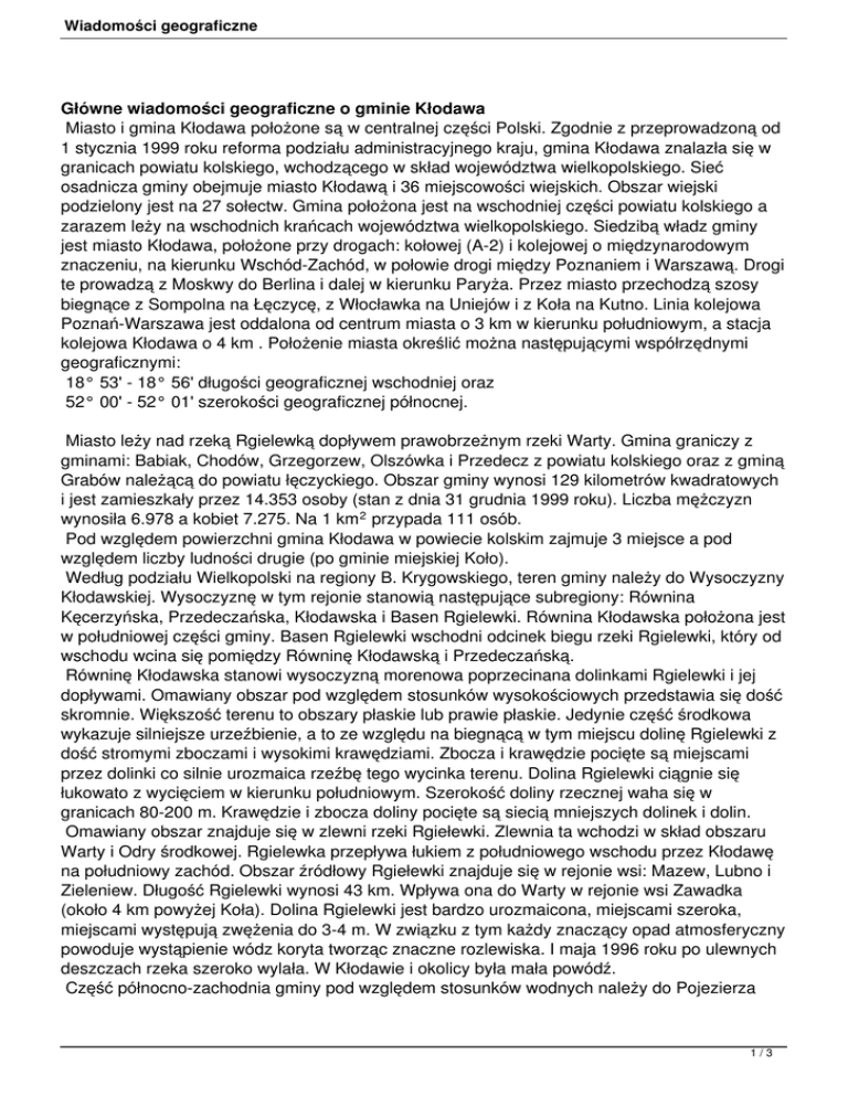 Wiadomości geograficzne Główne wiadomości geograficzne o gminie Kłodawa Miasto i gmina Kłodawa położone są w centralnej części Polski. Zgodnie z przeprowadzoną od 1 stycznia 1999 roku reforma podziału administracyjnego kraju, gmina Kłodawa znalazła się w granicach powiatu kolskiego, wchodzącego w skład województwa wielkopolskiego. Sieć osadnicza gminy obejmuje miasto Kłodawą i 36 miejscowości wiejskich. Obszar wiejski podzielony jest na 27 sołectw. Gmina położona jest na wschodniej części powiatu kolskiego a zarazem leży na wschodnich krańcach województwa wielkopolskiego. Siedzibą władz gminy jest miasto Kłodawa, położone przy drogach: kołowej (A-2) i kolejowej o międzynarodowym znaczeniu, na kierunku Wschód-Zachód, w połowie drogi między Poznaniem i Warszawą. Drogi te prowadzą z Moskwy do Berlina i dalej w kierunku Paryża. Przez miasto przechodzą szosy biegnące z Sompolna na Łęczycę, z Włocławka na Uniejów i z Koła na Kutno. Linia kolejowa Poznań-Warszawa jest oddalona od centrum miasta o 3 km w kierunku południowym, a stacja kolejowa Kłodawa o 4 km . Położenie miasta określić można następującymi współrzędnymi geograficznymi: 18° 53' - 18° 56' długości geograficznej wschodniej oraz 52° 00' - 52° 01' szerokości geograficznej północnej. Miasto leży nad rzeką Rgielewką dopływem prawobrzeżnym rzeki Warty. Gmina graniczy z gminami: Babiak, Chodów, Grzegorzew, Olszówka i Przedecz z powiatu kolskiego oraz z gminą Grabów należącą do powiatu łęczyckiego. Obszar gminy wynosi 129 kilometrów kwadratowych i jest zamieszkały przez 14.353 osoby (stan z dnia 31 grudnia 1999 roku). Liczba mężczyzn wynosiła 6.978 a kobiet 7.275. Na 1 km 2 przypada 111 osób. Pod względem powierzchni gmina Kłodawa w powiecie kolskim zajmuje 3 miejsce a pod względem liczby ludności drugie (po gminie miejskiej Koło). Według podziału Wielkopolski na regiony B. Krygowskiego, teren gminy należy do Wysoczyzny Kłodawskiej. Wysoczyznę w tym rejonie stanowią następujące subregiony: Równina Kęcerzyńska, Przedeczańska, Kłodawska i Basen Rgielewki. Równina Kłodawska położona jest w południowej części gminy. Basen Rgielewki wschodni odcinek biegu rzeki Rgielewki, który od wschodu wcina się pomiędzy Równinę Kłodawską i Przedeczańską. Równinę Kłodawska stanowi wysoczyzną morenowa poprzecinana dolinkami Rgielewki i jej dopływami. Omawiany obszar pod względem stosunków wysokościowych przedstawia się dość skromnie. Większość terenu to obszary płaskie lub prawie płaskie. Jedynie część środkowa wykazuje silniejsze urzeźbienie, a to ze względu na biegnącą w tym miejscu dolinę Rgielewki z dość stromymi zboczami i wysokimi krawędziami. Zbocza i krawędzie pocięte są miejscami przez dolinki co silnie urozmaica rzeźbę tego wycinka terenu. Dolina Rgielewki ciągnie się łukowato z wycięciem w kierunku południowym. Szerokość doliny rzecznej waha się w granicach 80-200 m. Krawędzie i zbocza doliny pocięte są siecią mniejszych dolinek i dolin. Omawiany obszar znajduje się w zlewni rzeki Rgiełewki. Zlewnia ta wchodzi w skład obszaru Warty i Odry środkowej. Rgielewka przepływa łukiem z południowego wschodu przez Kłodawę na południowy zachód. Obszar źródłowy Rgiełewki znajduje się w rejonie wsi: Mazew, Lubno i Zieleniew. Długość Rgielewki wynosi 43 km. Wpływa ona do Warty w rejonie wsi Zawadka (około 4 km powyżej Koła). Dolina Rgielewki jest bardzo urozmaicona, miejscami szeroka, miejscami występują zwężenia do 3-4 m. W związku z tym każdy znaczący opad atmosferyczny powoduje wystąpienie wódz koryta tworząc znaczne rozlewiska. I maja 1996 roku po ulewnych deszczach rzeka szeroko wylała. W Kłodawie i okolicy była mała powódź. Część północno-zachodnia gminy pod względem stosunków wodnych należy do Pojezierza 1/3 Wiadomości geograficzne Kujawskiego i znajduje się w zlewni rzeki Noteci. Występują tu liczne małe akweny i oczka polodowcowe. Do nielicznych jezior w gminie zaliczamy jezioro Korzecznik o powierzchni 10,7 ha i Kęcerskie o powierzchni 6,1 ha. Jezioro Kęcerskie jest częściowo zarośnięte roślinnością wodną. Lesistość gminy jest niewielka. Lasy zajmują powierzchnię 97 ha co stanowi 3,5% powierzchni gminy. Większe kompleksy leśne znajdują się wzdłuż zachodniej i północnej granicy gminy w sołectwach : Luboniek, Dzióbin, Kobylata i Zbójno. W drzewostanie dominuje sosna, dąb i świerk. Gmina Kłodawa jest obszarem typowo rolniczym ze znaczną przewagą gruntów ornych. Wśród gruntów ornych dominującą pozycje zajmują gleby dobre III i IV klasy bonitacyjnej. W dolinie Rgielewki znajdują się także łąki i pastwiska. Użytki rolne zajmują obszar 11,6 tys. ha co stanowi 88% ogólnej powierzchni gminy. Na terenie gminy znajdują się podziemne zasoby soli kamiennej oraz soli potasowej magnezowej. Kłodawski wsad solny, największy na Niżu Polskim, ma długość 26 km, a maksymalna szerokość wynosi 2 km. Wysad kłodawski jest częścią struktury solnej znajdującej się w pasie Izbica Kujawska-Łęczyca. Pas ten znajduje się na długości 65 km. W oparciu o rozpoznane złoże zbudowano w Kłodawie Kopalnię Soli, która przez ostatnie 50 lat (1949-1999) prowadzi działalność wydobywczą z pożytkiem dla kraju i naszego regionu. Zakład ten w tym okresie stał się głównym czynnikiem miastotwórczym Kłodawy i najbliższych okolic. W naszym opisie środowiska geograficznego warto kilka słów poświęcić sprawie warunków klimatycznych. Według regionalizacji klimatycznej Gumińskiego miasto Kłodawa i okolice znajdują się w VII dzielnicy klimatycznej zwanej „Dzielnicą środkową”. Cała ta dzielnica charakteryzuje się klimatycznie następująco: 1. 2. 3. 4. 5. opad atmosferyczny roczny poniżej 550 mm, liczba dni mroźnych od 30 do 50, liczba dni z przymrozkami od 100 do 110, czas trwania