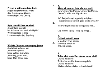 Przyjdź z pokłonem ludu Boży, przyjdź ze śpiewem ludu święty sław Jezusa, swego Zbawcę, wspaniałego Króla Chwały. 1. mów "Amen" jak Maryja, "Amen" jak Maryja, "Amen" - widocznie Bóg tak chce. 2. Będę chwalił Pana na wieki, chwalił Pana na wieki bez końca me usta niech wielbią Go! Wychwalaj Pana ze mną i razem wywyższajmy Jego imię. chociaż tak wielu nas jest Jedno w Chrystusie, jedna nadzieja jest w Nim Jeden Bóg, jedna wiara, jeden Bóg i Ojciec nasz. Ref. Tak jak Maryja wypełniaj wolę Boga I zanieś tam swój uśmiech gdzie często płyną łzy Kiedy w twym sercu nic więcej prócz bólu... Gdy z ciebie szydzą i kiedy się śmieją... 5. O Pani, ufność nasza 3. W ciele Chrystusa tworzymy jedno 4. Kiedy ci smutno i nic nie wychodzi w modlitwy Twej obronie chroń nas, chroń nas Królowo pokoju. 6. Tobie chór aniołów śpiewa nową pieśń Chwała Barankowi Tobie chór aniołów śpiewa nową pieśń Chwała Barankowi Alleluja, alleluja, alleluja – chwała i cześc! 7. Gdy klęczę przed Tobą, Modlę się i składam hołd, Weź ten dzień, uczyń go Twym I we mnie miłość wznieć. że Syna Swego jednorodzonego dał, aby każdy, kto w Niego wierzy nie zginął ale życie wieczne miał. Oo Jezus, Jezus, Je-e-zus. /x2 Ref. Ave Maria, gratia plena, Dominus tecum, benedicta tu. 10. Srebra i złota mi brak, 2.Wszystko Tobie daję, każdy sen i każdą myśl, Matko Boga, Matko moja, wznieś je przed Pana tron. Lecz to, co mam, daję ci. W imię Pana Jezusa mego Daj rękę, powstań i chodź. Ref.: I chodząc i skacząc wciąż Pana chwal. /x2 Jezus Chrystus zbawić cię chce, Daj rękę, powstań i chodź. 3.Gdy klęczę przed Tobą, widzę Twą radosną twarz, Każda myśl, każde słowo niech spocznie w dłoniach Twych. 8. Imię Pana chwalmy wciąż /3x, najwyższy On. Alleuja! Imię Pana chwalmy wciąż /3x, najwyższy On. Bo Imię Pana mocną twierdzą z radością biegniemy tam, by chwalić Go /2x 9. Bóg tak umiłował świat, 11. Nie mam nic, co bym mógł Ci Panie dać Nie mam sił by przed Tobą Panie stać Puste ręce przynoszę przed Twój w niebie tron Manną z nieba nakarm duszę mą. 2. Pomaż maścią leczącą oczy me Spraw by język mój też przemówić chciał Puste ręce... 12. 1. Jesteś Panie winnym krzewem, a my jego latorośle, moc czerpiemy tylko z Ciebie, Ty w nas żyjesz Swą miłością. Pan dał chleba moc, Alleluja. Jezus Pan komunią dla nas co dzień staje się, On rozrywa grzechu pęta złe. Cóż uczyni mi człowiek, kiedy ze mną Pan, Bóg podnosi, podtrzymuje mnie. Ref.: Panie, Panie, naucz nas w miłości Twojej trwać. (2x) 15. Jak paciorki różańca przesuwają się chwile, 2. Cóż trwałego poza Tobą, człowiek zdziała sam ze siebie. Któż potrafi własne dobro oblec w kształty nieśmiertelne. Nasze smutki, radości i blaski. A ty Bogu je zanieś, połączone w różaniec, Święta Panno Maryjo, pełna łaski! 3. Ty przyjaźnią nas ogarniasz, tak wspaniałą i szeroką, że wyzwala pełną radość w Sercu, które ciebie kocha. 1. My także mamy małe zwiastowania, My też czekamy Twego nawiedzenia, My też Jezusa z drżeniem serc szukamy. W tajemnicach radosnych módl się za nami! 13. Święte imię Jezus Święte imię Jezus Jest na ustach mych i w sercu mym w mocy Ducha uwielbiam Cię. Nie ma w innym Zbawienia, Gdyż nie dano nam ludziom Innego imienia, w Nim zbawienie jest. 14. Alleluja, wznoś pod niebo głos 2. Ty też płakałaś i doznałaś trwogi, I jak nikt poznałaś nasze ludzkie drogi, Gdy nas mrok otoczy, nie jesteśmy sami. W tajemnicach bolesnych módl się za nami! 3. My także mamy swą Ojczyznę w niebie, Tam w pełnym blasku zobaczymy Ciebie, Tam w pełnym słońcu wszyscy się spotkamy. W tajemnicach chwalebnych módl się za nami! 16. Chcę przestąpić Jego próg Z dziękczynieniem w sercu mym I w przedsionki Pana wejść chwaląc Go, Bo kolejny nadszedł dzień, który dał dla mnie Bóg, Chcę śpiewać Mu, bo Pan radością mą. I wysławiajcie go wszystkie ludy Jego łaskawość nad nami potężna A jego wierność trwa na wieki O, Alleluja Alleluja O Alleluja Alleluja Pan radością mą, Pan radością mą, Chcę śpiewać Mu, bo Pan radością moją jest! Pan radością mą, Pan radością mą, Chcę śpiewać Mu, bo Pan radością mą. 19. Jezus zwyciężył, to wykonało się 17. Idzie mój Pan, idzie mój Pan On teraz biegnie, by spotkać mnie. Mija góry, łąki, lasy, by Komunii stał się cud. On chce Chlebem nas nakarmić, by nasycić życia głód. Idzie mój Pan... Mija góry, łąki, lasy by Komunii stał się cud. On Krwią Swoją nas napełni, W sercach naszych sprawi cud. 18. O wychwalajcie go wszystkie narody Szatan pokonany, Jezus złamał śmierci moc Jezus jest Panem, o Alleluja Po wieczne czasy Królem Królów jest Jezus jest Panem x4 Tylko Jezus jest Panem x2 On jest Panem ziemi tej 20. Jezus Chrystus moim Panem jest, Alleluja. Jezus Chrystus moim Panem jest, Alleluja. On kocha mnie, On kocha mnie, Alleluja. On kocha mnie, On kocha mnie, Alleluja. Jesteś Królem, jesteś Królem, Królem jest Bóg. /*2 Podnieśmy wszyscy nasze serca, podnieśmy wszyscy nasze dłonie, stawajmy przed obliczem Pana wielbiąc Go./2x 21. Nasz Zbawiciel, Książę Pokoju, Emmanuel, Bóg jest z nami, Odkupiciel, Słowo żywota. Święty Bóg, Mesjasz prawdziwy, Jedyny Ojca Syn umiłowany. Zgładził grzech, Baranek na wieki, królów Król i panów Pan. 22. Dotknij, Panie, moich oczu, abym przejrzał Dotknij, Panie, moich warg, abym przemówił uwielbieniem. Dotknij, Panie, mego serca i oczyść je. Niech Twój Święty Duch dziś ogarnia mnie. wywyższam Cię i daję Ci hołd. W przedsionku chwały Twej staję, z radością śpiewam Ci pieśń. O, Panie Jezu chcę wyznać, że ja kocham Ciebie Ty zmieniasz mnie. Chcę Ci dziękować ze wszystkich sił, dajesz mi Siebie, bym na wieki żył. 25. Chrystus Wodzem Chrystus Królem Chrystus, Chrystus Władcą nam 23. Uwielbiam imię Twoje 