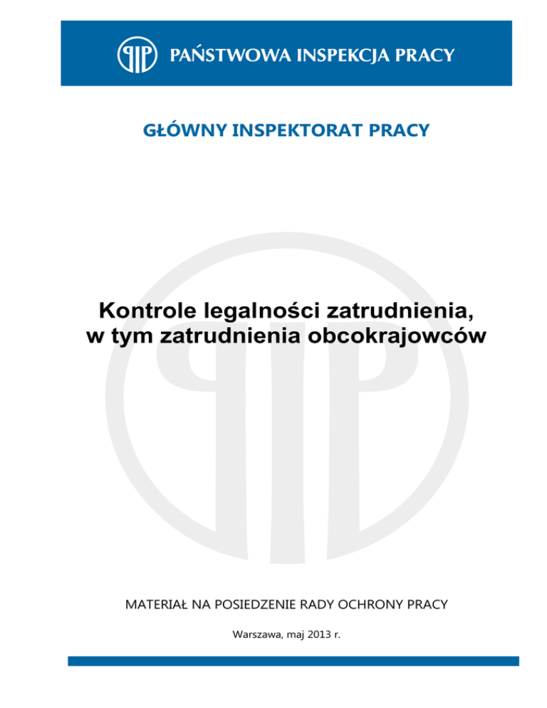 GŁÓWNY INSPEKTORAT PRACY Kontrole legalności zatrudnienia, w tym zatrudnienia obcokrajowców MATERIAŁ NA POSIEDZENIE RADY OCHRONY PRACY Warszawa, maj 2013 r. Spis treści: 1. Aktualny stan prawny uwzględniający zmiany w przepisach dotyczących legalności zatrudnienia………………………………………….3 2. Zakres kontroli………….…………………….……………………………………7 3. Wyniki kontroli przeprowadzonych w latach 2010 - 2012 3.1 Kontrole legalności zatrudnienia i wykonywania pracy przez obywateli polskich………………………………………………………………..10 3.2 Kontrole legalności zatrudnienia i wykonywania pracy przez cudzoziemców…………………………………………………………………….26 4. Podsumowanie i wnioski..………………………………….…………………..38 2 1. Aktualny stan prawny uwzględniający zmiany w przepisach dotyczących legalności zatrudnienia Prezentowany materiał stanowi kompleksowe opracowanie, poświęcone kontrolom legalności zatrudnienia i innej pracy zarobkowej obywateli polskich oraz kontrolom legalności zatrudnienia i wykonywania pracy przez cudzoziemców, przeprowadzonym przez inspektorów pracy w latach 2010 - 2012. W okresie objętym niniejszym sprawozdaniem zostały wprowadzone istotne zmiany w aktach prawnych regulujących problematykę wspomnianych kontroli, tj. w ustawie z dnia 20 kwietnia 2004 r. o promocji zatrudnienia i instytucjach rynku pracy (Dz.U. z 2008 r. Nr 69, poz. 415, z późn. zm.) oraz w ustawie z dnia 13 kwietnia 2007 r. o Państwowej Inspekcji Pracy (Dz.U. z 2012 r., poz. 404, z późn. zm.). Z punktu widzenia prowadzonych przez PIP kontroli legalności zatrudnienia obywateli polskich i cudzoziemców szczególne znaczenie mają dwie nowelizacje powyższych ustaw, które weszły w życie odpowiednio z dniem: 1 lutego 2011 r. – na podstawie ustawy z dnia 16 grudnia 2010 r. o zmianie ustawy o promocji zatrudnienia i instytucjach rynku pracy oraz niektórych innych ustaw (Dz.U. z 2010 r. Nr 257, poz. 1725) i 8 sierpnia 2011 r. – na mocy ustawy z dnia 9 czerwca 2011 r. o zmianie ustawy o Państwowej Inspekcji Pracy oraz niektórych innych ustaw (Dz.U. z 2011 r. Nr 142, poz. 829). Ponadto od dnia 21 lipca 2012 r. obowiązuje ustawa z 15 czerwca 2012 r. o skutkach powierzania wykonywania pracy cudzoziemcom przebywającym wbrew przepisom na terytorium Rzeczypospolitej Polskiej (Dz.U. z 2012 r., poz. 769), która nałożyła nowe obowiązki na podmioty powierzające wykonywanie pracy cudzoziemcom, poszerzając jednocześnie katalog instrumentów, jakimi dysponuje Państwowa Inspekcja Pracy w celu zwalczania nielegalnego zatrudnienia cudzoziemców. Głównym celem pierwszej z wymienionych wyżej nowelizacji, dotyczącej ustawy o promocji zatrudnienia i instytucjach rynku pracy, było wprowadzenie zmian doprecyzowujących przepisy budzące wątpliwości interpretacyjne i przysparzające trudności w praktyce. Nowelizacja ta wprowadziła zwłaszcza szereg ważnych zmian w obszarze dotyczącym legalności zatrudnienia cudzoziemców. Na mocy znowelizowanych przepisów zwolnieniem z obowiązku posiadania zezwolenia na pracę cudzoziemca zostali dodatkowo objęci obcokrajowcy posiadający w Rzeczypospolitej Polskiej zezwolenie na zamieszkanie na czas oznaczony z tytułu bycia 3 ofiarą handlu ludźmi w rozumieniu decyzji ramowej Rady z dnia 19 lipca 2002 r. w sprawie zwalczania handlu ludźmi. W kwestii cudzoziemiec tzw. wykonuje delegowania pracę dla wewnątrzkorporacyjnego, pracodawcy zagranicznego czyli i sytuacji, jest gdy delegowany na terytorium RP, doprecyzowano określenie podmiotów, do których cudzoziemiec w powyższej formie może zostać oddelegowany. Po pierwsze objęto tym przepisem przypadki delegowania do spółki dominującej (obok uwzględnianego już do tej pory delegowania do spółki zależnej), po drugie wyłączono z zakresu jego zastosowania trudne do zdefiniowania i stwarzające pole do nadużyć przypadki delegowania do podmiotu powiązanego długoterminową umową o współpracy z pracodawcą zagranicznym. Bardzo istotna zmiana, wprowadzona przede wszystkim w celu poprawy skuteczności oraz usprawnienia kontroli legalności zatrudnienia cudzoziemców, dotyczy treści wydawanych przez wojewodów zezwoleń na pracę. W myśl nowych zasad, w zezwoleniach na pracę cudzoziemców: delegowanych na terytorium Polski przez pracodawcę zagranicznego w ramach tzw. oddelegowania wewnątrzkorporacyjnego oraz w celu realizacji usługi eksportowej – oprócz pracodawcy zagranicznego powinien zostać określony podmiot, do którego cudzoziemiec jest delegowany. Natomiast jeżeli zezwolenie dotyczy pracy cudzoziemca w charakterze pracownika tymczasowego, w zezwoleniu na pracę wojewoda podaje nie tylko agencję pracy tymczasowej, ale też pracodawcę użytkownika, na rzecz którego cudzoziemiec ma faktycznie świadczyć pracę. Druga nowelizacja, obejmująca ustawę o Państwowej Inspekcji Pracy, dokonała m.in. rozszerzenia kręgu podmiotów kontrolowanych przez PIP pod względem legalności zatrudnienia (oraz bezpieczeństwa i higieny pracy) o niebędące pracodawcami ani przedsiębiorcami „inne jednostki organizacyjne”, na rzecz których jest świadczona praca przez osoby fizyczne. Pozwala to na prowadzenie kontroli legalności zatrudnienia w podmiotach, które nie mają statusu pracodawcy (tj. nie zatrudniają nikogo w ramach stosunku pracy) ani też statusu przedsiębiorcy, jednak powierzają pracę osobom fizycznym. Przykładowo można tu wskazać niezatrudniające pracowników, lecz wyłącznie osoby na podstawie umów cywilnoprawnych – stowarzyszenia, fundacje i inne podobne organizacje. Nowelizacja przewiduje również możliwość nakładania przez inspektorów pracy grzywien w drodze mandatu karnego za niektóre wykroczenia określone w ustawie z dnia 20 kwietnia 2004 r. o promocji zatrudnienia i i