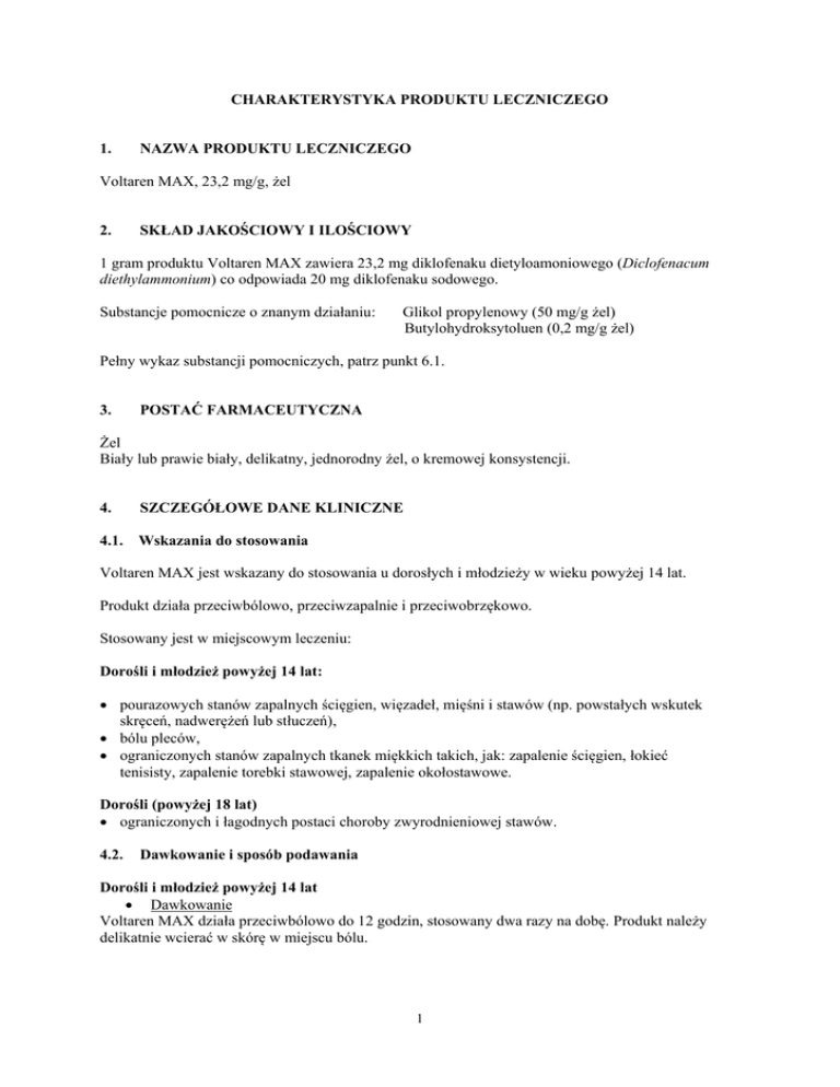 CHARAKTERYSTYKA PRODUKTU LECZNICZEGO 1. NAZWA PRODUKTU LECZNICZEGO Voltaren MAX, 23,2 mg/g, żel 2. SKŁAD JAKOŚCIOWY I ILOŚCIOWY 1 gram produktu Voltaren MAX zawiera 23,2 mg diklofenaku dietyloamoniowego (Diclofenacum diethylammonium) co odpowiada 20 mg diklofenaku sodowego. Substancje pomocnicze o znanym działaniu: Glikol propylenowy (50 mg/g żel) Butylohydroksytoluen (0,2 mg/g żel) Pełny wykaz substancji pomocniczych, patrz punkt 6.1. 3. POSTAĆ FARMACEUTYCZNA Żel Biały lub prawie biały, delikatny, jednorodny żel, o kremowej konsystencji. 4. SZCZEGÓŁOWE DANE KLINICZNE 4.1. Wskazania do stosowania Voltaren MAX jest wskazany do stosowania u dorosłych i młodzieży w wieku powyżej 14 lat. Produkt działa przeciwbólowo, przeciwzapalnie i przeciwobrzękowo. Stosowany jest w miejscowym leczeniu: Dorośli i młodzież powyżej 14 lat: pourazowych stanów zapalnych ścięgien, więzadeł, mięśni i stawów (np. powstałych wskutek skręceń, nadwerężeń lub stłuczeń), bólu pleców, ograniczonych stanów zapalnych tkanek miękkich takich, jak: zapalenie ścięgien, łokieć tenisisty, zapalenie torebki stawowej, zapalenie okołostawowe. Dorośli (powyżej 18 lat) ograniczonych i łagodnych postaci choroby zwyrodnieniowej stawów. 4.2. Dawkowanie i sposób podawania Dorośli i młodzież powyżej 14 lat Dawkowanie Voltaren MAX działa przeciwbólowo do 12 godzin, stosowany dwa razy na dobę. Produkt należy delikatnie wcierać w skórę w miejscu bólu. 1 Ilość żelu należy dostosować do rozmiarów miejsca zmienionego chorobowo: ilość żelu od 2 g do 4 g (ilość odpowiadająca wielkości owocu wiśni do rozmiarów orzecha włoskiego) jest odpowiednia do leczenia obszaru o powierzchni 400 – 800 cm2. Po zastosowaniu produktu należy umyć ręce, chyba, że to właśnie ręce są miejscem leczonym. Czas leczenia zależy od wskazań i od reakcji na leczenie. Pourazowe stany zapalne i reumatyzm tkanki miękkiej: nie należy stosować dłużej niż 14 dni, o ile nie zalecono inaczej Zwyrodnienie stawów (powyżej 18 lat): należy stosować do 21 dni, o ile nie zalecono inaczej. Należy skontaktować się z lekarzem po 7 dniach stosowania żelu w przypadku braku poprawy lub nasilenia się objawów chorobowych. Stosowanie u dzieci i młodzieży (poniżej 14 lat) Brak wystarczających danych dotyczących skuteczności i bezpieczeństwa stosowania produktu u dzieci i młodzieży poniżej 14 lat (patrz także punkt 4.3). Stosowanie u młodzieży (powyżej 14 lat) U młodzieży powyżej 14 lat, w razie konieczności stosowania produktu leczniczego przez dłużej niż 7 dni w leczeniu bólu, lub w przypadku pogorszenia się objawów, pacjent powinien skontaktować się z lekarzem. Stosowanie u osób w podeszłym wieku (powyżej 65 lat) W przypadku stosowania produktu Voltaren Max u osób w podeszłym wieku należy stosować dawkowanie jak u osób dorosłych. 4.3. Przeciwwskazania nadwrażliwość na diklofenak lub na którąkolwiek substancję pomocniczą produktu (patrz punkt 6.1.), u pacjentów, u których napady astmy, pokrzywka, czy ostre nieżyty błony śluzowej nosa są wywoływane przez kwas acetylosalicylowy lub inne niesteroidowe leki przeciwzapalne, ostatni trymestr ciąży, u dzieci i młodzieży poniżej 14 lat. 4.4. Specjalne ostrzeżenia i środki ostrożności dotyczące stosowania Nie można wykluczyć możliwości wystąpienia ogólnoustrojowych działań niepożądanych w przypadku stosowania produktu Voltaren MAX na duże powierzchnie skóry lub podczas stosowania długotrwałego. Voltaren MAX należy stosować tylko na nieuszkodzoną powierzchnię skóry. Należy unikać kontaktu żelu z oczami i błonami śluzowymi, nie połykać. Należy zaprzestać stosowania produktu, jeśli po jego użyciu pojawi się wysypka skórna. Voltaren MAX może być stosowany jednocześnie z nieokluzyjnymi bandażami, ale nie należy stosować go pod opatrunki uniemożliwiające dostęp powietrza. Informacje o niektórych składnikach produktu 2 Voltaren Max zawiera glikol propylenowy, który u niektórych osób, może powodować podrażnienie skóry. Produkt zawiera butylohydroksytoluen, który może powodować miejscową reakcję skórną (np. kontaktowe zapalenie skóry) lub podrażnienie oczu i błon śluzowych. 4.5. Interakcje z innymi produktami leczniczymi i inne rodzaje interakcji Po zastosowaniu żelu na skórę, ilość diklofenaku, która ulega wchłonięciu do krążenia ogólnego jest niewielka, dlatego też prawdopodobieństwo wystąpienia interakcji z innymi lekami jest niewielkie. 4.6. Wpływ na płodność, ciążę i laktację Ciąża Stopień ekspozycji ogólnoustrojowej diklofenaku po zastosowaniu na skórę jest niższy w porównaniu z doustnymi formami. W oparciu o doświadczenia ze stosowania NLPZ i ich działanie ogólnoustrojowe, zaleca się wziąć pod uwagę poniższe informacje: Zahamowanie syntezy prostaglandyn może negatywnie wpływać na ciążę i (lub) rozwój zarodka lub płodu. Dane z badań epidemiologicznych sugerują zwiększone ryzyko poronienia, wad rozwojowych serca i wytrzewienia w przypadku stosowania inhibitorów syntezy prostaglandyn we wczesnej ciąży. Całkowite ryzyko wystąpienia wad rozwojowych serca zostaje zwiększone z 1% do 1,5%. Uważa się, że ryzyko to zwiększa się wraz ze zwiększeniem dawki i czasu trwania terapii. U zwierząt wykazano, że podawanie inhibitorów syntezy prostaglandyn skutkowało zwiększoną utratą płodów przed i po implantacji oraz śmiertelnością zarodków lub płodów. Dodatkowo zwiększenie ilości przypadków różnych wad wrodzonych, również układu sercowo-naczyniowego obserwowano u zwierząt, którym podawano inhibitory syntezy prostaglandyn podczas okresu organogenezy. Jeśli nie jest to wyraźnie konieczne, nie należy stosować diklofenaku podczas pierwszego i drugiego trymestru ciąży. W przypadku stosowania diklofenaku przez kobiety planujące ciążę oraz w czasie pierwszeg