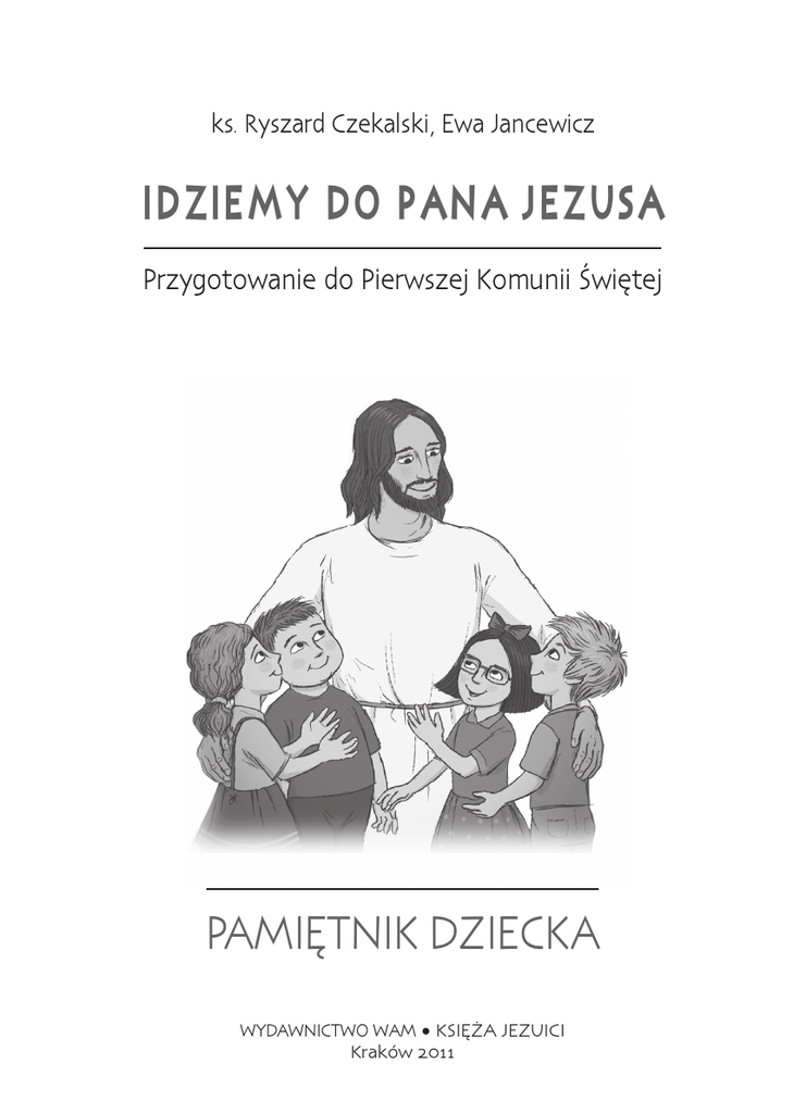 ks. Ryszard Czekalski, Ewa Jancewicz IDZIEMY DO PANA JEZUSA Przygotowanie do Pierwszej Komunii Świętej PAMIĘTNIK DZIECKA WYDAWNICTWO WAM ● KSIƝA JEZUICI Kraków 2011 © Wydawnictwo WAM , 2011 Redakcja: Barbara Cabała Projekt okładki: Krzysztof Błażejczyk Ilustracje: Janusz Tycner Skład: Wojciech Prażuch ISBN 978-83-7505-840-6 NIHIL OBSTAT: Przełożony Prowincji Polski Południowej Towarzystwa Jezusowego ks. Wojciech Ziółek SJ, prowincjał, Kraków, 8 sierpnia 2011 r., l.dz. 183/11. WYDAWNICTWO WAM ul. Kopernika 26 • 31-501 Kraków tel. 12 62 93 200 • faks 12 42 95 003 e-mail: [email protected] www.wydawnictwowam.pl DZIAŁ HANDLOWY tel. 12 62 93 254-255 • faks 12 43 03 210 e-mail: [email protected] KSIĘGARNIA INTERNETOWA tel. 12 62 93 260, 12 62 93 446-447 faks 12 62 93 261 e.wydawnictwowam.pl Druk: Drukarnia Wydawnictwa WAM ul. Kopernika 26 • 31-501 Kraków 1 Rozpoczynamy przygotowanie do Pierwszej Komunii Świętej Wrzesień 1.Przeczytaj teksty i wpisz swoje imię w wykropkowane miejsca. W pustej ramce wklej swoje zdjęcie lub narysuj siebie. , zapraszam Cię na spotkanie ze Mną w sakramencie pokuty i pojednania oraz w Komunii Świętej. Postaraj się dobrze przygotować na Moje przyjście! 3 Panie Jezu, przyjmuję Twoje zaproszenie. Postanawiam przygotować się najlepiej jak potrafię do spotkania z Tobą w sakramencie pokuty i pojednania oraz do przyjęcia Ciebie w Komunii Świętej pod postacią chleba. 2.Napisz, jak przygotujesz się do spotkania z Panem Jezusem. 4 Panie Jezu, pomóż mi dobrze przygotować się na spotkanie z Tobą! Słowo do rodziców Drodzy Rodzice! Dzisiejszym spotkaniem rozpoczęliśmy czas bezpośredniego przygotowania do pełnego uczestnictwa Waszego dziecka we Mszy Świętej. Rok ten będzie dla niego bardzo ważny. Wspólnie będziemy kształtować postawy tworzące fundament dla jego dalszego życia religijnego. Serdecznie zapraszam Was do współpracy, podczas całego roku, aby wspólnie pomóc dziecku w przygotowaniu do dobrego przeżycia sakramentu pokuty i pojednania oraz przyjęcia Chrystusa pod postacią chleba. Dnia Rodzice Ksiądz Katecheta w spotkaniu razem ze mną uczestniczyli: (podpis rodziców) (podpis księdza) (podpis katechety) 5 2 Z Maryją przygotowujemy się do spotkania z Panem Jezusem Październik 1. Uzupełnij zdanie. Maryja powiedziała do Łucji, Franciszka i Hiacynty: „Jestem Królową i pra- gnę, aby na tym miejscu wybudowano kaplicę i po wszystkie dni modlono się na Różańca ”. Różańcu 2. W ramce narysuj różaniec. 6 Świętego 3.Jeśli chcesz razem z Ojcem Świętym odmawiać modlitwę Anioł Pański, naucz się Zdrowaś Maryjo po łacinie: Ave Maria, gratia plena; Dominus tecum: benedicta tu in mulieribus, et benedictus fructus ventris tui Jesus. Santa Maria, Mater Dei, ora pro nobis peccatoribus, nunc et in hora mortis nostrae. Amen. „Różaniec towarzyszył mi w chwilach radości i doświadczenia. Zawierzyłem mu wiele trosk. Dzięki niemu doznawałem otuchy (…). Różaniec to modlitwa, którą bardzo kochałem”. Jan Paweł II 7 Słowo do rodziców Drodzy Rodzice! Przesłaniem dzisiejszego spotkania było wskazanie znaczenia modlitwy różańcowej w codziennym życiu. Postarajcie się ukazywać dziecku, że rozważając w modlitwie różańcowej każde wydarzenie z życia Maryi i Pana Jezusa, możemy być bliżej Pana Boga, coraz mocniej Go kochać i poznawać. Według prawd, które przybliżają nam te tajemnice, potrafimy lepiej kształtować własne życie. Kiedy rozmyślamy o życiu Pana Jezusa i Jego Matki, odmawiając tajemnice radosne, światła, bolesne i chwalebne, możemy odnaleźć w nich swoje życie, samych siebie; łączyć nasze radości i troski z Ich radościami i cierpieniami. Postarajcie się często wspólnie modlić na różańcu, prosząc Maryję o łaskę dobrego przygotowania i przeżycia pierwszego spotkania z Chrystusem przebaczającym w sakramencie pokuty i pojednania oraz Chrystusem eucharystycznym. Dzisiaj wieczorem postarajcie się odmówić wspólnie dziesiątkę różańca w tej intencji. Dnia Rodzice Ksiądz Katecheta w spotkaniu razem ze mną uczestniczyli: (podpis rodziców) (podpis księdza) (podpis katechety) 8 Pieśni i piosenki religijne Bóg jest miłością Bóg jest miłością, zbawieniem duszy i kocha bardzo mnie, dziecię swe. Ref.: Więc śpiewaj, duszo ma: Bóg jest miłością, Bóg jest miłością, miłuje mnie. Jezusa posłał, wiernego Zbawcę, aby do nieba wprowadził mnie. Ref.: Więc śpiewaj, duszo ma: Bóg jest miłością, Bóg jest miłością, miłuje mnie. Chcę przestąpić Jego próg Chcę przestąpić Jego próg z dziękczynieniem w sercu mym i w przedsionki Pana wejść, chwaląc Go! Bo kolejny nadszedł dzień, który dał dla mnie Bóg, chcę śpiewać Mu, bo Pan radością mą. Pan radością mą, Pan radością mą, chcę śpiewać Mu, bo Pan radością moją jest. Pan radością mą, Pan radością mą, chcę śpiewać Mu, bo Pan radością mą. 40 Chrystus Pan karmi nas Ref.: Chrystus Pan karmi nas Swoim świętym Ciałem. Chwalmy Go na wieki. Duchem całym wielbię Pana, Boga, Zbawcę jedynego, bo w Nim samym odnajduję, wszystką radość życia mego. Ref.: Chrystus Pan karmi nas Swoim świętym Ciałem. Chwalmy Go na wieki. Wielbię, bo chciał wejrzeć z nieba na swą sługę uniżoną, by mnie odtąd wszyscy ludzie mogli zwać Błogosławioną. Ref.: Chrystus Pan karmi nas Swoim świętym Ciałem. Chwalmy Go na wieki Cóż Ci, Jezu damy Cóż Ci, Jezu damy za Twych łask strumienie? Z serca Ci składamy korne dziękczynienie. Ref.: Panie nasz, króluj nam! Boże nasz, króluj nam! Poprzez wieczny czas, króluj, Jezu, nam! W Serca Twego ranie, o serc naszych Królu, pokój i wytrwanie, ukojenie w bólu. 41
