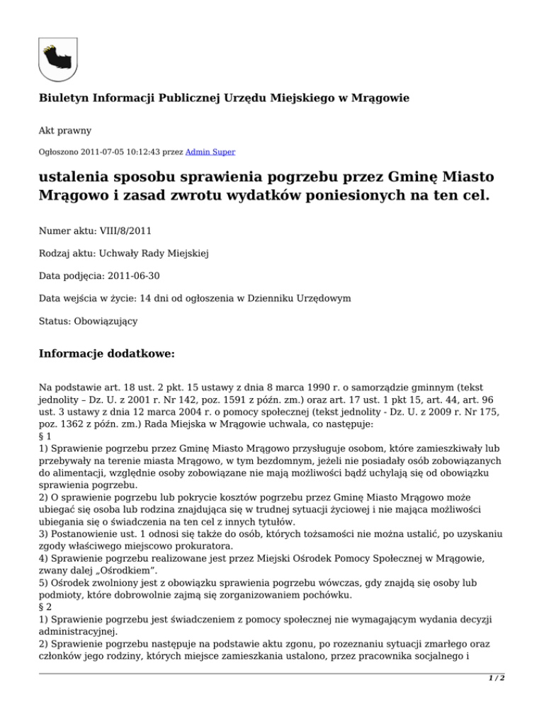 Biuletyn Informacji Publicznej Urzędu Miejskiego w Mrągowie Akt prawny Ogłoszono 2011-07-05 10:12:43 przez Admin Super ustalenia sposobu sprawienia pogrzebu przez Gminę Miasto Mrągowo i zasad zwrotu wydatków poniesionych na ten cel. Numer aktu: VIII/8/2011 Rodzaj aktu: Uchwały Rady Miejskiej Data podjęcia: 2011-06-30 Data wejścia w życie: 14 dni od ogłoszenia w Dzienniku Urzędowym Status: Obowiązujący Informacje dodatkowe: Na podstawie art. 18 ust. 2 pkt. 15 ustawy z dnia 8 marca 1990 r. o samorządzie gminnym (tekst jednolity – Dz. U. z 2001 r. Nr 142, poz. 1591 z późn. zm.) oraz art. 17 ust. 1 pkt 15, art. 44, art. 96 ust. 3 ustawy z dnia 12 marca 2004 r. o pomocy społecznej (tekst jednolity - Dz. U. z 2009 r. Nr 175, poz. 1362 z późn. zm.) Rada Miejska w Mrągowie uchwala, co następuje: §1 1) Sprawienie pogrzebu przez Gminę Miasto Mrągowo przysługuje osobom, które zamieszkiwały lub przebywały na terenie miasta Mrągowo, w tym bezdomnym, jeżeli nie posiadały osób zobowiązanych do alimentacji, względnie osoby zobowiązane nie mają możliwości bądź uchylają się od obowiązku sprawienia pogrzebu. 2) O sprawienie pogrzebu lub pokrycie kosztów pogrzebu przez Gminę Miasto Mrągowo może ubiegać się osoba lub rodzina znajdująca się w trudnej sytuacji życiowej i nie mająca możliwości ubiegania się o świadczenia na ten cel z innych tytułów. 3) Postanowienie ust. 1 odnosi się także do osób, których tożsamości nie można ustalić, po uzyskaniu zgody właściwego miejscowo prokuratora. 4) Sprawienie pogrzebu realizowane jest przez Miejski Ośrodek Pomocy Społecznej w Mrągowie, zwany dalej „Ośrodkiem”. 5) Ośrodek zwolniony jest z obowiązku sprawienia pogrzebu wówczas, gdy znajdą się osoby lub podmioty, które dobrowolnie zajmą się zorganizowaniem pochówku. §2 1) Sprawienie pogrzebu jest świadczeniem z pomocy społecznej nie wymagającym wydania decyzji administracyjnej. 2) Sprawienie pogrzebu następuje na podstawie aktu zgonu, po rozeznaniu sytuacji zmarłego oraz członków jego rodziny, których miejsce zamieszkania ustalono, przez pracownika socjalnego i 1/2 stwierdzeniu okoliczności, o których mowa w § 1. §3 Pogrzeb sprawia się zgodnie z wyznaniem zmarłego, jego życzeniem, jeżeli jest znane, po uprzedniej konsultacji z przedstawicielem miejscowego kościoła lub innymi związkami wyznaniowymi. §4 1) Ośrodek zleca sprawienie pogrzebu firmie prowadzącej kompleksowe usługi pogrzebowe po uprzednim określeniu przez ośrodek zakresu usług pogrzebowych i kosztów z tym związanych. 2) Sprawienie pogrzebu obejmuje:) 1) przewóz i przechowanie zwłok, 2) przygotowanie zwłok do pochówku (mycie i ubranie zwłok), 3) zakup ubrania, 4) zakup trumny, krzyża, tabliczki, 5) wykopanie mogiły 6) obsługę przy pochówku, 7) inne czynności wynikające z okoliczności, zgodnie z wyznaniem zmarłego. §5 Sprawienie pogrzebu dla osoby bezdomnej zmarłej na terenie miasta Mrągowa, bez względu na ostatnie miejsce zameldowania, oraz osoby nieznanej (NN) następuje na cmentarzu komunalnym w Mrągowie. §6 1) Dyrektor Ośrodka dokonuje zapłaty lub zwrotu kosztów pogrzebu na podstawie:) 1) wniosku i rachunków przedstawionych przez osoby, które dokonały pochówku, 2) rachunku wystawionego przez podmiot, któremu zostały zlecone czynności, po uprzednim wykonaniu zlecenia. 2) Wydatki poniesione przez Ośrodek na pokrycie kosztów pogrzebu podlegają zwrotowi:) 1) z zasiłku pogrzebowego o ile taki zasiłek przysługuje z ubezpieczenia społecznego, 2) w całości z masy spadkowej, jeżeli po osobie zmarłej nie przysługuje zasiłek pogrzebowy, a zostawiła ona majątek, 3) W przypadku sprawienia pogrzebu dla osoby bezdomnej bez uprawnień do zasiłku pogrzebowego oraz osoby NN koszty pogrzebu pokrywa w całości Ośrodek. §7 Wykonanie uchwały powierza się Burmistrzowi Miasta Mrągowo. §8 Uchwała wchodzi w życie po upływie 14 dni od ogłoszenia w Dzienniku Urzędowym Województwa Warmińsko – Mazurskiego. 2/2