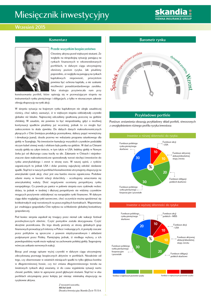 Miesięcznik inwestycyjny Wrzesień 2015 Komentarz Barometr rynku Przede wszystkim bezpieczeństwo dyn am ik st Wzro Spadek fela o rt bez pie cz eń tfela por o stw ap Chronimy aktywa przed większymi stratami. Ze względu na niespokojną sytuację panującą na rynkach finansowych w rekomendowanych portfelach, w dalszym ciągu utrzymujemy obniżony poziom ryzyka. Jak pisaliśmy poprzednio, ze względu na panującą na rynkach kapitałowych niepewność, priorytetem powinna być ochrona kapitału, a nie szukanie możliwości ponadstandardowego zarobku. Taka strategia przyświecała nam przy konstruowaniu portfeli, które opierają się w przeważającym stopniu na instrumentach rynku pieniężnego i obligacjach, a tylko w nieznacznym zakresie oferują ekspozycję na rynki akcji. 1 W sierpniu sytuacja na krajowym rynku kapitałowym nie uległa zasadniczej różnicy, choć należy zauważyć, iż w większym stopniu oddziaływały czynniki globalne niż lokalne. Najmocniej odczuliśmy gwałtowną przecenę na giełdzie chińskiej. W zasadzie, nie powinno to być niespodzianką, gdyż o możliwej kontynuacji spadków pisaliśmy już wcześniej, jednak to co mogło być zaskoczeniem to skala zjawiska. Do słabych danych makroekonomicznych płynących z Chin (mniejsza produkcja przemysłowa, słabszy popyt wewnętrzny i dewaluacja juana), doszła przerwa we wdrażaniu programu ratunkowego dla giełdy w Szanghaju. Na inwestorów kumulacja wszystkich czynników podziałała niczym kubeł zimnej wody i efektem była panika na giełdzie. W ślad za Chinami ruszyły giełdy na całym świecie, w tym także w USA. Indeksy giełdy w Nowym Jorku już od dłuższego czasu traciły na sile. Załamanie w Chinach i niejednoznaczne dane makroekonomiczne spowodowały wzrost niechęci inwestorów do rynku amerykańskiego i zwrot w stronę euro. W naszej opinii, z rynków zagranicznych to jednak USA i dolar powinny najszybciej odrobić niedawne spadki. Stąd też w naszych portfelach konsekwentnie utrzymujemy ekspozycję na amerykański rynek akcji, choć jest ona bardzo mocno ograniczona. Podobne zdanie mamy w kwestii relacji dolar/złoty - oczekujemy umacniania się amerykańskiej waluty. Dość negatywnie oceniamy perspektywy rynku europejskiego. Co prawda po panice w połowie sierpnia euro zyskiwało wobec dolara, to jednak w średniej i dłuższej perspektywie nie widzimy czynników mogących pozytywnie oddziaływać na europejskie rynki finansowe. W dalszym ciągu słabo wyglądają rynki surowcowe, choć oczywiście można spodziewać się krótkotrwałych sesji wzrostowych na poszczególnych kontraktach. Wspomniana już zwalniająca gospodarka Chin wpływa na ochłodzenie globalnej koniunktury gospodarczej. Przykładowe portfele Poniższe zestawienia obrazują przykładowy skład portfeli, stworzonych z uwzględnieniem różnego profilu ryzyka inwestora: Inwestor o ni˝szej skłonnoÊci do ryzyka: Fundusze akcji - USA Fundusze polskiego rynku pieniężnego skarbowe 10 30 10 Fundusze aktywnej alokacji/absolutnej stopy zwrotu % 20 Fundusze obligacji polskich skarbowe 30 Fundusze polskiego rynku pieniężnego korporacyjne i pozostałe Inwestor o wy˝szej skłonnoÊci do ryzyka: Fundusze akcji polskich - MIŚS Fundusze polskiego rynku pieniężnego skarbowe Pod koniec sierpnia uspokoił się trwający przez niemal całe wakacje festiwal przedwyborczych obietnic. Część pomysłów została skorygowana. Część skrzętnie przemilczana. Do tego doszły protesty ze strony globalnych grup finansowych prowadzących interesy w Polsce i wskazujących, iż pomysły rzucane przez polityków są sprzeczne z prawem międzynarodowym i układami podpisanymi przez Polskę. Pamiętajmy jednak, iż niedługo wybory, a ich prawdopodobny wynik może wpłynąć na zachowanie polskiej giełdy. Sugerujemy wówczas unikanie nerwowych reakcji. 10 20 10 % Fundusze polskiego rynku pieniężnego korporacyjne i pozostałe Biorąc pod uwagę opisane wyżej czynniki w dalszym ciągu utrzymujemy zdecydowaną przewagę bezpiecznych aktywów w portfelach. Niezależnie od tego, czy obserwowane w ostatnich miesiącach spadki to tylko głębsza korekta w długoterminowej hossie, czy też zmiana długoterminowego trendu na światowych rynkach akcji uważamy, iż do czasu wyjaśnienia sytuacji warto chronić portfele, także te agresywne przed głębszymi stratami. Stąd też w obu portfelach utrzymujemy przez kolejny już miesiąc minimalną ekspozycję na ryzykowne aktywa. 30 fundusz o najniższym poziomie ryzyka Z wyrazami szacunku, Michał Janik Doradca Inwestycyjny Skandia Życie TU S.A. -1- 10 20 Fundusze akcji - USA Fundusze aktywnej alokacji/absolutnej stopy zwrotu Fundusze obligacji polskich skarbowe fundusz o najwyższym poziomie ryzyka Miesięcznik inwestycyjny Wrzesień 2015 Fundusze dost´pne w aktualnej ofercie Skandii we wrzeÊniu* DWS3 PLN SKAR3 PLN 0,03% 0,02% 0,18% 0,03% 0,02% 0,18% 0,36% 0,03% 0,59% 1,47% 2,22% 2,90% Fundusze obligacji polskich skarbowe CU2 PLN Aviva Investors FIO Subfundusz Aviva Investors Obligacji Investor Obligacji Fundusz Inwestycyjny Otwarty DWS2 PLN ING2 PLN NN Parasol FIO Subfundusz Obligacji NOVO5 PLN Novo FIO Subfundusz Novo Papierów Dłu˝nych OPT2 PLN Optimum Fundusz Inwestycyjny Otwarty subfundusz Obligacji Skarbiec FIO Subfundusz Instrumentów Dłu˝nych Skarbiec-Obligacja SKAR2 PLN -0,31% 0,12% -0,16% -0,66% -0,19% 0,57% -0,31% 0,12% -0,16% -0,66% -0,19% 0,57% -0,29% 0,38% -0,07% -1,05% -0,29% 0,74% 0,44% 2,22% 1,24% 0,54% -0,87% 2,47% VII, Fundusze obligacji I, Fundusze akcji krajów rozwijajàcych si´ Fundusze akcji polskich – du˝ych spółek Investor Akcji Du˝ych Spółek Skarbiec FIO Subfundusz Akcji Skarbiec-Akcja SKAR4 PLN UNK4 PLN UNK5 PLN Skarbiec FIO Subfundusz Pieni´˝ny Skarbiec-Kasa UniFundusze FIO Subfundusz UniKorona Pieni´˝ny UniFundusze SFIO Subfundusz UniWIBID Wyniki funduszy -4,17% -4,60% -4,17% -4,60% -8,65% -8,39% -3,04% -1,56% Fundusze obligacji polskich - ko