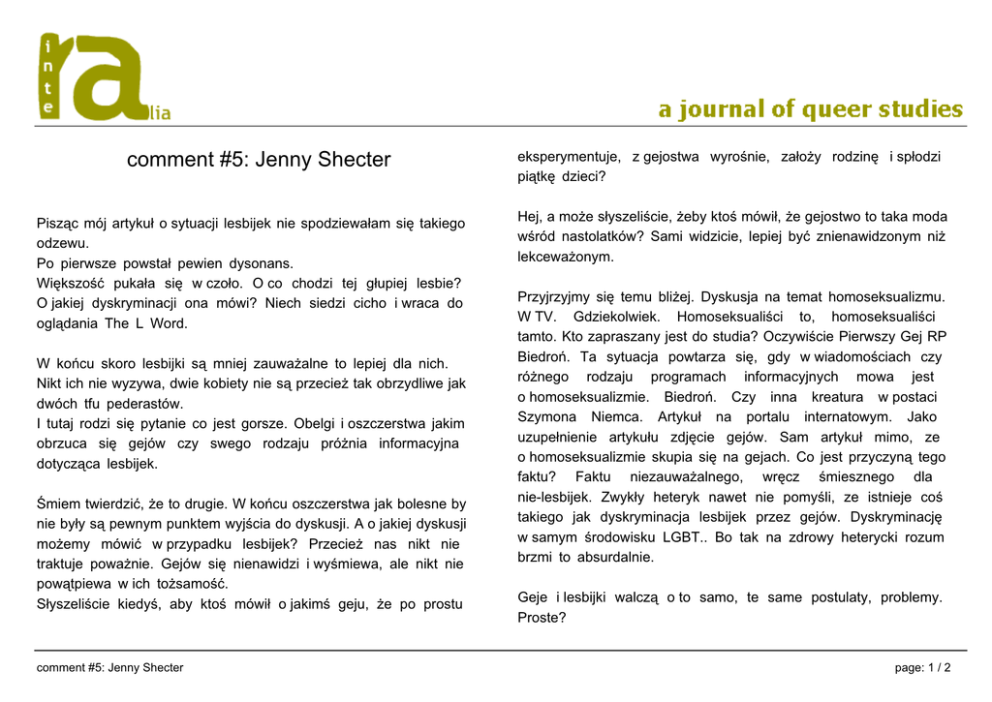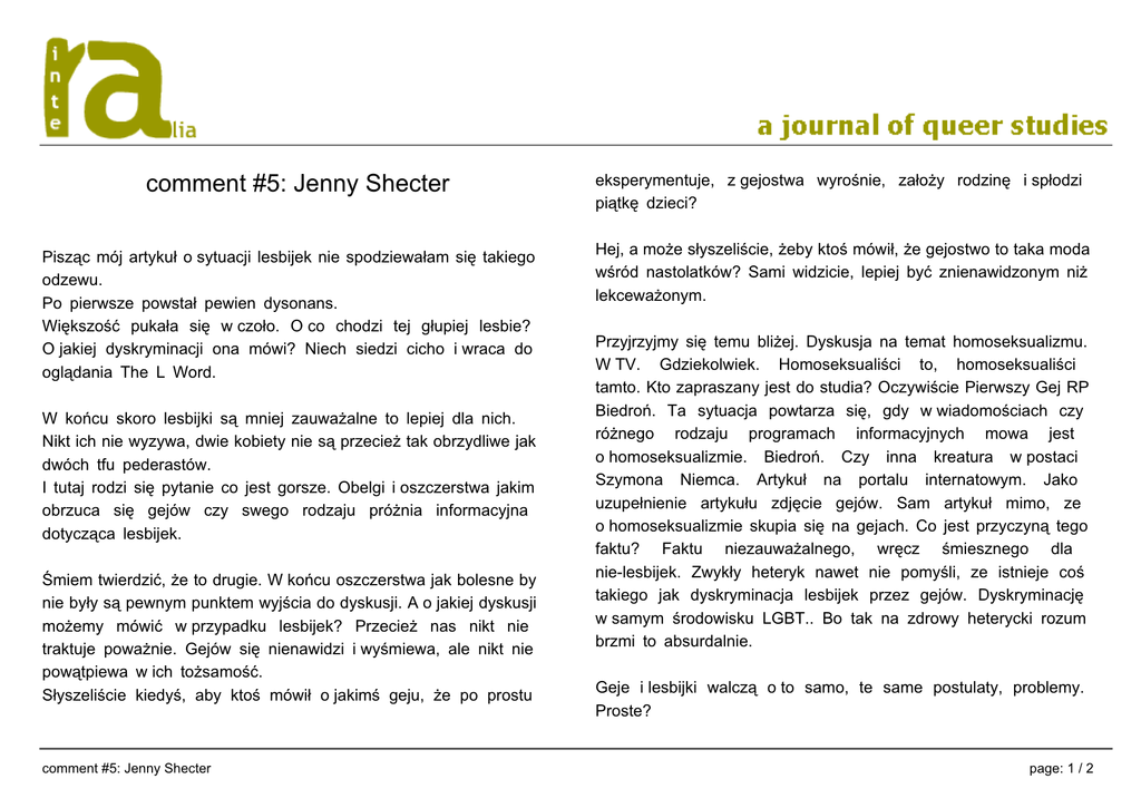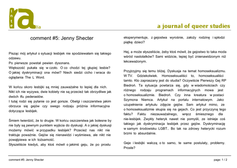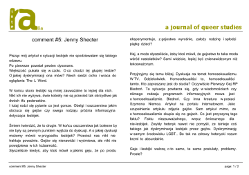 comment #5: Jenny Shecter Pisząc mój artykuł o sytuacji lesbijek nie spodziewałam się takiego odzewu. Po pierwsze powstał pewien dysonans. Większość pukała się w czoło. O co chodzi tej głupiej lesbie? O jakiej dyskryminacji ona mówi? Niech siedzi cicho i wraca do oglądania The L Word. W końcu skoro lesbijki są mniej zauważalne to lepiej dla nich. Nikt ich nie wyzywa, dwie kobiety nie są przecież tak obrzydliwe jak dwóch tfu pederastów. I tutaj rodzi się pytanie co jest gorsze. Obelgi i oszczerstwa jakim obrzuca się gejów czy swego rodzaju próżnia informacyjna dotycząca lesbijek. Śmiem twierdzić, że to drugie. W końcu oszczerstwa jak bolesne by nie były są pewnym punktem wyjścia do dyskusji. A o jakiej dyskusji możemy mówić w przypadku lesbijek? Przecież nas nikt nie traktuje poważnie. Gejów się nienawidzi i wyśmiewa, ale nikt nie powątpiewa w ich tożsamość. Słyszeliście kiedyś, aby ktoś mówił o jakimś geju, że po prostu comment #5: Jenny Shecter eksperymentuje, z gejostwa wyrośnie, założy rodzinę i spłodzi piątkę dzieci? Hej, a może słyszeliście, żeby ktoś mówił, że gejostwo to taka moda wśród nastolatków? Sami widzicie, lepiej być znienawidzonym niż lekceważonym. Przyjrzyjmy się temu bliżej. Dyskusja na temat homoseksualizmu. W TV. Gdziekolwiek. Homoseksualiści to, homoseksualiści tamto. Kto zapraszany jest do studia? Oczywiście Pierwszy Gej RP Biedroń. Ta sytuacja powtarza się, gdy w wiadomościach czy różnego rodzaju programach informacyjnych mowa jest o homoseksualizmie. Biedroń. Czy inna kreatura w postaci Szymona Niemca. Artykuł na portalu internatowym. Jako uzupełnienie artykułu zdjęcie gejów. Sam artykuł mimo, ze o homoseksualizmie skupia się na gejach. Co jest przyczyną tego faktu? Faktu niezauważalnego, wręcz śmiesznego dla nie-lesbijek. Zwykły heteryk nawet nie pomyśli, ze istnieje coś takiego jak dyskryminacja lesbijek przez gejów. Dyskryminację w samym środowisku LGBT.. Bo tak na zdrowy heterycki rozum brzmi to absurdalnie. Geje i lesbijki walczą o to samo, te same postulaty, problemy. Proste? page: 1 / 2 Niekoniecznie. Śmiem twierdzić, że zwykła niebranżowa lesbijka bardziej utożsamia się z problemami pani Jadzi spod ósemki, niż jakiegoś tam Biedronia i jego tęczowej kompanii. Nie twierdze tak TYLKO dlatego bo pan Biedroń najzwyczajniej w świecie mnie denerwuje. Może inaczej. Moja antypatia nie jest głównym powodem tego, iż jestem orędowniczką swoistej schizmy w ruchu LGBT. Po prostu jestem zwykłą dziewczyną, dziesiątki takich mijasz codziennie na ulicy. Żadnej tęczy na czole. Nigdy nie powiedział(a)/byś, ze jestem lesbijką, chyba ze przyłapiesz mnie oglądaniu się za ładnymi dziewczynami. To właśnie takie kobiety jak ja stanowią większość polskich lesbijek. Branżówka to tylko taki barwny procent polskich lesbijek, oscylujący gdzieś na granicy błędu statystycznego. I teraz pytanie za sto punktów: co takie dziewczyny jak ja łączy z takimi facetami jak Biedroń? Prócz orientacji seksualnej oczywiście. Co nas łączy? No co? NIC. Brawo, tak właśnie tak. Chciałoby się rzec za Kasią Nosowską: Pan wygrał bon, a Pani Fiat. Smutne to trochę, ale prawdziwe. Przyszedł czas, aby któraś z nas powiedziała to głośno. Mam dosyć działaczy gejowskich, ich nachalności i agresji.. Mocne słowa? Nie sądzę. Chcę, żeby wreszcie ktoś mnie reprezentował. W telewizji, radiu, w tak zwanych mediach. Chcę kobiety. Zwykłej, spokojnej, merytorycznej i rozsądnej. Bez głupiej tęczy w tle. I facjaty pana Biedronia. Chcę dyskusji o kobiecych problemach zamiast comment #5: Jenny Shecter pustych postulatów działaczy gejowskich, żywcem wziętych z zachodnich broszurek. Chcę, żeby ruch lesbijski poszedł w stronę syntezy z ruchem kobiecym, feministycznym. Na koniec pragnę dodać, iż geje to fajne chłopaki są. Niestety nie mają szczęścia do swoich przedstawicieli. Zasugeruję skromnie, ze może pora parafrazując nomen omen teletubisie i powiedzieć im PA PA? page: 2 / 2