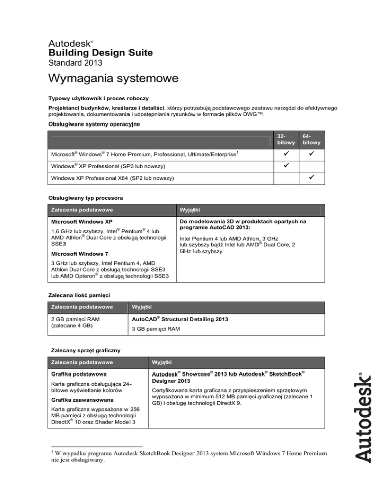 Autodesk Building Design Suite ® Standard 2013 Wymagania systemowe Typowy użytkownik i proces roboczy Projektanci budynków, kreślarze i detaliści, którzy potrzebują podstawowego zestawu narzędzi do efektywnego projektowania, dokumentowania i udostępniania rysunków w formacie plików DWG™. Obsługiwane systemy operacyjne ® ® Microsoft Windows 7 Home Premium, Professional, Ultimate/Enterprise 1 32bitowy 64bitowy ® Windows XP Professional (SP3 lub nowszy) Windows XP Professional X64 (SP2 lub nowszy) Obsługiwany typ procesora Zalecenia podstawowe Wyjątki Microsoft Windows XP ® ® 1,6 GHz lub szybszy, Intel Pentium 4 lub AMD Athlon® Dual Core z obsługą technologii SSE3 Microsoft Windows 7 Do modelowania 3D w produktach opartych na programie AutoCAD 2013: Intel Pentium 4 lub AMD Athlon, 3 GHz ® lub szybszy bądź Intel lub AMD Dual Core, 2 GHz lub szybszy 3 GHz lub szybszy, Intel Pentium 4, AMD Athlon Dual Core z obsługą technologii SSE3 ® lub AMD Opteron z obsługą technologii SSE3 Zalecana ilość pamięci Zalecenia podstawowe Wyjątki 2 GB pamięci RAM (zalecane 4 GB) AutoCAD Structural Detailing 2013 ® 3 GB pamięci RAM Zalecany sprzęt graficzny Zalecenia podstawowe Wyjątki Grafika podstawowa Autodesk Showcase 2013 lub Autodesk SketchBook Designer 2013 Karta graficzna obsługująca 24bitowe wyświetlanie kolorów Grafika zaawansowana ® ® ® ® Certyfikowana karta graficzna z przyspieszeniem sprzętowym wyposażona w minimum 512 MB pamięci graficznej (zalecane 1 GB) i obsługę technologii DirectX 9. Karta graficzna wyposażona w 256 MB pamięci z obsługą technologii ® DirectX 10 oraz Shader Model 3 1 W wypadku programu Autodesk SketchBook Designer 2013 system Microsoft Windows 7 Home Premium nie jest obsługiwany. Zalecana rozdzielczość ekranu Zalecenia podstawowe Wyjątki 1280 x 1024 z obsługą trybu True Color Zalecany dysk twardy Zalecenia podstawowe Wyjątki 24 GB wolnego miejsca Urządzenie wskazujące Zalecenia podstawowe Wyjątki Urządzenie zgodne ze standardem MS-Mouse Autodesk Showcase 2013 Mysz trzyprzyciskowa Autodesk Sketchbook Designer 2013 ® Rysownica Intuos 3 lub nowsza bądź wysoce zalecana rysownica ® ® aktywna Wacom Cintiq ze sterownikiem 6.1.6-7 lub nowszym. ™ Dla użytkowników rysownicy Bamboo zalecany jest sterownik 5.2.4-5. Przeglądarka Zalecenia podstawowe ® Wyjątki ® Microsoft Internet Explorer 8.0 lub nowszy Multimedia Zalecenia podstawowe Wyjątki USB 2.0 Sieć Zalecenia podstawowe Wyjątki Połączenie internetowe w celu uzyskania dostępu do pełnej dokumentacji użytkownika i usług subskrypcyjnych w sieci WWW Inny Zalecenia podstawowe Wyjątki ® Microsoft .NET Framework w wersji 2.0 (zawarty w instalacji) Autodesk, AutoCAD, Showcase and Sketchbook are registered trademarks or trademarks of Autodesk, Inc., and/or its subsidiaries and/or affiliates in the USA and/or other countries. All other brand names, product names, or trademarks belong to their respective holders. Autodesk reserves the right to alter product and services offerings, and specifications and pricing at any time without notice, and is not responsible for typographical or graphical errors that may appear in this document. © 2012 Autodesk, Inc. All rights reserved.