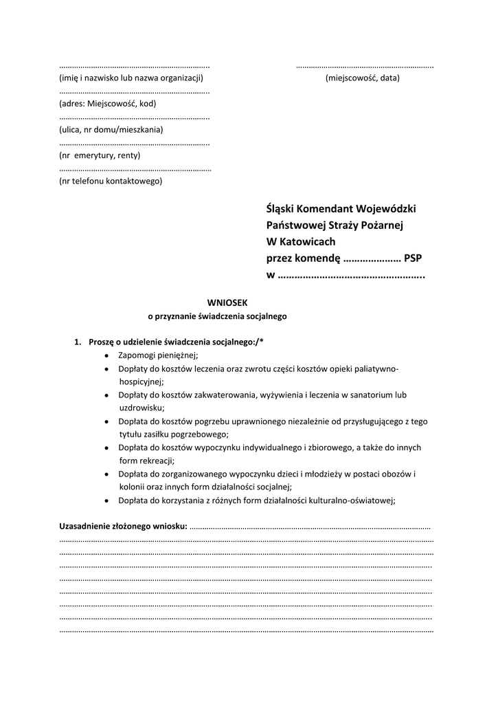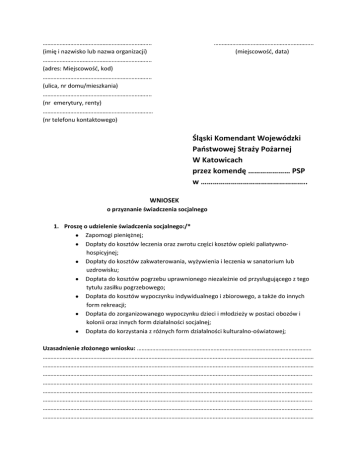 …………………………………………………………….. (imię i nazwisko lub nazwa organizacji) …………………………………………………………….. (adres: Miejscowość, kod) …………………………………………………………….. (ulica, nr domu/mieszkania) …………………………………………………………….. (nr emerytury, renty) ……………………………………………………………… (nr telefonu kontaktowego) ……………………………………………………….. (miejscowość, data) Śląski Komendant Wojewódzki Państwowej Straży Pożarnej W Katowicach przez komendę ………………… PSP w …………………………………………….. WNIOSEK o przyznanie świadczenia socjalnego 1. Proszę o udzielenie świadczenia socjalnego:/* Zapomogi pieniężnej; Dopłaty do kosztów leczenia oraz zwrotu części kosztów opieki paliatywnohospicyjnej; Dopłaty do kosztów zakwaterowania, wyżywienia i leczenia w sanatorium lub uzdrowisku; Dopłata do kosztów pogrzebu uprawnionego niezależnie od przysługującego z tego tytułu zasiłku pogrzebowego; Dopłata do kosztów wypoczynku indywidualnego i zbiorowego, a także do innych form rekreacji; Dopłata do zorganizowanego wypoczynku dzieci i młodzieży w postaci obozów i kolonii oraz innych form działalności socjalnej; Dopłata do korzystania z różnych form działalności kulturalno-oświatowej; Uzasadnienie złożonego wniosku: …………………………………………………………………………………………………… …………………………………………………………………………………………………………………………………………………………… …………………………………………………………………………………………………………………………………………………………… ………………………………………………………………………………………………………………………………………………………….. ………………………………………………………………………………………………………………………………………………………….. ………………………………………………………………………………………………………………………………………………………….. ………………………………………………………………………………………………………………………………………………………….. ………………………………………………………………………………………………………………………………………………………….. …………………………………………………………………………………………………………………………………………………………… 2. Osoby na utrzymaniu wnioskodawcy: Imię i nazwisko Wiek Stopień pokrewieństwa Oświadczam również, że podane wyżej dane są prawdziwe i zgodne ze stanem faktycznym. ………….…………………………………………….. (podpis wnioskodawcy) Załączniki: …………………………………………….. …………………………………………….. …………………………………………….. Opinia Komisji Socjalnej co do sposobu załatwienia wniosku: Komisja na posiedzeniu w dniu …………………………….. proponuje: Przyznać – nie przyznać ………………………………………………………………………………………………………….. W wysokości ……………………. (słownie: ……………………………………………………………………………………) Katowice, dnia …………………….. Komisja Socjalna …………………………………………………. Decyzja kierownika jednostki organizacyjnej Przyznaję świadczenie socjalne w wysokości ………………………. (słownie - ……………………………………………………………………………………………………………...)/* Nie przyznaję świadczenia socjalnego/* Katowice, dnia ……………………… /* - niepotrzebne skreślić Załącznik do wniosku o przyznanie świadczeń socjalnych ………………………, dnia ………………. Opinia Komendanta Miejskiego (Powiatowego) PSP Nazwisko i imię wnioskodawcy …………………………………………………………………………………………………………… Data urodzenia uprawnionego …………………………………………………………………………………………………………… Dokładny adres zamieszkania wnioskodawcy : Miejscowość - ……………………………………………….. Kod - ………………………………………………………………. Ulica - …………………………………………………………….. Województwo - …………………………………………….. Telefon - ………………………………………………………… Lata pracy w straży …………………………………………………………………………………………………………………………….. Dochód (netto)*/: wnioskodawcy - …………………………………………….. współmałżonka (i)- ……………………………………….. dzieci**/ ………………………………………………………… Informacje na temat nauki (pracy) dzieci (wiek, rodzaj szkoły) …………………………………………………………… ………………………………………………………………………………………………………………………………………