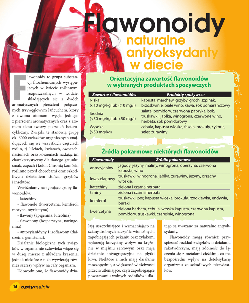 F lawonoidy to grupa substancji fitochemicznych występujących w świecie roślinnym, rozpuszczalnych w wodzie, składających się z dwóch aromatycznych pierścieni połączonych trzywęglowym łańcuchem, który z dwoma atomami węgla jednego z pierścieni aromatycznych oraz z atomem tlenu tworzy pierścień heterocykliczny. Związki te stanowią grupę ok. 6000 związków organicznych znajdujących się we wszystkich częściach roślin, tj. liściach, kwiatach, owocach, nasionach oraz korzeniach nadając im charakterystyczny dla danego gatunku smak, zapach i kolor. Chronią komórki roślinne przed chorobami oraz szkodliwym działaniem słońca, grzybów i insektów. Wyróżniamy następujące grupy flawonoidów: - katechiny - flawonole (kwercetyna, kemferol, moryna, myricetyna) - flawony (apigenina, luteolina) - flawonony (hesperytyna, naringenina) - antocyjanidyny i izoflawony (daidzeina, genisteina). Działanie biologiczne tych związków w organizmie człowieka wiąże się w dużej mierze z układem krążenia, jednak niektóre z nich wywierają również szerszy wpływ na cały organizm. Udowodniono, że flawonoidy dzia14 Orientacyjna zawartość flawonoidów w wybranych produktach spożywczych Zawartość flawonoidów Niska (<10 mg/kg lub <10 mg/l) Średnia (<50 mg/kg lub <50 mg/l) Wysoka (>50 mg/kg) Produkty spożywcze kapusta, marchew, grzyby, groch, szpinak, brzoskwinie, białe wino, kawa, sok pomarańczowy sałata, pomidory, czerwona papryka, bób, truskawki, jabłka, winogrona, czerwone wino, herbata, sok pomidorowy cebula, kapusta włoska, fasola, brokuły, cykoria, seler, żurawiny Źródła pokarmowe niektórych flawonoidów Flawonoidy Źródło pokarmowe jagody, jeżyny, maliny, winogrona, oberżyna, czerwona antocyjaniny kapusta, wino truskawki, winogrona, jabłka, żurawiny, jeżyny, orzechy kwas elagowy włoskie, katechiny zielona i czarna herbata taniny zielona i czarna herbata truskawki, por, kapusta włoska, brokuły, rzodkiewka, endywia, kemferol buraki zielona herbata, cebula, włoska kapusta, czerwona kapusta, kwercetyna pomidory, truskawki, czereśnie, winogrona łają uszczelniająco i wzmacniająco na ściany drobnych naczyń krwionośnych, zapobiegają ich pękaniu oraz żylakom, wykazują korzystny wpływ na krążenie w mięśniu sercowym oraz mają działanie antyagregacyjne na płytki krwi. Niektóre z nich mają działanie moczopędnie, a większość właściwości przeciwutleniające, czyli zapobiegające powstawaniu wolnych rodników i dla- tego są uważane za naturalne antyoksydanty. Flawonoidy mogą również przyspieszać rozkład związków o działaniu rakotwórczym, mają zdolność do łączenia się z metalami ciężkimi, co ma bezpośredni wpływ na detoksykację organizmu ze szkodliwych pierwiastków. Źródła flawonoidów w diecie Źródłem flawonoidów w diecie są: warzywa, owoce, wino, herbata, zioła oraz niektóre przyprawy. Najlepszym źródłem są: katechin – herbata, jabłka, morele, wiśnie; flawonoli – cebula, brokuły, kapusta włoska, jabłka, jagody, wiśnie, czerwone wino, herbata; flawonów – pietruszka i tymianek; flawononów – szczególnie cytrusy (pomarańcze, grejpfruty, cytryny); antocyjanidyny – czerwone wino, jagody, ciemne winogrona; izoflawonów – tylko nasiona roślin strączkowych (fasola, groch, fasolka szparagowa, soja). Wpływ obróbki termicznej na zawartość flawonoidów Jak wykazano w badaniach obróbka termiczna nie ma dużego wpływu na zawartość flawonów i flawonoli. Podczas obróbki cieplnej stwierdzono niewielkie wahania kwercetyny i kemferolu w cebuli, fasoli i groszku między próbkami gotowanymi w wodzie, kuchence mikrofalowej, smażonymi na maśle lub oleju . Tylko poniżej 20% związków uległo rozkładowi. Wino – białe czy czerwone? Doskonałym źródłem bioflawono idów w diecie jest wino. Jednak istotne, udokumentowane znaczenie dla organizmu człowieka, ma wino czerwone. Zawarte w winie antocyjanidyny pochodzą w znaczącym stopniu ze skórek winogron obecnych podczas procesu produkcyjnego wina. Skórki te obecne są podczas produkcji tylko czerwonego wina dlatego jest ono bogatsze w te związki w odróżnieniu od wina białego. Od dawna naukowcy zastanawiali się dlaczego w krajach takich jak Francja, gdzie spożycie wina jest znaczne, występuje mniejsza zachorowalność Zawartość związków fenolowych w mg/l Wszystkie związki fenolowe Pozostałe związki fenolowe Flawonoidy Czerwone wino Białe wino Piwo Sok z winogron 1442 327 341 1702 490 293 327 519 952 34 14 1183 na choroby związane z układem krążenia. Uważano, że spożycie alkoholu we Francji (ze względu na duże spożycie wina) ok. 20-30 g na dobę może znacznie obniżyć ryzyko chorób serca, głównie dzięki podwyższeniu w surowicy frakcji HDL cholesterolu. Jednak stężenie HDL w populacji francuskiej nie jest wyższe niż w innych krajach. Tak więc można wysnuć wnioski, że na zapobieganie miażdżycy oraz choroby niedokrwienne serca mają wpływ niealkoholowe polifenolowe związki zawarte w czerwonym winie, takie jak: kwercetyna, myricetyna, ketechina i epigallokatechina. Działanie przeciwmiażdżycowe tych związków tłumaczone jest ich silnym działaniem antyoksydacyjnym. W badaniach invitro pobudzają one wzrost aktywności antyoksydacyjnej osocza i mogą zmniejszać podatność frakcji LDL na oksydację. Obserwowano zahamowanie oksydacji LDL nawet o 60-98% w zależności od ich stężenia. Flawono idy zawarte w czerwonym winie wydają się być bardziej aktywne niż alfatokoferol, który w badaniach osiągnął tylko 60% aktywności wina i kwercetyny. Wino rozcieńczone 1000-krotnie, zawierając 10 µmol/l substancji fenolowych, hamowało oksydację LDL bardziej niż alfa- tokoferol. Na temat korzystnego działania wina wykonano wiele prac naukowych. Jedną z nich była praca, w której dziesięć zdrowych osób spożywało posiłek z dodatkiem czerwonego wina. Grupą kontrolną 