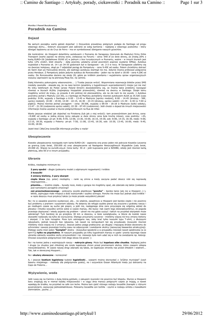 :: Camino de Santiago :: Artykuły, porady, ciekawostki :: Poradnik na Camino :: Page 1 sur 3 Monika i Paweł Buczkowscy Poradnik na Camino Dojazd Na samym początku warto gdzieś dojechać :) Oczywiście prawdziwy pielgrzym podąża do Santiago od progu własnego domu... Dobrym zwyczajem jest zabranie ze sobą kamienia - najlepiej z własnego podwórka - który dźwigać będziemy aż do Cruz de Ferro - ma on symbolizować dźwiganie naszych grzechów. Ale konkretnie: do Hiszpanii dotarliśmy autobusem z Poznania do Saragossy (kierunek do Madrytu) firmy Orbis Transport (warto zajrzeć na stronę www, zwłaszcza na Forum) - cena: 640 zł (w dwie strony, ze znizką 20% z kartą EURO<26 [dodatkowe 55/60 zł] w jednym z biur turystycznych w Poznaniu, ważne - w innych biurach jest tylko 12% zniżki!, bilet otwarty - datę powrotu ustalamy przed powrotem poprzez wysłanie SMSa). Autobus wyjeżdżał z Poznania ok. 14 i po 34-35 godzinach był w Saragossie - ok. 2-3 w nocy. W Saragossie udaliśmy się na dworzec kolejowy, skąd po 7 odjeżdżał pociąg do Pampeluny - cena 9.45€ od osoby. Potem chcieliśmy dotrzeć do Saint Jean po francuskiej stronie, ale żadnego autobusu stamtąd nie ma. Jedynie można próbować połączenia przez Hendaye. Z Pampeluny jedzie jedynie autobus do Roncesvalles - jeden raz na dzień o 18:00 - cena 4.20€ od osoby. Do Roncesvalles dociera się około 20, gdzie po krótkim powitaniu i wyjaśnieniu spraw organizacyjnych wszyscy zaproszeni są na pierwszą Mszę Św. na camino. Dalej kilometry pokonujemy własnonożnie... :) Trzeba jeszcze wrócić. Wspomniana rezerwacja biletów przez SMS niestety zawiodła - okazało się, że na nasz termin (pisaliśmy z tygodniowym wyprzedzeniem!) miejsc już nie ma! Po kilku telefonach do Polski (przez Poland Direct!) dowiedzieliśmy się, że można takie problemy rozwiązać również w biurach ALSAy (największy hiszpański przewoźnik), również na dworcu w Santiago. Dzięki temu mogliśmy wrócić do kraju, co prawda 4 dni później niż planowaliśmy, ale na złe nam to nie wyszło :) Autobus powrotny jechał z Madrytu (22:30), a z Santiago do Madrytu jechaliśmy również autobusem ALSA za 35.42€ (czas podróży: 8-9h, wyjazdy z Santiago o 6:00 - 13:45 w Madrycie [oprócz niedziel], 8:00 - 14:45 [droższy - 50€, oprócz niedziel], 10:00 - 19:00, 14:00 - 22:15, 16:30 - 23:15 [droższy, oprócz sobót] i 21:30 - 6:30 [o 7:00 w piątki]). Można również jechać pociągiem - cena: 38.50€, wyjazdy o 09:54 - 18:18 w Madrycie (tylko soboty), 13:47 - 21:30 (codziennie oprócz sobót), 22:30 - 07:45 (codziennie). Jeśli chodzi o dojazd do innych miejscowości informacje można uzyskać w biurze pielgrzymkowym na Rua de Villar. Warto jeszcze wiedzieć jak dojechać na Finisterrę (lub jak z niej wrócić): tam przewoźnikiem jest Arriva, cena: ~9.60€ od osoby w jedną stronę (przy zakupie w dwie strony cena była trochę niższa), czas podróży: ~2h, wyjazdy z Santiago: pn-pt: 8:00, 9:45, 12:00, 13:30, 15:00, 16:15, 19:30, sob: 8:00, 14:15, 16:30, niedz: 9:00, 12:15, 18:30, wyjazdy z Fisterry: pn-pt: 7:50, 11:00, 13:45, 16:30, sob: 10:30, 13:45, 16:00, niedz: 9:45, 16:00, 18:00. Jeżeli ktoś zWasma świeższe informacje prosimy o maila! Ubezpieczenie Kwestie ubezpieczenia rozwiązała nam karta EURO<26 - zapewnia ona przez jeden rok pokrycie Kosztów Leczenia za granicą (cały świat, 250.000 zł) oraz ubezpieczenie od Następstw Nieszczęśliwych Wypadków (cały świat, 20.000 zł). Więcej na euro26.org.pl. Cena karty: 55 zł - jeśli kupowana jest w BZWBK, wtedy jest również kartą płatniczą, albo 60 zł w innym przypadku. Ubranie Krótko, niezbędne minimum to: 2 pary spodni - długie (polecamy model z odpinanymi nogawkami) i krótkie 3 koszulki 3 zmiany bielizny, 3 pary skarpet ciepła bluza (np. polar) niezbędny - ranki są zimne a kiedy zaczyna padać deszcz robi się naprawdę nieprzyjemnie... piżamka... - średnio ciepła... bywały noce, kiedy z gorąca nie mogliśmy spać, ale zdarzało się także (zwłaszcza pod namiotami) porządnie zmarznąć! coś przeciwdeszczowego - polecamy zwykłe plastikowe "poncho" - bardzo tanie (ale nie w Hiszpanii ;) ), lekkie, zajmujące mało miejsca a dość wytrzymałe i szybko schnące. Poncho nie może być jednak zbyt krótkie w razie deszczu musi przykryć także (a może przede wszystkim) plecak! No i to w zasadzie powinno wystarczyć, ale... no właśnie, zasadniczo w Hiszpanii jest bardzo ciepło i nie powinno być problemu z praniem i suszeniem odzieży. Po dotarciu do refugio szybko pierze się zrzucone z grzbietu rzeczy i po niedługim czasie są suche jak pieprz, a jeśli nie, następnego dnia rano przyczepia się wilgotną odzież do plecaka i milutko wszystko schnie sobie w czasie marszu. Ale bywa i tak (sami tego doświadczyliśmy), że pogoda przestaje dopisywać i wtedy pojawia się problem - ubrań nie ma gdzie suszyć i takich na przykład skarpetek może zabraknąć! Tym bardziej że po przejściu 30 km w deszczu, w lesie eukaliptusów, w błocie do kostek nasze skarpetki nadawały się tylko do wyrzucenia. Dlatego przyznamy szczerze - mieliśmy więcej niż trzy zmiany bielizny i skarpet. I to było rozsądne. Poza tym ostrzegano nas, żeby brać tylko koszulki typu T-shirt, z dłuższymi rękawkami, jednak koszulki bez rękawów, lub nawet na ramiączkach też się przydawały (koszulek również mieliśmy nieco więcej niż 3 zmiany). Jeszcze jedna uwaga praktyczna: po długiej i męczącej drodze docieramy do schroniska i zawsze pozostaje trochę czasu na odpoczynek i zwiedzanie okolicy (zazwyczaj baaaardzo atrakcyjnej). Dlatego warto mieć jeden "komplet" ekstra - (koszulka+spodenki a w przypadku niewiast nawet spódniczka [a co tam!!!]) tylko na popołudnia. W naszym przypadku po kilku tygodniach marszu w upale i prania ręcznego nasze ubranka zatraciły wszelkie cechy przyzwoitości i np. nieswojo było nam udać się w nich na zwied
