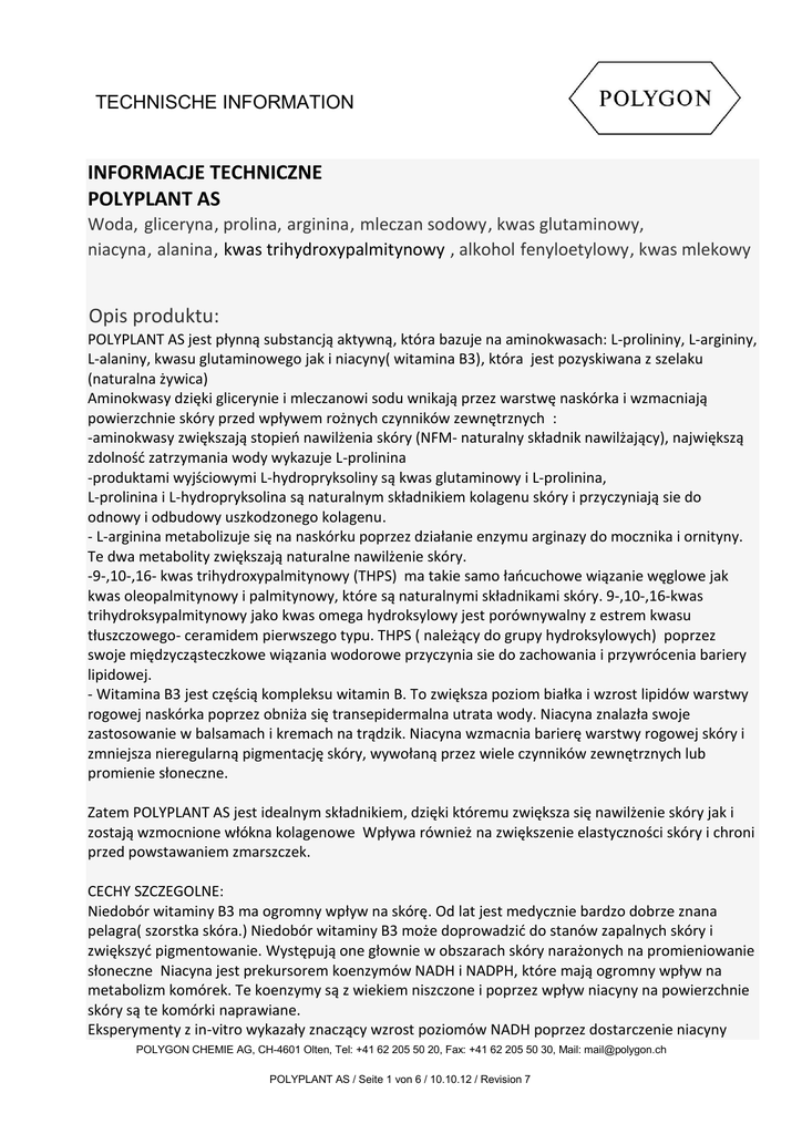 TECHNISCHE INFORMATION INFORMACJE TECHNICZNE POLYPLANT AS Woda, gliceryna, prolina, arginina, mleczan sodowy, kwas glutaminowy, niacyna, alanina, kwas trihydroxypalmitynowy , alkohol fenyloetylowy, kwas mlekowy Opis produktu: POLYPLANT AS jest płynną substancją aktywną, która bazuje na aminokwasach: L-prolininy, L-argininy, L-alaniny, kwasu glutaminowego jak i niacyny( witamina B3), która jest pozyskiwana z szelaku (naturalna żywica) Aminokwasy dzięki glicerynie i mleczanowi sodu wnikają przez warstwę naskórka i wzmacniają powierzchnie skóry przed wpływem rożnych czynników zewnętrznych : -aminokwasy zwiększają stopień nawilżenia skóry (NFM- naturalny składnik nawilżający), największą zdolność zatrzymania wody wykazuje L-prolinina -produktami wyjściowymi L-hydropryksoliny są kwas glutaminowy i L-prolinina, L-prolinina i L-hydropryksolina są naturalnym składnikiem kolagenu skóry i przyczyniają sie do odnowy i odbudowy uszkodzonego kolagenu. - L-arginina metabolizuje się na naskórku poprzez działanie enzymu arginazy do mocznika i ornityny. Te dwa metabolity zwiększają naturalne nawilżenie skóry. -9-,10-,16- kwas trihydroxypalmitynowy (THPS) ma takie samo łańcuchowe wiązanie węglowe jak kwas oleopalmitynowy i palmitynowy, które są naturalnymi składnikami skóry. 9-,10-,16-kwas trihydroksypalmitynowy jako kwas omega hydroksylowy jest porównywalny z estrem kwasu tłuszczowego- ceramidem pierwszego typu. THPS ( należący do grupy hydroksylowych) poprzez swoje międzycząsteczkowe wiązania wodorowe przyczynia sie do zachowania i przywrócenia bariery lipidowej. - Witamina B3 jest częścią kompleksu witamin B. To zwiększa poziom białka i wzrost lipidów warstwy rogowej naskórka poprzez obniża się transepidermalna utrata wody. Niacyna znalazła swoje zastosowanie w balsamach i kremach na trądzik. Niacyna wzmacnia barierę warstwy rogowej skóry i zmniejsza nieregularną pigmentację skóry, wywołaną przez wiele czynników zewnętrznych lub promienie słoneczne. Zatem POLYPLANT AS jest idealnym składnikiem, dzięki któremu zwiększa się nawilżenie skóry jak i zostają wzmocnione włókna kolagenowe Wpływa również na zwiększenie elastyczności skóry i chroni przed powstawaniem zmarszczek. CECHY SZCZEGOLNE: Niedobór witaminy B3 ma ogromny wpływ na skórę. Od lat jest medycznie bardzo dobrze znana pelagra( szorstka skóra.) Niedobór witaminy B3 może doprowadzić do stanów zapalnych skóry i zwiększyć pigmentowanie. Występują one głownie w obszarach skóry narażonych na promieniowanie słoneczne Niacyna jest prekursorem koenzymów NADH i NADPH, które mają ogromny wpływ na metabolizm komórek. Te koenzymy są z wiekiem niszczone i poprzez wpływ niacyny na powierzchnie skóry są te komórki naprawiane. Eksperymenty z in-vitro wykazały znaczący wzrost poziomów NADH poprzez dostarczenie niacyny POLYGON CHEMIE AG, CH-4601 Olten, Tel: +41 62 205 50 20, Fax: +41 62 205 50 30, Mail: [email protected] POLYPLANT AS / Seite 1 von 6 / 10.10.12 / Revision 7 TECHNISCHE INFORMATION starszym komórkom. Niacyna może wpłynąć na zwiększenie syntezy lipidów warstwy rogowej, co zmniejsza utratę wody przez skórę. Niacyna znacząco zmniejsza również uszkodzenia warstwy zewnętrznej skóry, które mogą być wywołane przez działanie laurylosiarczanu sodu. Zwiększa się również zawartość białka w naskórku. Dlatego niacyna jest stosowana w produkcji kremów do twarzy, które działają wygładzająco i wpływają na pigment skóry. Najnowsze testy potwierdzają wygładzające i stabilizujące właściwości dla skóry. Nieregularna pigmentacja skóry zostaje zredukowana. Skóra jako bariera ochronna jest narażona na wiele obciążeń. Z wiekiem zostaje ta ochrona automatycznie osłabiona i właśnie dzięki pielęgnacji skóry można tego procesu uniknąć. Tu odgrywają znaczącą rolę lipidy, witaminy i aminokwasy. Z witamin największą rolę odgrywa niacyna. Charakteryzuje się to zwiększeniem ochronnej bariery skóry i samej struktury skóry. TOKSYKOLOGIA: AMINOKWASY: 1 L-arginina toksyczność ld50 ( doustnie) Kontakt ze skora: >16 g/kg nie działa drażniąco- badanie toksyczności ostrej Podrażnienia błon śluzowych/ podrażnienia oczu : nie działa drażniąco-badanie toksyczności ostrej Uczulenia: 2. L-prolina toksyczność ld50 ( doustnie): 3. L-alanina toksyczność ld50 ( doustnie): 1. kwas L-glutaminowy toksyczność : nie wywołuje uczuleń >16 g/kg ( testy na szczurach) >16 g/kg ( testy na szczurach) >21 g/kg ( testy na szczurach) Kwas L-glutaminowy wchodzi w 45 % w skład białek roślinnych. Kwas ten znalazł zastosowanie w wielu dodatkach do żywności E620- E625.Kwas L-glutaminowy znajduje się w dużych ilościach w żółtym serze, szynce, mięsie indyczym i z kurczaka oraz w mleku i jajkach. Kwas ten powstaje poprzez hydrolizę białek roślinnych. Zamiana tego kwasu w glutaminę jest bardzo ważna w regulacji, wydalaniu i niszczeniu amoniaku w organizmie. Glutamina jest najważniejszym źródłem energii w POLYGON CHEMIE AG, CH-4601 Olten, Tel: +41 62 205 50 20, Fax: +41 62 205 50 30, Mail: [email protected] POLYPLANT AS / Seite 2 von 6 / 10.10.12 / Revision 7 TECHNISCHE INFORMATION komórkach organizmu. Niacyna: nie działa drażniąco- badanie Podrażnienia skóry : toksyczności ostrej Podrażnienia błon śluzowych i oczu: ostrej- jako proszek Uczulenia: Toksyczność podchroniczna: Amesa) działa drażniąco- badanie toksyczności nie wywołuje uczuleń nie wywołuje mutacji ( test 9-,10-,16- kwas trihydroxypalmitynowy (THPS) Używany jest między innymi w karmieniu pozajelitowym (z pominięciem przewodu pokarmowego). Jest powszechnie stosowany w dietetyce. Jest nietoksyczny i tworzy ochronną powłokę na jelitach, znajduje się w nasionach, owocach cytrusowych i jabłkach. Znalazł również zastosowanie przy produkcji perfum takich jak cybet i ambretolid. Fenyloetanol 2 (alkohol f