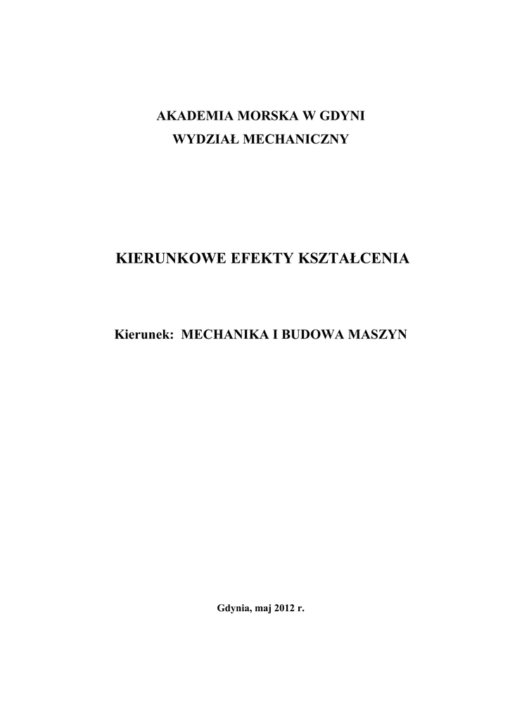 AKADEMIA MORSKA W GDYNI WYDZIAŁ MECHANICZNY KIERUNKOWE EFEKTY KSZTAŁCENIA Kierunek: MECHANIKA I BUDOWA MASZYN Gdynia, maj 2012 r. SPIS TRESCI Strona I. STUDIA PIERWSZEGO STOPNIA ROFIL PRAKTYCZNY ………………………….. 2 1. Ogólna charakterystyka prowadzonych studiów …………………………………. ……... 2 2. Efekty kształcenia dla programu kształcenia …………………………………………….. 2 2b.Tabela pokrycia obszarowych efektów kształcenia przez kierunkowe efekty kształcenia …8 3. Program studiów …………………………………………………………………………. 10 II. STUDIA PIERWSZEGO STOPNIA PROFIL OGÓLNOAKADEMICKI …………….. 12 1. Ogólna charakterystyka prowadzonych studiów ………………………………………… 12 2. Efekty kształcenia dla programu kształcenia ……………………………………………. 12 2b.Tabela pokrycia obszarowych efektów kształcenia przez kierunkowe efekty kształcenia .. 16 3. Program studiów ………………………………………………………………………… 19 III. STUDIA DRUGIEGO STOPNIA PROFIL PRAKTYCZNY …………………………. 20 1. Ogólna charakterystyka prowadzonych studiów ………………………………………… 20 2. Efekty kształcenia dla programu kształcenia …………………………………………….. 21 2b.Tabela pokrycia obszarowych efektów kształcenia przez kierunkowe efekty kształcenia .. 25 3. Program studiów …………………………………………………………………………. 29 IV. STUDIA DRUGIEGO STOPNIA PROFIL OGÓLNOAKADEMICKI …………………31 1. Ogólna charakterystyka prowadzonych studiów ………………………………………… 31 2. Efekty kształcenia dla programu kształcenia ……………………………………………. 31 2b.Tabela pokrycia obszarowych efektów kształcenia przez kierunkowe efekty kształcenia .. 35 3. Program studiów …………………………………………………………………………. 38 V. WARUNKI REALIZACJI PROGRAMU STUDIÓW ………………………………….. 39 VI. WEWNĘTRZNY SYSTEM ZAPEWNIENIA JAKOŚCI KSZTAŁCENIA ………….... VII. Inne dokumenty ………………………………………………………………………….. 40 VIII. Związek kierunku studiów z misją Akademii Morskiej w Gdyni ……………………… 41 1 I. STUDIA PIERWSZEGO STOPNIA PROFIL PRAKTYCZNY specjalność – EKSPLOATACJA SIŁOWNI OKRĘTOWYCH I OBIEKTÓW OCEANOTECHNICZNYCH (ESOiOO) 1. OGÓLNA CHARAKTERYSTYKA PROWADZONYCH STUDIÓW a) nazwa kierunku studiówa. - MECHANIKA I BUDOWA MASZYN b) poziom kształcenia - studia pierwszego stopnia c) profil kształcenia – profil praktyczny d) forma studiów – studia stacjonarne i niestacjonarne e) tytuł zawodowy uzyskiwany przez absolwenta – inżynier f) obszar kształcenia - obszar studiów technicznych g) dziedzina nauki - dziedzina nauk technicznych h) dyscyplina naukowa – budowa i eksploatacja maszyn 2. EFEKTY KSZTAŁCENIA DLA PROGRAMU KSZTAŁCENIA - STUDIA PIERWSZEGO STOPNIA – PROFIL PRAKTYCZNY a) Cele kształcenia - profil praktyczny Celem kształcenia jest uzyskanie przez absolwenta kwalifikacji pierwszego stopnia oraz przygotowanie do bezpiecznej pracy na statku w charakterze oficera mechanika okrętowego na poziomie operacyjnym i zarządzania. Absolwent jest przygotowany do: (1) realizacji procesów wytwarzania, montażu i eksploatacji maszyn, (2) prac wspomagających projektowanie prostych zadań inżynierskich, doboru materiałów inżynierskich stosowanych jako elementy maszyn oraz nadzór nad ich eksploatacją, (3) pracy w zespole, (4) diagnostyki stanu technicznego poszczególnych maszyn i urządzeń energetycznych oraz instalacji przemysłowych, (5) organizowania, zarządzania i wykonywania remontów urządzeń energetycznych oraz instalacji przemysłowych, (6) koordynacji prac związanych z eksploatacją, (7) podjęcia studiów drugiego stopnia oraz dodatkowo do (8) obsługiwania siłowni okrętowych na poziomie operacyjnym, potwierdzone dyplomem oficera mechanika wachtowego wydanego przez odpowiedni organ administracji morskiej, (9). Absolwenci są predysponowani do pracy w: (1) składzie członków załóg obiektów pływających jako oficer mechanik okrętowy, (2) przedsiębiorstwach przemysłu okrętowego oraz innych zajmujących się wytwarzaniem i eksploatacją maszyn oraz układów mechaniki okrętowej, (3) stoczniach produkcyjnych i remontowych, (4) służbach technicznych towarzystw klasyfikacyjnych, (5) służbach dozoru technicznego armatorów, (6) innych jednostkach gospodarczych, administracyjnych i edukacyjnych wymagających wiedzy technicznej i informatycznej. Absolwent uzyskuje kwalifikacje pierwszego stopnia, otrzymuje tytuł zawodowy inżyniera oraz uprawnienia do uzyskania dyplomu mechanika okrętowego na poziomie zarządzania. 2 Program kształcenia dla profilu praktycznego musi spełniać wymagania zawarte w Rozporządzeniu Ministra właściwego do spraw gospodarki morskiej w sprawie programów szkoleń i wymagań egzaminacyjnych w zakresie kwalifikacji zawodowych marynarzy. Program kształcenia dla profilu praktycznego musi spełniać wymagania Międzynarodowej Konwencji w Sprawie Norm Szkolenia, Wydawania Świadectw i Pełnienia Wacht dla Marynarzy (STCW 78/95) oraz wymagania Unii Europejskiej zawarte w regulacji EMSA (European Maritime Safety Agency). b) KIERUNKOWE EFEKTY KSZTAŁCENIA I ICH ODNIESIENIE DO EFEKTÓW W OBSZARZE KSZTAŁCENIA W ZAKRESIE NAUK TECHNICZNYCH Absolwent studiów pierwszego stopnia o profilu praktycznym posiada podstawową wiedzę i umiejętności konieczne do zrozumienia zagadnień z zakresu budowy, wytwarzania i eksploatacji maszyn i urządzeń okrętowych. Posiada gruntowną znajomość zasad mechaniki technicznej, wytrzymałości materiałów a także wiedzę szczegółową, profilo