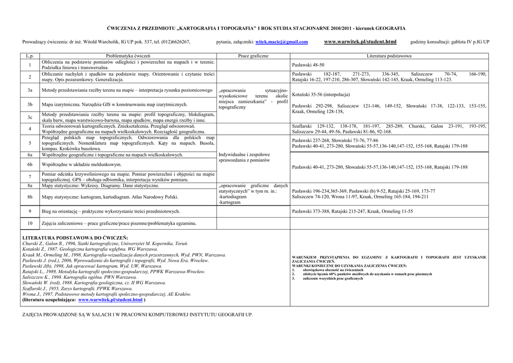 ĆWICZENIA Z PRZEDMIOTU „KARTOGRAFIA I TOPOGRAFIA” I ROK STUDIA STACJONARNE 2010/2011 - kierunek GEOGRAFIA Prowadzący ćwiczenia: dr inŜ. Witold Warcholik, IG UP pok. 537, tel. (012)6626267, L.p. 1 2 Problematyka ćwiczeń Obliczenia na podstawie pomiarów odległości i powierzchni na mapach i w terenie. Podziałka liniowa i transwersalna. Obliczanie nachyleń i spadków na podstawie mapy. Orientowanie i czytanie treści mapy. Opis pozaramkowy. Generalizacja. 3a Metody przedstawiania rzeźby terenu na mapie – interpretacja rysunku poziomicowego 3b Mapa izarytmiczna. Narzędzia GIS w konstruowaniu map izarytmicznych. 3c 4 5 6a 6b 7 8a 8b pytania, załączniki: [email protected] www.warwitek.pl/student.html Prace graficzne godziny konsultacji: gablota IV p.IG UP Literatura podstawowa Pasławski 48-50 Pasławski 182-187, 271-273, 336-345, Saliszczew 70-74, Ratajski 16-22, 197-210, 286-307, Słowański 142-145, Kraak, Ormeling 113-123. 166-190, „opracowanie sytuacyjnowysokościowe terenu okolic Kotański 35-56 (interpolacja) miejsca zamieszkania” - profil Pasławski 292-298, Saliszczew 121-146, 149-152, Słowański 17-38, 122-133, 153-155, topograficzny Kraak, Ormeling 128-138, Metody przedstawiania rzeźby terenu na mapie: profil topograficzny, blokdiagram, skala barw, mapa warstwicowo-barwna, mapa spadków, mapa energii rzeźby i inne. Teoria odwzorowań kartograficznych. Zniekształcenia. Przegląd odwzorowań. Współrzędne geograficzne na mapach wielkoskalowych. Rozciągłość geograficzna. Przegląd polskich map topograficznych. Odwzorowania dla polskich map topograficznych. Nomenklatura map topograficznych. Kąty na mapach. Busola, kompas. Krokówka busolowa. Indywidualne i zespołowe Współrzędne geograficzne i topograficzne na mapach wielkoskalowych. sprawozdania z pomiarów Współrzędne w układzie meldunkowym. Szaflarski 129-132, 138-178, 181-197, 285-289, Saliszczew 29-44, 49-56, Pasławski 81-86, 92-168. Churski, Galon 23-191, 193-195, Pasławski 237-268, Słowański 73-76, 77-86 Pasławski 40-41, 273-280, Słowański 55-57,136-140,147-152, 155-168, Ratajski 179-188 Pasławski 40-41, 273-280, Słowański 55-57,136-140,147-152, 155-168, Ratajski 179-188 Pomiar odcinka krzywoliniowego na mapie. Pomiar powierzchni i objętości na mapie topograficznej. GPS – obsługa odbiornika, interpretacja wyników pomiaru. Mapy statystyczne: Wykresy. Diagramy. Dane statystyczne. „opracowanie graficzne danych statystycznych” w tym m. in.: Pasławski 196-234,365-369, Pasławski (b) 9-52, Ratajski 25-169, 173-77 -kartodiagram Saliszczew 74-120, Wrona 11-97, Kraak, Ormeling 165-184, 194-211 Mapy statystyczne: kartogram, kartodiagram. Atlas Narodowy Polski. -kartogram 9 Bieg na orientację – praktyczne wykorzystanie treści przedmiotowych. 10 Zajęcia zaliczeniowe – prace graficzne/prace pisemne/problematyka egzaminu. LITERATURA PODSTAWOWA DO ĆWICZEŃ: Churski Z., Galon R., 1996, Siatki kartograficzne, Uniwersytet M. Kopernika, Toruń. Kotański Z., 1987. Geologiczna kartografia wgłębna. WG Warszawa. Kraak M., Ormeling M., 1998, Kartografia-wizualizacja danych przestrzennych, Wyd. PWN, Warszawa. Pasławski J. (red.), 2006, Wprowadzenie do kartografii i topografii, Wyd. Nowa Era, Wrocław. Pasławski J(b), 1998, Jak opracować kartogram, Wyd. UW, Warszawa. Ratajski L., 1989, Metodyka kartografii społeczno-gospodarczej, PPWK Warszawa-Wrocław. Saliszczew K., 1998. Kartografia ogólna. PWN Warszawa. Słowański W. (red), 1988. Kartografia geologiczna, cz. II WG Warszawa. Szaflarski J., 1955, Zarys kartografii. PPWK Warszawa. Wrona J., 1997, Podstawowe metody kartografii społeczno-gospodarczej, AE Kraków. (literatura uzupełniająca: www.warwitek.pl/student.html ) ZAJĘCIA PROWADZONE SĄ W SALACH I W PRACOWNI KOMPUTEROWEJ INSTYTUTU GEOGRAFII UP. Pasławski 373-388, Ratajski 215-247, Kraak, Ormeling 11-55 WARUNKIEM PRZYSTĄPIENIA DO EGZAMINU Z KARTOGRAFII I TOPOGRAFII JEST UZYSKANIE ZALICZANIA ĆWICZEŃ. WARUNKI KONIECZNE DO UZYSKANIA ZALICZENIA ĆWICZEŃ: 1. obowiązkowa obecność na ćwiczeniach 2. zdobycie łącznie 60% punktów moŜliwych do uzyskania w ramach prac pisemnych 3. zaliczenie wszystkich prac graficznych