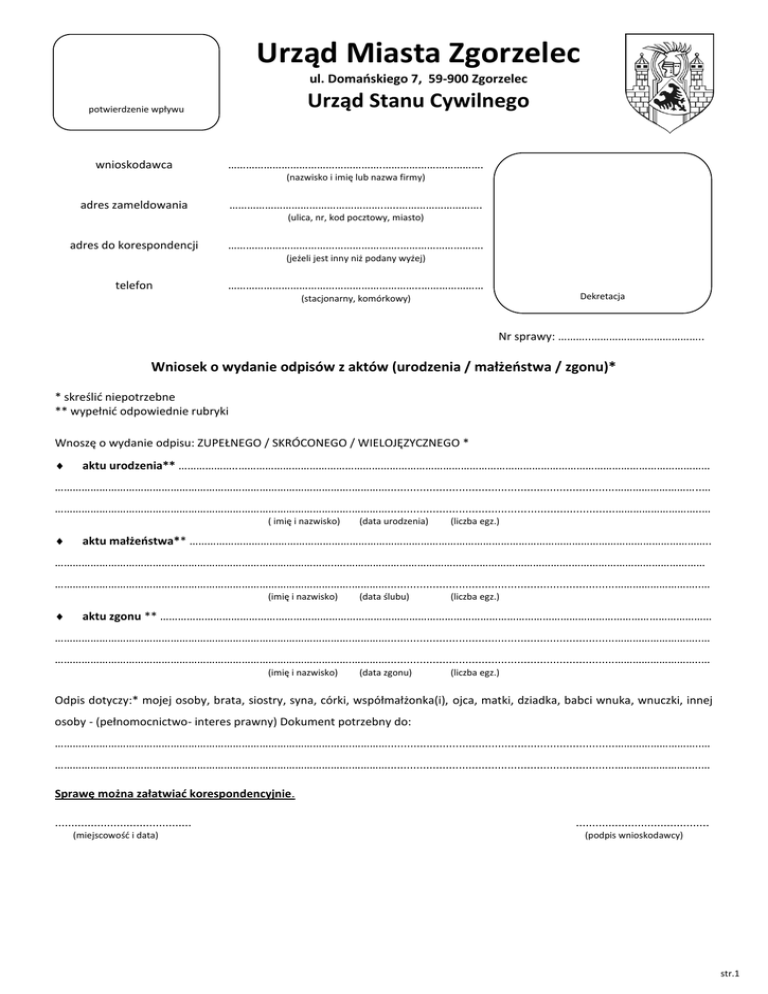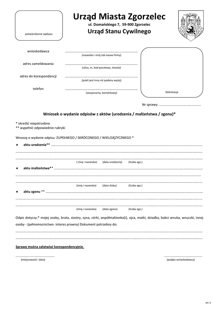 Urząd Miasta Zgorzelec ul. Domańskiego 7, 59-900 Zgorzelec Urząd Stanu Cywilnego potwierdzenie wpływu wnioskodawca …………………………………………….……………………………. (nazwisko i imię lub nazwa firmy) adres zameldowania …………………………………………….…..………………………. (ulica, nr, kod pocztowy, miasto) adres do korespondencji ………………………………………………….………………………. (jeżeli jest inny niż podany wyżej) telefon ………………………………………………………..………………… Dekretacja (stacjonarny, komórkowy) Nr sprawy: ………..……………………………….. Wniosek o wydanie odpisów z aktów (urodzenia / małżeństwa / zgonu)* * skreślić niepotrzebne ** wypełnić odpowiednie rubryki Wnoszę o wydanie odpisu: ZUPEŁNEGO / SKRÓCONEGO / WIELOJĘZYCZNEGO * aktu urodzenia** ………………..…………………………………………………………………………………………………………………………………………… ……………………………………………………………………………………….…………......................................................................………………………..… ……………………………………………………………………………………….…………......................................................................………………………..… ( imię i nazwisko) (data urodzenia) (liczba egz.) aktu małżeństwa** ………………………………………………………………………………………………………………………………………………………….. ………………………………………………………………………………….….………………………………………………………………….……………………………………… ……………………………………………………………………………………….…………......................................................................………………………..… (imię i nazwisko) (data ślubu) (liczba egz.) aktu zgonu ** …………………………………………………………………………………………………………………………………………………………………… ……………………………………………………………………………………….…………......................................................................………………………..… ……………………………………………………………………………………….…………......................................................................………………………..… (imię i nazwisko) (data zgonu) (liczba egz.) Odpis dotyczy:* mojej osoby, brata, siostry, syna, córki, współmałżonka(i), ojca, matki, dziadka, babci wnuka, wnuczki, innej osoby - (pełnomocnictwo- interes prawny) Dokument potrzebny do: ……………………………………………………………………………………….…………......................................................................………………………..… ……………………………………………………………………………………….…………......................................................................………………………..… Sprawę można załatwiać korespondencyjnie. .......................................... (miejscowość i data) ......................................... (podpis wnioskodawcy) str.1