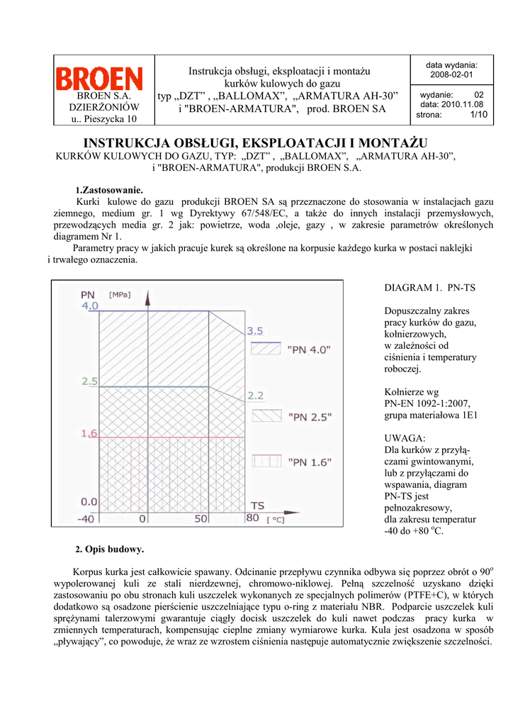 BROEN S.A. DZIERŻONIÓW u.. Pieszycka 10 Instrukcja obsługi, eksploatacji i montażu kurków kulowych do gazu typ „DZT” , „BALLOMAX”, „ARMATURA AH-30” i "BROEN-ARMATURA", prod. BROEN SA data wydania: 2008-02-01 wydanie: 02 data: 2010.11.08 strona: 1/10 INSTRUKCJA OBSŁUGI, EKSPLOATACJI I MONTAŻU KURKÓW KULOWYCH DO GAZU, TYP: „DZT” , „BALLOMAX”, „ARMATURA AH-30”, i "BROEN-ARMATURA", produkcji BROEN S.A. 1.Zastosowanie. Kurki kulowe do gazu produkcji BROEN SA są przeznaczone do stosowania w instalacjach gazu ziemnego, medium gr. 1 wg Dyrektywy 67/548/EC, a także do innych instalacji przemysłowych, przewodzących media gr. 2 jak: powietrze, woda ,oleje, gazy , w zakresie parametrów określonych diagramem Nr 1. Parametry pracy w jakich pracuje kurek są określone na korpusie każdego kurka w postaci naklejki i trwałego oznaczenia. DIAGRAM 1. PN-TS Dopuszczalny zakres pracy kurków do gazu, kołnierzowych, w zależności od ciśnienia i temperatury roboczej. Kołnierze wg PN-EN 1092-1:2007, grupa materiałowa 1E1 UWAGA: Dla kurków z przyłączami gwintowanymi, lub z przyłączami do wspawania, diagram PN-TS jest pełnozakresowy, dla zakresu temperatur -40 do +80 oC. 2. Opis budowy. Korpus kurka jest całkowicie spawany. Odcinanie przepływu czynnika odbywa się poprzez obrót o 90o wypolerowanej kuli ze stali nierdzewnej, chromowo-niklowej. Pełną szczelność uzyskano dzięki zastosowaniu po obu stronach kuli uszczelek wykonanych ze specjalnych polimerów (PTFE+C), w których dodatkowo są osadzone pierścienie uszczelniające typu o-ring z materiału NBR. Podparcie uszczelek kuli sprężynami talerzowymi gwarantuje ciągły docisk uszczelek do kuli nawet podczas pracy kurka w zmiennych temperaturach, kompensując cieplne zmiany wymiarowe kurka. Kula jest osadzona w sposób „pływający”, co powoduje, że wraz ze wzrostem ciśnienia następuje automatycznie zwiększenie szczelności. BROEN S.A. DZIERŻONIÓW u.. Pieszycka 10 Instrukcja obsługi, eksploatacji i montażu kurków kulowych do gazu typ „DZT” , „BALLOMAX”, „ARMATURA AH-30” i "BROEN-ARMATURA", prod. BROEN SA data wydania: 2008-02-01 wydanie: 02 data: 2010.11.08 strona: 2/10 Rys. 1. Typowe rozwiązanie konstrukcyjne kurka do gazu. Trzpień ze stali chromowo-niklowej współpracujący z kulą jest uszczelniony poprzez zespół uszczelniający, który składa się z: - pierścieni ślizgowych spełniających funkcję uszczelnienia, oraz podkładki ślizgowej ułatwiającej obrót trzpienia; - zestawu o-ringów z materiału NBR, odpornych na niskie temperatury pracy i chemiczne oddziaływanie gazu ziemnego, wraz z pierścieniem dystansowym, które mogą być wymieniane. Na trzpieniu osadzono dźwignię do sterowania ręcznego. Ogranicznik obrotu gwarantuje prawidłowe położenie kuli w pozycjach “całkowicie zamknięty” lub “całkowicie otwarty”. Kadłub z obu stron ma wspawane tuleje przyłączeniowe, które mogą być: przystosowane do przyspawania z rurami instalacji, lub tuleje zakończone kołnierzami przyłączeniowymi o nominalnym ciśnieniu roboczym 16, 25 lub 40 bar, lub zakończone tulejami gwintowanymi z gwintem rurowym wewnętrznym. Kurek kulowy jest “całkowicie otwarty”, jeżeli dźwignia do sterowania jest równoległa do osi kurka, lub “całkowicie zamknięty”, gdy dźwignia jest prostopadła do osi kurka. Kurki o wymiarze nominalnym DN-10-80, produkowane są wyłącznie w wersji z dźwignią, kurki o wymiarze nominalnym powyżej DN-200 produkowane są wyłącznie w wersji przystosowanej do mechanicznego napędu wrzeciona, kurki DN-100-200 są produkowane w wersji z dźwignią lub w wersji przystosowanej do mechanicznego napędu wrzeciona. Poniższy rysunek Nr 1 przedstawia przykład typowej konstrukcji kurka do gazu. BROEN S.A. DZIERŻONIÓW u.. Pieszycka 10 Instrukcja obsługi, eksploatacji i montażu kurków kulowych do gazu typ „DZT” , „BALLOMAX”, „ARMATURA AH-30” i "BROEN-ARMATURA", prod. BROEN SA data wydania: 2008-02-01 wydanie: 02 data: 2010.11.08 strona: 3/10 Stalowe zawory kulowe do instalacji gazowych , produkowane są jako pełnoprzelotowe lub ze zredukowanym przelotem. Istotna różnicą w budowie tych zaworów jest ich minimalny prześwit wewnętrzny, którym jest średnica prześwitu kuli zamykającej. TABELA Nr 1. Wymiary charakterystyczne zaworów o zredukowanym przelocie DN PN [bar] 10 16/25/40 Średnica przelotu kuli [mm] 10 15 16/25/40 10 20 16/25/40 15 25 16/25/40 20 32 16/25/40 25 40 16/25/40 32 50 16/25/40 40 65 16/25 50 80 16/25 65 100 16/25 80 125 16/25 100 150 16/25 125 200 16/25 150 250 16/25 200 300 16/25 250 350 16/25 300 400 16/25 350 500 16/25 400 P- zawory z przekladnią L1 [mm] L [mm] DH [mm] d [mm] t [mm] A [mm] H1 [mm] H2 [mm] kg 130 210 38 17,2 1,8 140 50 116 0,8 130 150 160 180 200 230 270/290 280 300 325 350 400 650 750 850 950 1150 230 230 230 260 260 300 360 370 390 390 390 390 630 710 750 860 970 38 42 51 57 76 89 108 127 152 178 219 267 355,6 457 508 610 711 21,3 26,9 33,7 42,4 48,3 60,3 76,1 88,9 114,3 139,7 168,3 168.3 273 323.9 355,6 406.4 508 2,0 2,3 2,6 2,6 2,6 2,9 2,9 3,2 3,6 3,6 4,0 5,0 8.0 8.8 8,0 16.6 10.0 140 140 140 140 180 180 275 275 365 365 650 900 P P P P P 50 47 47 48 41 41 66 66 81 91 90 155,5 128,7 108.5 141 140 166,5 116 116 120 124 129 135 144 154 192 218 242 326 P P P P P 0.8 0,9 1,1 1,4 2,1 2,7 5,0 6,5 9,8 15,4 25,0 43.4 115 195 235 390 610 Uwaga: Masy podane w tabeli powyżej dotyczą kurków z przyłączami do wspawania. TABELA Nr 2 Wymiary charakterystyczne zaworów pełnoprzelotowych DN PN [bar] 15 20 25 32 40 50 65 80 100 125 150 200 16/25/40 16/25/40 16/25/40 16/25/40 16/25/40 16/25/40 16/25 16/25 16/25 16/25 16/25 16/25 Średnica przelotu kuli [mm] 15 20 25 32 40 50 65 80 100 125 150 200 L1 [mm] L [mm] DH [mm] d [mm] t [mm] A [mm] H1 [mm] H2 [mm] kg 130 150 160 180 200 230 270/290 280 300 325 350 400 230 230 260 260 260 300 300 300 390 350 321 278 42 51 57 76 89 108 127 