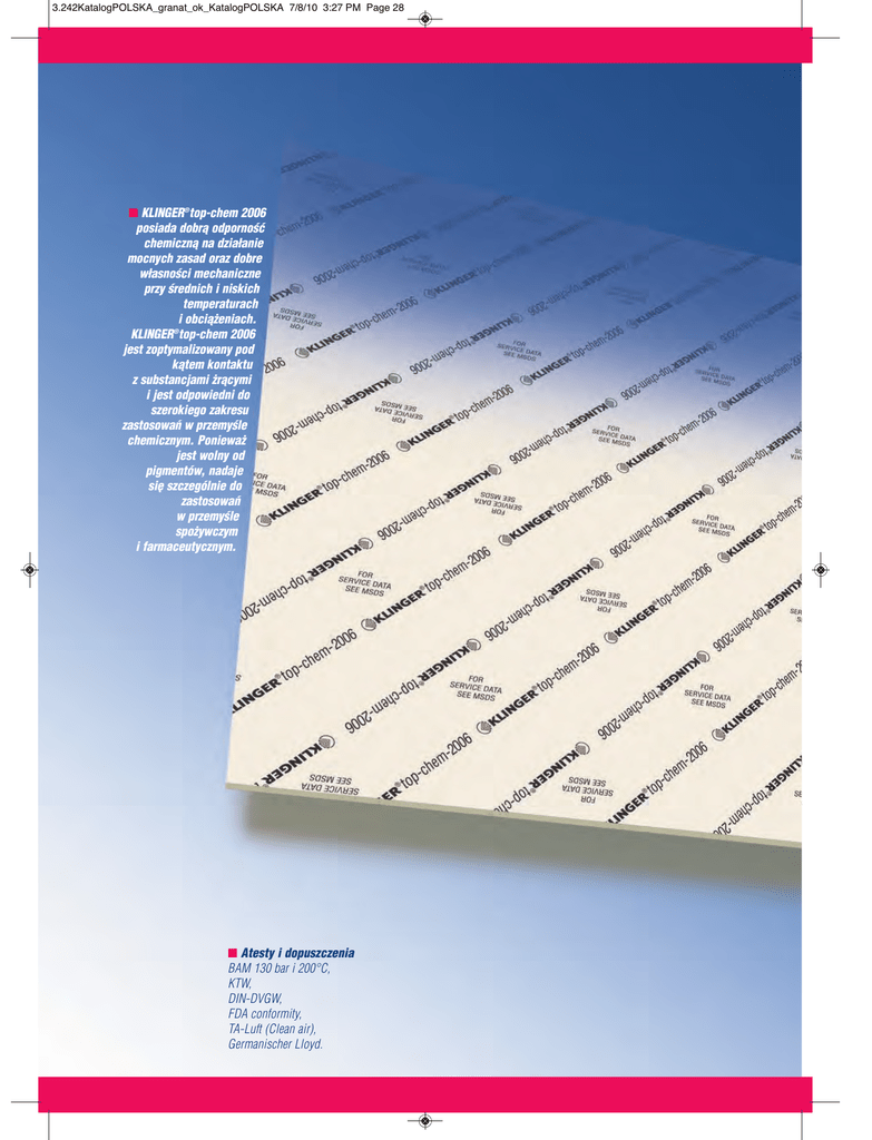 3.242KatalogPOLSKA_granat_ok_KatalogPOLSKA 7/8/10 3:27 PM Page 28 ■ KLINGER®top-chem 2006 posiada dobrà odpornoÊç chemicznà na działanie mocnych zasad oraz dobre własnoÊci mechaniczne przy Êrednich i niskich temperaturach i obcià˝eniach. KLINGER®top-chem 2006 jest zoptymalizowany pod kàtem kontaktu z substancjami ˝ràcymi i jest odpowiedni do szerokiego zakresu zastosowaƒ w przemyÊle chemicznym. Poniewa˝ jest wolny od pigmentów, nadaje si´ szczególnie do zastosowaƒ w przemyÊle spo˝ywczym i farmaceutycznym. ■ Atesty i dopuszczenia BAM 130 bar i 200°C, KTW, DIN-DVGW, FDA conformity, TA-Luft (Clean air), Germanischer Lloyd. 3.242KatalogPOLSKA_granat_ok_KatalogPOLSKA 7/8/10 3:28 PM Page 29 ® KLINGER top-chem 2006 ■ Dobór uszczelek przy pomocy wykresu pT Wykres pT dostarcza wskazówek do oceny mo˝liwoÊci zastosowania konkretnego materiału na uszczelk´ w okreÊlonym przypadku tylko na podstawie temperatury i ciÊnienia pracy. Dodatkowo wyst´pujàce oddziaływania, jak np. zmieniajàce si´ siły nacisku, mogà znaczàco wpływaç na mo˝liwoÊci zastosowania uszczelki w danej sytuacji i muszà byç rozpatrywane oddzielnie. Zawsze nale˝y sprawdziç odpornoÊç chemicznà materiału uszczelki na działanie medium. *Uszczelki zgodne z DIN 2690 sà znormalizowane tylko do PN 40 i gruboÊci uszczelki 2 mm. ■ Spawanie materiałów KLINGER®top-chem KorzyÊci: ■ TaÊma do spawania KLINGER®top-chem składa si´ z tych samych surowców co uszczelki. Dlatego miejsce łàczenia nie jest miejscem o zmniejszonej odpornoÊci chemicznej, jak to ma miejsce przy spawaniu z PFA, filmem FEP lub przy klejeniu. ■ Temperatura pracy taÊmy spawajàcej KLINGER®top-chem odpowiada temperaturze pracy materiału uszczelki, podczas gdy PFA lub film FEP topi si´ przy daleko ni˝szej temperaturze ni˝ materiał uszczelki. ■ Wymiary standardowych płyt WielkoÊci: 1500 x 1500 mm. GruboÊci: 1,0 mm, 1,5 mm, 2,0 mm, 3,0 mm; Inne gruboÊci i wymiary na ˝yczenie. Tolerancje: gruboÊç ± 10%, długoÊç ± 50 mm, szerokoÊç ± 50 mm. ■ Powierzchnia płyty Materiały uszczelniajàce KLINGERA posiadajà powierzchnie o niskiej przyczepnoÊci (niskiej adhezji). Na ˝yczenie klienta mo˝emy tak˝e zaoferowaç inne wykoƒczenie jednej lub obu powierzchni. ■ FunkcjonalnoÊç i trwałoÊç Prawidłowa praca oraz trwałoÊç uszczelek zale˝y w du˝ym stopniu od odpowiedniego ich przechowywania i monta˝u, czyli od czynników znajdujàcych si´ poza kontrolà producenta. Pomimo to mo˝emy zapewniç o wysokiej jakoÊci naszych wyrobów. Typowe wartoÊci dla gruboÊci 1,5 mm ■ Uszczelki zespawane przy u˝yciu metody spawania KLINGERA® i przy u˝yciu taÊmy spawajàcej KLINGER®top-chem zachowujà takà samà wytrzymałoÊç jak materiał niespawany. ÂciÊliwoÊç ASTM F 36 J PowracalnoÊç ASTM F 36 J WytrzymałoÊç na Êciskanie DIN 52913 WytrzymałoÊç wg metody Klingera 50 MPa PrzepuszczalnoÊç gazowa Zmiana gruboÊci/ci´˝aru G´stoÊç Współczynniki według ASME Dla uszczelek o gruboÊci 2,0 mm i gazoszczelnoÊci według DIN 28090 29 ■ Obszary zastosowania W obszarze pierwszym, materiał uszczelki nadaje si´ do zastosowania pod warunkiem odpowiedniej odpornoÊci chemicznej na dane medium. W obszarze drugim, materiał uszczelki mo˝e nadawaç si´ do zastosowania, lecz zaleca si´ przeprowadzenie dodatkowych obliczeƒ. W obszarze trzecim, przed instalacjà uszczelki konieczne jest przeprowadzenie dodatkowych obliczeƒ. ■ Z powodu swojej prostoty procedura mo˝e byç stosowana gdziekolwiek. ■ Jest tania. ■ Mo˝na jà stosowaç do wszystkich materiałów z rodziny KLINGER®top-chem. min 30 MPa, 16 godz./150°C ubytek gruboÊci przy 23°C ubytek gruboÊci przy 250°C DIN 3535/6 DIN 28090-2 H2SO4, 100%, 18 godz./23°C HNO3, 100%, 18 godz./23°C NaOH, 33%, 72 godz./110°C gazoszczelnoÊç klasy 0,1 mg/s x m % % MPa 4 40 18 % % ml/min mg/s x m % % % g/cm 3 10 40 0,1 0,01 – 1/2 1/1 3,0 MPa y 15 m 5