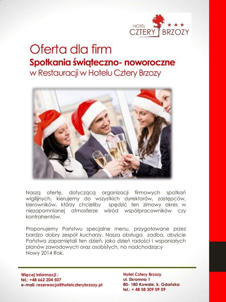 Oferta dla firm Spotkania świąteczno- noworoczne w Restauracji w Hotelu Cztery Brzozy Naszą ofertę, dotyczącą organizacji firmowych spotkań wigilijnych, kierujemy do wszystkich dyrektorów, zastępców, kierowników, którzy chcieliby spędzić ten zimowy okres w niezapomnianej atmosferze wśród współpracowników czy kontrahentów. Proponujemy Państwu specjalne menu, przygotowane przez bardzo dobry zespół kucharzy. Nasza obsługa zadba, abyście Państwo zapamiętali ten dzień, jako dzień radości i wspaniałych planów zawodowych oraz osobistych, na nadchodzący Nowy 2014 Rok. Więcej informacji : tel.: +48 662 204 507 e-mail: [email protected] Hotel Cztery Brzozy ul. Skromna 1 80- 180 Kowale, k. Gdańska tel.: + 48 58 309 09 09 Chcielibyśmy zaproponować Państwu kilka propozycji menu spotkania: Propozycja I • Wigilijne uszka w czerwonym barszczu • Łosoś z rusztu • Ziemniaki pieczone • Kapusta zasmażana z pieczarkami • Patery świątecznych ciast podane z kawą oraz herbatą Propozycja II • Krem z grzybów leśnych • Karp soute podany z pieczarkami • Risotto • Grillowane warzywa • Patery świątecznych ciast podane z kawą oraz herbatą Propozycja III • Barszcz czerwony podany z krokietem • Filet z dorsza w cieście naleśnikowym • Kopytka ziemniaczane • Kapusta czerwona duszona z dodatkiem wina • Patery świątecznych ciast podane z kawą oraz herbatą Więcej informacji : tel.: +48 662 204 507 e-mail: [email protected] Hotel Cztery Brzozy ul. Skromna 1 80- 180 Kowale, k. Gdańska tel.: + 48 58 309 09 09 Propozycje zasiadanych kolacji Wariant I Zupa Zupa borowikowa podana z kluseczkami Danie ciepłe serwowane na półmiskach Smażony karp na maśle koperkowym Filet z dorsza w chrupiącej panierce Łosoś z rusztu Wigilijne gołąbki z ryżem podane z sosem pieczarkowym Dodatki Pierogi z kapustą i grzybami Kapusta zasmażana z grzybkami Łazanki z kapustą i grzybami Ziemniaki opiekane w ziołach Deser Kutia świąteczna Patery ciast świątecznych/ piernik, sernik, makowiec z migdałami,/ Napoje Kawa oraz herbata Kompot z suszonych owoców Woda mineralna Sok owocowy Wino białe lub czerwone Zakąski zimne Filet z dorsza po grecku Śledzik w trzech smakach Faszerowany pstrąg w galarecie Karp po żydowsku Sałatka jarzynowa Terina z dorsza z łososiem i szpinakiem Tatar z łososia marynowanego Więcej informacji : tel.: +48 662 204 507 e-mail: [email protected] Hotel Cztery Brzozy ul. Skromna 1 80- 180 Kowale, k. Gdańska tel.: + 48 58 309 09 09 Wariant II Zupa: Barszczyk czerwony podany z krokietem Danie ciepłe serwowane na półmiskach Karp smażony w panierce migdałowej Dorsz z mozzarellą i pomidorami Halibut zapiekany w warzywach Pstrąg smażony w ziołowej panierce Dodatki Kluseczki z kapustą Ryż z warzywami Ziemniaki opiekane Ziemniaki gotowane Kapusta kiszona zasmażana z grzybami Pierogi z kapustą i grzybami Deser Patery ciast świątecznych/sernik, makowiec, piernik / Napoje Kawa oraz herbata Kompot z suszonych owoców Woda mineralna Sok owocowy Wino białe lub czerwone Zakąski zimne Rolada z karpia z orzechami Kulebiak z kapustą i grzybami Szczupak faszerowany Sałatka ziemniaczana Sałatka jarzynowa Sałatka grecka Łosoś marynowany w zielonym pieprzu Dorsz po meksykańsku Śledzik w trzech smakach Więcej informacji : tel.: +48 662 204 507 e-mail: [email protected] Hotel Cztery Brzozy ul. Skromna 1 80- 180 Kowale, k. Gdańska tel.: + 48 58 309 09 09