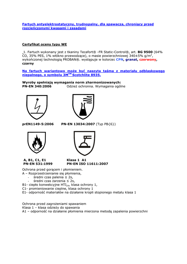 1. Fartuch wykonany jest z tkaniny Tecafort® -FR Static-Control®, art. BG 9500 (64%