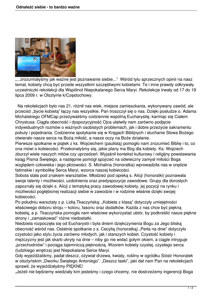Odnaleźć siebie - to bardzo ważne „...zrozumiałyśmy jak ważne jest poznawanie siebie...” Wśród tylu sprzecznych opinii na nasz temat, kobiety chcą być przede wszystkim szczęśliwymi kobietami. Te i inne prawdy odkrywały uczestniczki rekolekcji dla Wspólnot Niepokalanego Serca Maryi. Rekolekcje trwały od 17 do 19 lipca 2009 r. w Olsztynie k/Częstochowy. Na rekolekcjach było nas 21, różnił nas wiek, miejsce zamieszkania, wykonywany zawód, ale przecież „bycie kobietą” łączy nas wszystkie. Pan troszczył się o nas. Dzięki posłudze o. Adama Michalskiego OFMCap przeżywaliśmy codziennie wspólną Eucharystię, karmiąc się Ciałem Chrystusa. Ciągła obecność i dyspozycyjność Ojca ułatwiły nam zarówno podjęcie indywidualnych rozmów o ważnych osobistych problemach, jak i dobre przeżycie sakramentu pokuty i pojednania. Codzienne spotykanie się w Kręgach Biblijnych i słuchanie Słowa Bożego otwierało nasze serca na Bożą miłość, a nasze oczy na Boże działanie. Pierwsze spotkanie w piątek z ks. Wojciechem (paulistą) pomogło nam zrozumieć Biblię i to, co ona mówi o kobiecości. Przekonałyśmy się, jakie plany ma Bóg dla kobiety. Ks. Wojciech zburzył wiele naszych mitów czy uprzedzeń. Wyjaśnił kontekst kulturowy i religijny powstawania ksiąg Pisma Świętego, a następnie pomógł spojrzeć na odwieczny zamysł miłości Boga względem człowieka i jego płciowości. S. Michalina (honoratka) wprowadziła nas w orędzie fatimskie i symbolikę Serca Maryi, wzorca naszej kobiecości. Sobota stała pod znakiem warsztatów. Młodzież pod opieką s. Alicji (honoratki) poznawała swoje talenty i możliwości, uzdolnienia oraz predyspozycje zawodowe. Grupy dla dorosłych zapoznały się dzięki s. Alicji z tematyką pracy zawodowej kobiety, jej pozycji na rynku i możliwości pogłębionej realizacji siebie w zawodzie i w rodzinie właśnie dzięki swojej kobiecości. Po południu warsztaty z p. Lidią Tkaczyńską: „Kobieta z klasą” dotyczyły umiejętności właściwego doboru stroju – koloru, fasonu oraz dodatków. Każda z nas chce być piękną kobietą, a p. Tkaczyńska pomogła nam właściwe wykorzystać ubiór, by podkreślić nasze piękne strony i „zamaskować” różne niedostatki. Niedziela rozpoczęła się od Eucharystii i była dniem dziękczynienia Bogu za Jego bliską obecność wśród nas. Ostatnie spotkanie z s. Cecylią (honoratką) „Perła na dnie” dotyczyło czystości jako stylu życia zarówno młodych, jak i starszych kobiet. Czystość kobiety i mężczyzny jest jak skarb ukryty na dnie – niby go nie widać gołym okiem, a ciągle intryguje „przechodniów” i pociąga tajemniczą pięknością. Wzorem kobiety czystej, czystego serca (ludzkiego wnętrza) jest Niepokalane Serce Maryi. Gdy wyjeżdżaliśmy, padał deszcz, ożywiał drzewa, kwiaty, rośliny w ogródku Sióstr Honoratek w olsztyńskim „Dworku Świętego Antoniego”. „Deszcz łaski”, jaki dał nam Pan na rekolekcjach sprawił, że wyjeżdżałyśmy PIĘKNE! „Jeżeli nie będziemy wiedziały kim jesteśmy i czego chcemy, nie dostrzeżemy ingerencji Boga 1/2 Odnaleźć siebie - to bardzo ważne w naszym życiu. Jeśli doświadczymy własnej bezradności i zaufamy Panu bezgranicznie, to zrozumiemy Jego szaleńczą miłość, którą nieustannie nas obdarowuje”. 2/2