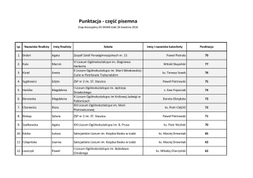 Punktacja - część pisemna Etap diecezjalny XX OKWB Łódź 26 kwietnia 2016 Lp. Nazwisko finalisty Imię finalisty 1. Brdoń Agata 2. Kula Marcin 3. Kisiel Aneta 4. Sygitowicz Edyta 5. Hańćka Magdalena 6. Borowska Magdalena 7. Chaniecka Klara 8. Biskup Szkoła Zespół Szkół Ponadgimnazjalnych nr. 15 VI Liceum Ogólnokształcące im. Zbigniewa Herberta II Liceum Ogólnokształcące im. Marii Skłodowskiej Curie w Piotrkowie Trybunalskim ZSP nr 2 im. ST. Staszica Imię i nazwisko katechety Punktacja Paweł Pietrala 79 Witold Skupiński 77 ks. Tomasz Sowik 76 Paweł Piotrowski 75 I Liceum Ogólnokształcące im. Jędrzeja Śniadeckiego II Liceum Ogólnokształcące im Królowej Jadwigi w Pabianicach XIII Liceum Ogólnokształcące im. Marii Piotrowiczowej s. Ewa Frąszczak 74 Dorota Obrębska 73 ks. Piotr CIĄCIO 72 Sylwia ZSP nr 2 im. ST. Staszica Paweł Piotrowski 71 9. Szałkowska Agata XXI Liceum Ogólnokształcące im. B. Prusa ks. Piotr Niciński 70 10. Kózka Łukasz Salezjańskie Liceum im. Księdza Bosko w Łodzi ks. Maciej Drewniak 65 11. Człapińska Joanna Salezjańskie Liceum im. Księdza Bosko w Łodzi ks. Maciej Drewniak 63 12. Laszczyk Paweł I Liceum Ogólnokształcące im. Bolesława Chrobrego ks. Mikołaj Chorzyński 62 Technikum nr 13 w Zespole Szkół GeodezyjnoTechnicznych w Łodzi XXVI Liceum Ogólnokształcące im. K. K. Baczyńskiego 13. Rudzka Natalia 14. Gruda Joanna 15. Bednarkiewicz Dominik 16. Kacperska Dominika 17. Ostrowska Ewelina Zofia 18. Szczegielniak Agata 1 LO im. M. Kopernika 19. Duda Katarzyna I Liceum Ogólnokształcące im. Jędrzeja Śniadeckiego 20. Turała Julia XV Liceum Ogólnokształcące im.Jana Kasprowicza 21. Karczewska Karolina Ogólnokształcąca Szkoła Muzyczna I i II st. im. H. Wieniawskiego w Łodzi 22. Ochlanek Paulina Liceum Ogólnokształcące im. M. Konopnickiej Michał II Liceum Ogólnokształcące im. Stefana Żeromskiego 24. Ochota Maciej Salezjańskie Liceum im. Księdza Bosko w Łodzi 25. Trzmielak Szymon XV Liceum Ogólnokształcące im.Jana Kasprowicza 26. Kolecki Robert ZSP nr 2 im. ST. Staszica 27. Witek Krzysztof Liceum im. Władysława Broniewskiego 28. Wroński Michał XII Liceum Ogólnokształcące w Łodzi 23. LewandowiczBucholc I Liceum Ogólnokształcące im. Tadeusza Kościuszki III Liceum Ogólnokształcące im. Juliusza Słowackiego w Piotrkowie Trybunalskim Publiczne Liceum Ogólnokształcące Uniwersytetu Łódzkiego ks. Kamil Przybysz 62 Anna Horwat 59 Jadwiga Świerczyńska 58 s. Stanisława Buksa 58 ks. Sławomir Piotrowski 58 ks. Marcin Czajkowski 58 s. Ewa Frąszczak 57 Dariusz Andrzej Sęczkowski 57 ks. Grzegorz Matynia 56 BOŻENA Ośkiewicz 56 ks. Grzegorz Chirk 54 ks. Maciej Drewniak 54 Dariusz Andrzej Sęczkowski 54 Paweł Piotrowski 53 ks. Szymon Kierkiewicz 53 ks. Jacek Syjud 53 29. Żyżelewicz Barbara Liceum im. Władysława Broniewskiego ks. Szymon Kierkiewicz 52 30. Siedlecki Robert Katarzyna Kobus-Puchała 51 31. Lindner Maria ks. Sławomir Piotrowski 50 32. Koniuszaniec Teresa ks. Piotr CIĄCIO 49 33. Zarębska Beata o. Hubert Burba 49 34. Jakubowska Marlena Paweł Pietrala 47 35. Krajewska Dobromiła o. Hubert Burba 47 36. Ornatowska Anna Anna Horwat 47 37. Borysławska Aleksandra ks. Grzegorz Chirk 46 38. Cichos Aleksandra Ewa Szymańska 45 39. Gawron Oliwia VIII Liceum Ogólnokształcące im. A. Asnyka ks. Michał Chorąży 45 40. Sobieszczyk Jakub XXI Liceum Ogólnokształcące im. B. Prusa ks. Piotr Niciński 44 41. Grabińska Maria VI Liceum Ogólnokształcące im. Joachima Lelewela w Łodzi o. Hubert Burba 43 42. Małachowska Olga XXI Liceum Ogólnokształcące im. B. Prusa ks. Piotr Niciński 43 43. Sar Kacper XXXIII Liceum Ogólnokształcące im. Armii Krajowej w Łodzi Anna Horwat 43 44. Poprzęcki Konrad XXIV Liceum Ogólnokształcące Jacek Radzikowski 42 Zespół Szkół Ponadgimnazjalnych nr 2 w Koluszkach Publiczne Liceum Ogólnokształcące Uniwersytetu Łódzkiego XIII Liceum Ogólnokształcące im. Marii Piotrowiczowej VI Liceum Ogólnokształcące im. Joachima Lelewela w Łodzi Zespół Szkół Ponadgimnazjalnych nr. 15 VI Liceum Ogólnokształcące im. Joachima Lelewela w Łodzi XXVI Liceum Ogólnokształcące im. K. K. Baczyńskiego II Liceum Ogólnokształcące im. Stefana Żeromskiego I Liceum Ogólnokształcące im. Jędrzeja Śniadeckiego 45. Strąk Karolina Zespół Szkół Ponadgimnazjalnych nr 5 46. Frank Alicja XXVI Liceum Ogólnokształcące im. K. K. Baczyńskiego 47. Gorzkiewicz Róża ZSO nr1 - XXXII LO im. H. Poświatowskiej 48. Zagórski Adrian Zespół Szkół Rzemiosła 49. Ziemak Justyna XXV Liceum Ogólnokształcące 50. Gałecka Kinga ZSP nr 2 im. ST. Staszica 51. Kruczkowska Izabela 52. Łapot Oliwia 53. Maciejczak Magdalena 54. Żeromiński Konrad 55. Jacek Zofia Teresa 56. Jędrzejczyk Damian 57. Szymczewska Natalia ZSO nr1 - XXXII LO im. H. Poświatowskiej 58. Wójcik Dawid Zespół Szkół Ponadgimnazjalnych nr 5 59. Fuchler Mateusz LO nr 42 przy ZSO nr 4 im. Ireny Sendlerowej 60. Just Milena I Liceum Ogólnokształcące im. Bolesława Chrobrego XIII Liceum Ogólnokształcące im. Marii Piotrowiczowej Zespół Szkół Ekonomiczno-TurystycznoHotelarskich im. Władysława Grabskiego w Łodzi ZSO nr1 - XXXII LO im. H. Poświatowskiej Technikum nr 13 w Zespole Szkół GeodezyjnoTechnicznych w Łodzi Publiczne Liceum Ogólnokształcące Uniwersytetu Łódzkiego Zespół Szkół Przemysłu Spożywczego im. Powstańców Wielkopolskich Beata Kucharzewska 42 Anna Horwat 41 Iwona Zapałowska 41 Antoni Chodakowski 41 ks. Daniel Jarzębski 41 Paweł Piotrowski 40 ks. Piotr CIĄCIO 40 o. Artur Kiliszek 40 Iwona Zapałowska 40 ks. Kamil Przybysz 40 ks. Sławomir Piotrowski 39 Anna Arendt 39 Iwona Zapałowska 39 Teresa Bujak 39 ks. Rafał Jóźwik 38 ks. Mikołaj Chorzyński 38 61. Perdas Dominik Zespol Szkol Nr 1 w Bratoszewicach 62. Szczęsnowicz Piotr Ogólnokształcąca Szkoła Muzyczna I i II st. im. H. Wieniawskiego w Łodzi 63. Szczodrowska Ewelina 