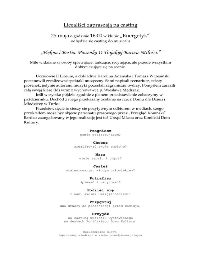 Licealiści zapraszają na casting 25 maja o godzinie 16:00 w klubie „Energetyk” odbędzie się casting do musicalu „Piękna i Bestia. Piosenka O Trojakiej Barwie Miłości.” Mile widziane są osoby śpiewające, tańczące, recytujące, ale przede wszystkim dobrze czujące się na scenie. Uczniowie II Liceum, a dokładnie Karolina Adamska i Tomasz Wrzesiński postanowili zrealizować spektakl muzyczny. Sami napisali scenariusz, teksty piosenek, jedynie autorami muzyki pozostali zagraniczni twórcy. Pomysłem zarazili całą swoją klasę (Id) wraz z wychowawcą p. Wiesławą Mądrzak. Jeśli wszystko pójdzie zgodnie z planem przedstawienie zobaczymy w październiku. Dochód z niego przekazany zostanie na rzecz Domu dla Dzieci i MłodzieŜy w Turku. Przedsięwzięcie to cieszy się pozytywnym odbiorem w mediach, czego przykładem moŜe być objęcie patronatu prasowego przez „Przegląd Koniński” Bardzo zaangaŜowany w jego realizację jest teŜ Urząd Miasta oraz Koniński Dom Kultury. Pragniesz pomóc potrzebującym? Chcesz zrealizować swoje ambicje? Masz wiele zapału i chęci? Jesteś utalentowanym, młodym człowiekiem? Potrafisz śpiewać i recytować? Podziel się z nami swoimi umiejętnościami! Przygotuj dwa utwory do prezentacji przed komisją. Przyjdź na casting musicalu wystawianego na deskach Konińskiego Domu Kultury! Dopuszczalne duety. Zapraszamy młodzieŜ w wieku ponadgimnazjalnym. CASTING DO MUSICALU Piękna i Bestia. Piosenka O Trojakiej Barwie Miłości. 25 maja ’07 (piątek) od godziny 16:00 Klub „Energetyk” przy ulicy Przemysłowej 3d