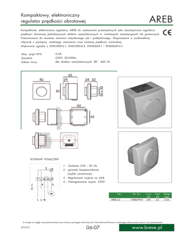 Kompaktowy, elektroniczny regulator prędkości obrotowej AREB Kompaktowe, elektroniczne regulatory AREB do zastosowań przemysłowych jako bezstopniowe regulatory prędkości obrotowej jednofazowych silników wentylatorowych w instalacjach wentylacyjnych lub grzewczych. Przeznaczone do montażu zarówno natynkowego jak i podtynkowego. Wyposażone w podświetlany włącznik z pamięcią ostatniego ustawienia oraz nastawę prędkości minimalnej. Wykonanie zgodne z EN61000-6-1, EN61000-6-3, EN60669-1 i EN60669-2-1. Max. prąd WYJ Zasialnie Zakres mocy :2,5A :230V, 50/60Hz :dla silników wentylatorowych: 80 - 460 W SCHEMAT POŁĄCZEŃ 1 - Zasilanie 230 ; 50 Hz 2 - gniazdo bezpiecznikowe (szybki ceramiczny) 3 - Regulowane wyjście na silnik 4 - Nieregulowane wyjcie 230V Z uwagi na ciągły rozwój konstrukcji oraz zmiany wymagań technicznych, firma Breve-Tufvassons zastrzega sobie prawo zmian w/w parametrów. 2012/01 06-07 www.breve.pl b l