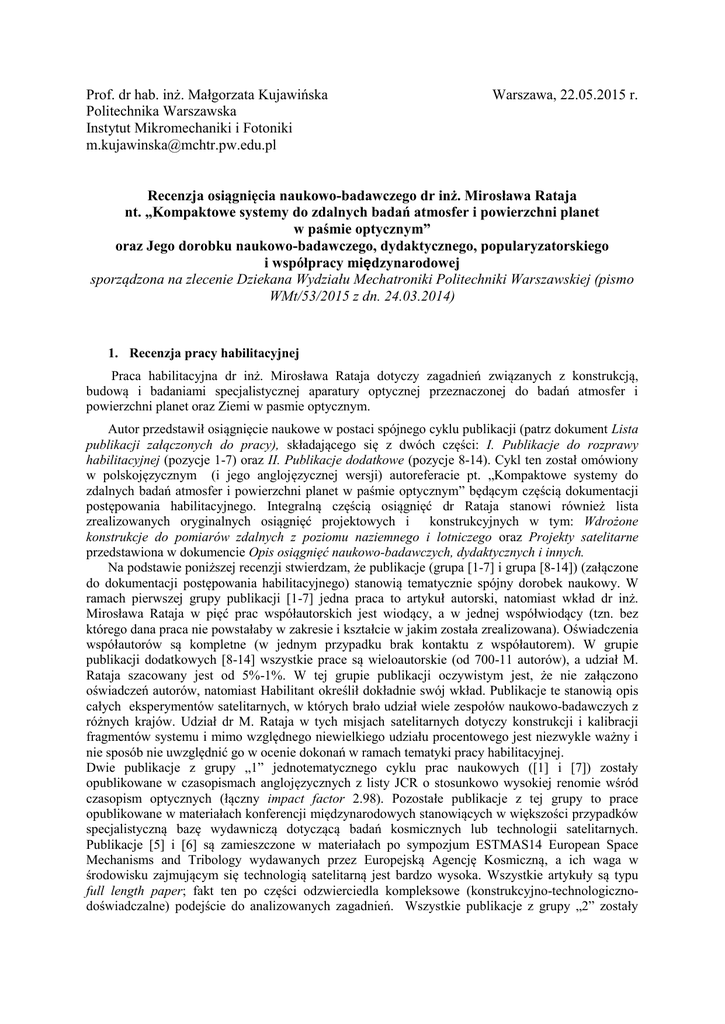 Prof. dr hab. inż. Małgorzata Kujawińska Politechnika Warszawska Instytut Mikromechaniki i Fotoniki [email protected] Warszawa, 22.05.2015 r. Recenzja osiągnięcia naukowo-badawczego dr inż. Mirosława Rataja nt. „Kompaktowe systemy do zdalnych badań atmosfer i powierzchni planet w paśmie optycznym” oraz Jego dorobku naukowo-badawczego, dydaktycznego, popularyzatorskiego i współpracy międzynarodowej sporządzona na zlecenie Dziekana Wydziału Mechatroniki Politechniki Warszawskiej (pismo WMt/53/2015 z dn. 24.03.2014) 1. Recenzja pracy habilitacyjnej Praca habilitacyjna dr inż. Mirosława Rataja dotyczy zagadnień związanych z konstrukcją, budową i badaniami specjalistycznej aparatury optycznej przeznaczonej do badań atmosfer i powierzchni planet oraz Ziemi w pasmie optycznym. Autor przedstawił osiągnięcie naukowe w postaci spójnego cyklu publikacji (patrz dokument Lista publikacji załączonych do pracy), składającego się z dwóch części: I. Publikacje do rozprawy habilitacyjnej (pozycje 1-7) oraz II. Publikacje dodatkowe (pozycje 8-14). Cykl ten został omówiony w polskojęzycznym (i jego anglojęzycznej wersji) autoreferacie pt. „Kompaktowe systemy do zdalnych badań atmosfer i powierzchni planet w paśmie optycznym” będącym częścią dokumentacji postępowania habilitacyjnego. Integralną częścią osiągnięć dr Rataja stanowi również lista zrealizowanych oryginalnych osiągnięć projektowych i konstrukcyjnych w tym: Wdrożone konstrukcje do pomiarów zdalnych z poziomu naziemnego i lotniczego oraz Projekty satelitarne przedstawiona w dokumencie Opis osiągnięć naukowo-badawczych, dydaktycznych i innych. Na podstawie poniższej recenzji stwierdzam, że publikacje (grupa [1-7] i grupa [8-14]) (załączone do dokumentacji postępowania habilitacyjnego) stanowią tematycznie spójny dorobek naukowy. W ramach pierwszej grupy publikacji [1-7] jedna praca to artykuł autorski, natomiast wkład dr inż. Mirosława Rataja w pięć prac współautorskich jest wiodący, a w jednej współwiodący (tzn. bez którego dana praca nie powstałaby w zakresie i kształcie w jakim została zrealizowana). Oświadczenia współautorów są kompletne (w jednym przypadku brak kontaktu z współautorem). W grupie publikacji dodatkowych [8-14] wszystkie prace są wieloautorskie (od 700-11 autorów), a udział M. Rataja szacowany jest od 5%-1%. W tej grupie publikacji oczywistym jest, że nie załączono oświadczeń autorów, natomiast Habilitant określił dokładnie swój wkład. Publikacje te stanowią opis całych eksperymentów satelitarnych, w których brało udział wiele zespołów naukowo-badawczych z różnych krajów. Udział dr M. Rataja w tych misjach satelitarnych dotyczy konstrukcji i kalibracji fragmentów systemu i mimo względnego niewielkiego udziału procentowego jest niezwykle ważny i nie sposób nie uwzględnić go w ocenie dokonań w ramach tematyki pracy habilitacyjnej. Dwie publikacje z grupy „1” jednotematycznego cyklu prac naukowych ([1] i [7]) zostały opublikowane w czasopismach anglojęzycznych z listy JCR o stosunkowo wysokiej renomie wśród czasopism optycznych (łączny impact factor 2.98). Pozostałe publikacje z tej grupy to prace opublikowane w materiałach konferencji międzynarodowych stanowiących w większości przypadków specjalistyczną bazę wydawniczą dotyczącą badań kosmicznych lub technologii satelitarnych. Publikacje [5] i [6] są zamieszczone w materiałach po sympozjum ESTMAS14 European Space Mechanisms and Tribology wydawanych przez Europejską Agencję Kosmiczną, a ich waga w środowisku zajmującym się technologią satelitarną jest bardzo wysoka. Wszystkie artykuły są typu full length paper; fakt ten po części odzwierciedla kompleksowe (konstrukcyjno-technologicznodoświadczalne) podejście do analizowanych zagadnień. Wszystkie publikacje z grupy „2” zostały opublikowane w renomowanym czasopiśmie Planetary and Space Science (IF2005/2006=1.41/1.51) również w formie pełnowymiarowych artykułów i dają łączny impact factor IF=9.97. Obszarem zainteresowań oraz prac projektowych, konstrukcyjnych i naukowych dr inż. Mirosława Rataja jest cała gama zagadnień związanych z budową, kalibracją i użytkowaniem kompaktowych systemów spektralnych i ich modułów przeznaczonych do zdalnych obserwacji atmosfer i powierzchni planet (w tym również Ziemi), pracujących w trudnych warunkach środowiskowych, a szczególnie w przestrzeni kosmicznej. Uwaga Habilitanta skupiła się na konstrukcjach i zastosowaniach spektrometrów fourierowskich, które okazały się szczególnie interesujące w tym obszarze zastosowań. Pragnę podkreślić wyjątkowe uzdolnienia i doświadczenie Habilitanta w zakresie projektowania i analiz specjalnej aparatury optycznej pozwalające na swobodne poruszanie się w zakresie zagadnień projektowania układów optycznych i rozwiązań konstrukcji mechanicznych dla projektów satelitarnych. Metody pomiaru i konstrukcje realizowane na potrzeby projektów satelitarnych wymagały od Habilitanta stworzenia zasad (zdefiniowania założeń misji), metodyki ich realizacji, weryfikacji uzyskanych rezultatów oraz interpretacji danych. Warunki środowiskowe oraz wysoka, wymagana niezawodność działania systemu wymagały we wszystkich opracowywanych konstrukcjach nowatorskiego podejścia i doskonałego opanowania warsztatu badawczego związanego z budową aparatury na potrzeby pracy w warunkach ekstremalnie trudnych. Cykl publikacji zatytułowany „Kompaktowe systemy do zdalnych badań atmosfer i powierzchni planet w paśmie optycznym” ma wspólny mianownik – budowa i badania kompaktowych spektrometrów fourierowskich oraz aparatury wspomagającej wykorzystanie tych urządzeń w misjach satelitarnych. Pierwsza z publikacji [1] służy jako wstęp do tematyki pracy habilitacyjnej, gdyż zawiera bieżący (na 1998r.) przegląd światowych i własnych doświadczeń i doko