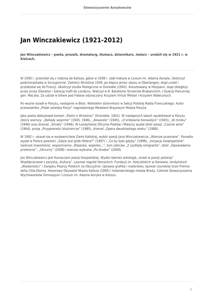 Stowarzyszenie Asnykowców Jan Winczakiewicz (1921-2012) Jan Winczakiewicz – poeta, prozaik, dramaturg, tłumacz, dziennikarz, malarz – urodził się w 1921 r. w Kielcach. W 1930 r. przeniósł się z rodziną do Kalisza, gdzie w 1938 r. zdał maturę w Liceum im. Adama Asnyka. Ukończył podchorążówkę w Szczypiornie. Żołnierz Września 1939, po klęsce jeniec obozu w Oberlangen, skąd uciekł i przedostał się do Francji. Ukończył studia filologiczne w Grenoble (1942). Aresztowany w Hiszpanii, skąd zbiegłszy przez przez Gibraltar i Szkocję trafił do Londynu. Walczył w 8. Batalionie Strzelców Brabanckich, I Dywizji Pancernej gen. Maczka. Za udział w bitwie pod Falaise odznaczony Krzyżem Virtuti Militari i Krzyżem Walecznych. Po wojnie osiadł w Paryżu, następnie w Blois. Wieloletni dziennikarz w Sekcji Polskiej Radia Francuskiego. Autor przewodnika „Polak zwiedza Paryż” nagrodzonego Medalem Brązowym Miasta Paryża. Jako poeta debiutował tomem „Pieśni o Wrześniu” (Grenoble, 1941). W następnych latach opublikował w Paryżu zbiory wierszy: „Ballady wojenne” (1945, 1946), „Akwarele” (1945), „O królewnie Konwalijce” (1945), „W mroku” (1946) oraz dramat „Śmiały” (1946). W Londyńskiej Oficynie Poetów i Malarzy wydał zbiór poezji „Czarne wino” (1964), prozę „Przypowieści bluźniercze” (1985), dramat „Opera dwudziestego wieku” (1988). W 1992 r. ukazał się w wydawnictwie Ziemi Kaliskiej, wybór poezji Jana Winczakiewicza „Wiersze przesiane”. Ponadto wydał w Polsce powieści „Gdzie jest grób Hitlera?” (1997) i „Co by było gdyby” (1998), „Inicjacje świętojańskie” (wiersze masońskie), wspomnienia „Wojenko, wojenko...”, tom szkiców „Z szuflady emigranta”, zbiór „Opowiadania przekorne”, „Okruchy” (2008) i wiersze wybrane „Po drodze” (2009). Jan Winczakiewicz jest tłumaczem poezji hiszpańskiej. Wydał również antologię „Izrael w poezji polskiej”. Współpracował z paryską „Kulturą”. Laureat nagród literackich: Fundacji im. Kościelskich w Genewie, londyńskich „Wiadomości” i Związku Pisarzy Polskich na Obczyźnie. Uprawia grafikę i malarstwo, laureat rzymskiej Gran Premio della Citta Eterna. Honorowy Obywatel Miasta Kalisza (1995) i holenderskiego miasta Bredy. Członek Stowarzyszenia Wychowanków Gimnazjum i Liceum im. Adama Asnyka w Kaliszu. 1