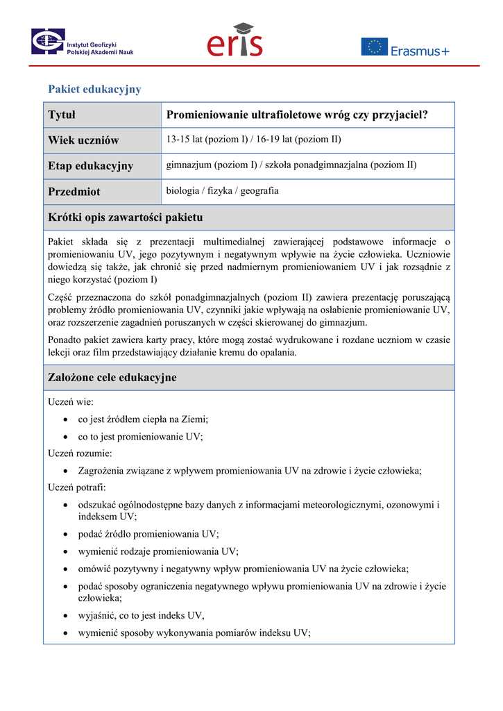 Pakiet edukacyjny Tytuł Promieniowanie ultrafioletowe wróg czy