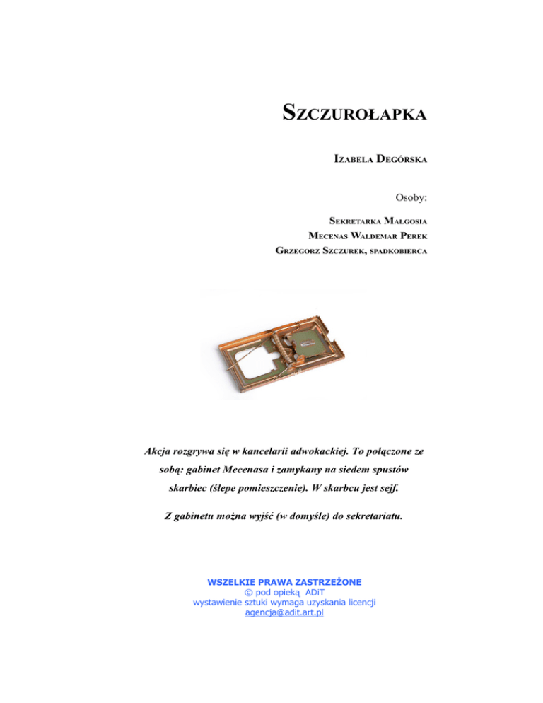 SZCZUROŁAPKA IZABELA DEGÓRSKA Osoby: SEKRETARKA MAŁGOSIA MECENAS WALDEMAR PEREK GRZEGORZ SZCZUREK, SPADKOBIERCA Akcja rozgrywa się w kancelarii adwokackiej. To połączone ze sobą: gabinet Mecenasa i zamykany na siedem spustów skarbiec (ślepe pomieszczenie). W skarbcu jest sejf. Z gabinetu można wyjść (w domyśle) do sekretariatu. WSZELKIE PRAWA ZASTRZEŻONE © pod opieką ADiT wystawienie sztuki wymaga uzyskania licencji [email protected] SCENA 1. GABINET. Mecenas – elegancki garnitur, krawat – wywija nożem o wymyślnym kształcie, zarzuca niewidzialną pelerynę, pręży się, skrada, skacze, kuca. Zza sceny słychać odgłosy krzątania, dzwonią filiżanki. DZWONI telefon. SEKRETARKA (off) Gabinet mecenasa Perka, słucham? /…/ Niech sprawdzę. Oczywiście. Może być piętnasta? Do widzenia. Mecenas przerywa zabawę. Znika za otwartymi drzwiami skarbca. Do gabinetu wchodzi z filiżanką kawy Sekretarka – seksownie ubrana, ale nie wyzywająco. Pod pachą niesie dokumenty, kładzie je z dala od biurka. Ukradkiem wsypuje coś do kawy – bardzo hojnie, z dwóch saszetek. Kiedy otwierają się drzwi od skarbca i wraca przez nie Mecenas z teczką dokumentów, kobieta rzuca ciekawe spojrzenie w głąb tego pomieszczenia. Mężczyzna starannie zamyka je na kilka zamków. SEKRETARKA Panie Mecenasie, kawa. MECENAS Dziękuję. Jakieś telefony? SEKRETARKA Młody Szczurek umówił się na trzecią. Chciał się czegoś dowiedzieć w sprawie formalności. MECENAS A przesyłka? [email protected] 2 SEKRETARKA Sprawdzałam w firmie kurierskiej. Ma status „w drodze”. Powinna być jutro z rana. Mecenas nadpija kawę i niemal ją wypluwa. Dzielnie jednak trzyma fason. Sekretarka dyskretnie zerka na zegarek. Krąży wokół pracodawcy markując zraszanie roślin doniczkowych. Z czasem Mecenas ulega na przemian falom pobudzenia i senności. MECENAS Czy coś się stało z ekspresem? SEKRETARKA Oj, nie smakuje? Ale proszę wypić. Jest z dodatkiem magnezu. MECENAS (pije) Może to kwestia wody? SEKRETARKA Możliwe. Jest bardzo twarda, nawet paprotka źle ją znosi. Z zapałem zrasza roślinkę, moczy przy tym Mecenasa. MECENAS Pani Małgosiu…! SEKRETARKA Przepraszam. Przepraszam! Wyciera go. MECENAS No, dobrze już, dobrze, nic się przecież nie stało. Niech pani to odłoży i na chwilę siądzie. Mam dla pani nowinę. Kobieta siada na krześle stojącym dość daleko od biurka. [email protected] 3 SEKRETARKA Zamieniam się w słuch. MECENAS Otóż niedługo jest sympozjum w czeskiej Pradze. Pomyślałem, że pani najwięcej na nim skorzysta. SEKRETARKA O, zaskoczył mnie pan. Jestem tylko asystentką. MECENAS Ale skończyła pani studia zaoczne i stara się u nas o staż. To będzie inwestycja w przyszłość. SEKRETARKA Dziękuję. Ktoś jeszcze jedzie? MECENAS Ja. Sekretarka okazuje zadowolenie. MECENAS Niech pani siądzie bliżej. Nasze rozmowy nie muszą być aż tak oficjalne. Zwłaszcza, kiedy wszyscy wyszli na lunch. Kobieta wyjmuje dokumenty z teczki podawczej. Ponownie dyskretnie zerka na zegarek. SEKRETARKA Oczywiście. Prosił pan o dokumenty uzupełniające w sprawie spadkowej pana Szczurka. MECENAS Dokumenty. Ach, tak. Proszę położyć. Aż tyle? [email protected] 4 Kobieta kładzie dokumenty tuż przed nim i siada przy jego biurku. Mecenas nie odrywa wzroku od jej dekoltu. Niechcący wsadza krawat do kawy. MECENAS Na szczęście to dla nas nie piersizna… (kaszle) pierwszyzna. Uf, ale dziś gorąco! SEKRETARKA Najlepiej rozpiąć pod szyją. Mecenas poluźnia krawat i rozpina kołnierzyk. MECENAS Nie za bardzo wypada. Mecenas powinien być zawsze schludny. Elegancki. Kojarzyć się z sukcesem sprawy, którą chce wygrać. Sekretarka ostrożnie wyjmuje mokry krawat z filiżanki i zdejmuje go z szyi. SEKRETARKA Więc ten krawat lepiej zdjąć. MECENAS (śmieje się zażenowany) No tak, w tym raczej nie kojarzę się z wygraną. SEKRETARKA Pan zawsze wygrywa. Zawsze. MECENAS Cieszę się, że ktoś docenia moje drobne sukcesy. Kobieta przysuwa się do Mecenasa. [email protected] 5 SEKRETARKA Na mój gust, całkiem spore. Na sali rozpraw jest pan jak… jak… superbohater! To takie imponujące! MECENAS Nawet nie wie pani, jak miło mi to słyszeć. Zwłaszcza od atrakcyjnej kobiety. SEKRETARKA Mogłabym trochę schudnąć. MECENAS Broń Boże! Wygląda pani doskonale. I te kocie ruchy…! Całuje jej dłoń, nieco zbyt namiętnie. Sekretarka kryguje się i sukcesywnie przemieszcza w stronę skarbca, on – za nią. SEKRETARKA Ależ… nie wypada mi tego słuchać. MECENAS Oczywiście, że wypada. SEKRETARKA Jeszcze pomyśli pan, że jestem…/ MECENAS /… Nie pan. Waldi. SEKRETARKA Małgorzata. MECENAS Wiesz jak cię cenię. Szanuję. [email protected] 6 SEKRETARKA Jak…? MECENAS Jak najbardziej! SEKRETARKA Zbytnia zażyłość raczej temu nie sprzyja… Mecenasowi kleją się powieki. Sekretarka stara się „utrzymać jego zainteresowanie”. SEKRETARKA Z drugiej strony… jako profesjonaliści… MECENAS Taaak… (zatacza się nieco) SEKRETARKA …potrafimy oddzielić strefę prywatną od służbowej. MECENAS W rzeczy samej. Pięknie to powiedziałaś. Jak moja… moja pra… praa… praaaaaa… (ziewa) SEKRETARKA (do siebie) Chyba nie jest aż tak stary…?! MECENAS …wniczka. Sekretarka chichoce rozradowana. SEKRETARKA Ojej, prawniczka. Cudownie to brzmi. [email protected] 7 MECENAS W tej kancelarii czka… SEKRETARKA Słucham…? MECENAS …czeka cię wielka kariera. Aplikację zrobisz raz–dwa. Nawet nie zauważysz, kiedy. Nieco rozbudzony, ożywia się. Kobieta jest coraz bliżej drzwi do skarbca. SEKRETARKA Tym bardziej powinnam dbać o reputację i unikać dwuznacznych sytuacji. MECENAS Rzeczywiście, niedługo mam petenta. Gdyby zjawił się przed czasem… SEKRETARKA (kusząco) Tak sobie pomyślałam… Waldi… że skoro masz wolną chwilę… MECENAS Tak…? SEKRETARKA Może pokażesz mi…/ Mecenas bardzo chce pokazać. SEKRETARKA /swój skarbiec