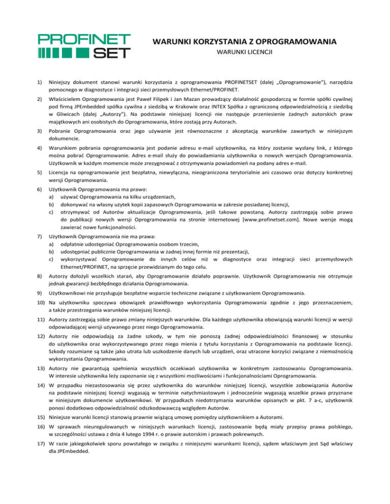 WARUNKI KORZYSTANIA Z OPROGRAMOWANIA WARUNKI LICENCJI 1) Niniejszy dokument stanowi warunki korzystania z oprogramowania PROFINETSET (dalej „Oprogramowanie”), narzędzia pomocnego w diagnostyce i integracji sieci przemysłowych Ethernet/PROFINET. 2) Właścicielem Oprogramowania jest Paweł Filipek i Jan Mazan prowadzący działalność gospodarczą w formie spółki cywilnej pod firmą JPEmbedded spółka cywilna z siedzibą w Krakowie oraz INTEX Spółka z ograniczoną odpowiedzialnością z siedzibą w Gliwicach (dalej „Autorzy”). Na podstawie niniejszej licencji nie następuje przeniesienie żadnych autorskich praw majątkowych ani osobistych do Oprogramowania, które zostają przy Autorach. 3) Pobranie Oprogramowania oraz jego używanie jest równoznaczne z akceptacją warunków zawartych w niniejszym dokumencie. 4) Warunkiem pobrania oprogramowania jest podanie adresu e-mail użytkownika, na który zostanie wysłany link, z którego można pobrać Oprogramowanie. Adres e-mail służy do powiadamiania użytkownika o nowych wersjach Oprogramowania. Użytkownik w każdym momencie może zrezygnować z otrzymywania powiadomień na podany adres e-mail. 5) Licencja na oprogramowanie jest bezpłatna, niewyłączna, nieograniczona terytorialnie ani czasowo oraz dotyczy konkretnej wersji Oprogramowania. 6) Użytkownik Oprogramowania ma prawo: a) używać Oprogramowania na kilku urządzeniach, b) dokonywać na własny użytek kopii zapasowych Oprogramowania w zakresie posiadanej licencji, c) otrzymywać od Autorów aktualizacje Oprogramowania, jeśli takowe powstaną. Autorzy zastrzegają sobie prawo do publikacji nowych wersji Oprogramowania na stronie internetowej [www.profinetset.com]. Nowe wersje mogą zawierać nowe funkcjonalności. 7) Użytkownik Oprogramowania nie ma prawa: a) odpłatnie udostępniać Oprogramowania osobom trzecim, b) udostępniać publicznie Oprogramowania w żadnej innej formie niż prezentacji, c) wykorzystywać Oprogramowanie do innych celów niż w diagnostyce oraz integracji sieci przemysłowych Ethernet/PROFINET, na sprzęcie przewidzianym do tego celu. 8) Autorzy dołożyli wszelkich starań, aby Oprogramowanie działało poprawnie. Użytkownik Oprogramowania nie otrzymuje jednak gwarancji bezbłędnego działania Oprogramowania. 9) Użytkownikowi nie przysługuje bezpłatne wsparcie techniczne związane z użytkowaniem Oprogramowania. 10) Na użytkowniku spoczywa obowiązek prawidłowego wykorzystania Oprogramowania zgodnie z jego przeznaczeniem, a także przestrzegania warunków niniejszej licencji. 11) Autorzy zastrzegają sobie prawo zmiany niniejszych warunków. Dla każdego użytkownika obowiązują warunki licencji w wersji odpowiadającej wersji używanego przez niego Oprogramowania. 12) Autorzy nie odpowiadają za żadne szkody, w tym nie ponoszą żadnej odpowiedzialności finansowej w stosunku do użytkownika oraz wykorzystywanego przez niego mienia z tytułu korzystania z Oprogramowania na podstawie licencji. Szkody rozumiane są także jako utrata lub uszkodzenie danych lub urządzeń, oraz utracone korzyści związane z niemożnością wykorzystania Oprogramowania. 13) Autorzy nie gwarantują spełnienia wszystkich oczekiwań użytkownika w konkretnym zastosowaniu Oprogramowania. W interesie użytkownika leży zapoznanie się z wszystkimi możliwościami i funkcjonalnościami Oprogramowania. 14) W przypadku niezastosowania się przez użytkownika do warunków niniejszej licencji, wszystkie zobowiązania Autorów na podstawie niniejszej licencji wygasają w terminie natychmiastowym i jednocześnie wygasają wszelkie prawa przyznane w niniejszym dokumencie użytkownikowi. W przypadkach niedotrzymania warunków opisanych w pkt. 7 a-c, użytkownik ponosi dodatkowo odpowiedzialność odszkodowawczą względem Autorów. 15) Niniejsze warunki licencji stanowią prawnie wiążącą umowę pomiędzy użytkownikiem a Autorami. 16) W sprawach nieuregulowanych w niniejszych warunkach licencji, zastosowanie będą miały przepisy prawa polskiego, w szczególności ustawa z dnia 4 lutego 1994 r. o prawie autorskim i prawach pokrewnych. 17) W razie jakiegokolwiek sporu powstałego w związku z niniejszymi warunkami licencji, sądem właściwym jest Sąd właściwy dla JPEmbedded.