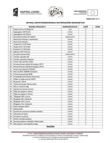 Załącznik nr 1 WYKAZ ZAPOTRZEBOWANIA MATERIAŁÓW BIUROWYCH L.P. 1 2 3 4 5 6 7 8 9 10 11 12 13 14 15 16 17 18 19 20 21 22 23 24 25 26 27 28 29 30 31 32 33 34 35 36 37 38 39 NAZWA PRODUKTU Papier ksero A4 80gr/m2 Segregator A475mm Segregator A4 50mm Koszulka Esselte A4 100szt Skoroszyt twardy z zawieszką Skoroszyt twardy Koperta C-6 SK biała Koperta B-5 SK biała Koperta C-4 SK biała Spinacz R28 !/10 szt Zszywki Grand 24/6 Teczka z gumką A4 Teczka z gumką wiązana Toner Hp LaserJet 1020 Atramentowy wkład drukujący HP17 Atramentowy wkład drukujący HP15 Toner Hp LaserJet P2055D Płyt CD-RW 700MB Verbatim Przenośna pamięć 8GB Przekładki kartonowe kolorowe Półka na dokumenty IDEST Nożyczki 26cm Taśma biurowa 18mmx10m Klej w sztyfcie 20g Spinacz krzyżowy 41mm Klipy do papieru 19mm Klipy do papieru 32mm Długopis BIC czarny Długopis BIC niebieski Długopis Pen czarny Długopis Pen niebieski Pióro żelowe IDEST Ołówek BIC Gumki do usuwania śladów ołówka Zakreslacze Kolor Korektor w piórze Kostki samoprzylepne Samoprzylepne zakładki indeksujące Mix papieru kserograficznego ROZMIAR/SZTUK ryza sztuka sztuka opakowanie sztuka sztuka sztuka sztuka sztuka sztuka opakowanie sztuka sztuka sztuka sztuka sztuka sztuka sztuka sztuka sztuka sztuka sztuka sztuka sztuka sztuka sztuka sztuka sztuka sztuka sztuka sztuka sztuka sztuka sztuka sztuka sztuka sztuka sztuka sztuka ILOŚĆ 1 1 1 1 1 1 1 1 1 1 1 1 1 1 1 1 1 1 1 1 1 1 1 1 1 1 1 1 1 1 1 1 1 1 1 1 1 1 1 RAZEM Projekt „Zajęcia dodatkowe podstawą rozwoju uczniów z gimnazjum w Piątnicy” Współfinansowany ze środków Unii Europejskiej w ramach Europejskiego Funduszu Społecznego w ramach Poddziałania 9.1.2 Programu Operacyjnego Kapitał Ludzki nr wniosku WND-POKL.09.01.02-20-544/11 CENA Miejsce i terminy składania oferty Osoby zainteresowane udziałem w wykonaniu w/w usługi prosimy o składanie wymaganych dokumentów w zamkniętej, nieprzezroczystej kopercie na adres: Publiczne Gimnazjum im Ofiar Katynia w Piątnicy 18 – 421 Piątnica ul. Szkolna 31 Z dopiskiem: Wybór dostawcy usługi polegającej na dostarczeniu materiałów biurowych w ramach projektu „Zajęcia dodatkowe podstawą rozwoju uczniów z gimnazjum w Piątnicy” W terminie do dnia 09 grudnia 2011 roku do godziny 10.00 ( data wpłynięcia dokumentów ). Prosimy o złożenie oferty wyłącznie na formularzu stanowiącym załącznik nr 1 do niniejszego Zapytania Dokumenty, które wpłyną po upływie wyżej wyznaczonego terminu nie będą rozpatrywane. O wyniku wyboru oferty, zainteresowani zostaną powiadomieni telefonicznie i e-mailowo. ………………………………………………….. Miejscowość, data …………………………………………………………………………. podpis i pieczęć osoby uprawnionej do reprezentowania Wykonawcy Projekt „Zajęcia dodatkowe podstawą rozwoju uczniów z gimnazjum w Piątnicy” Współfinansowany ze środków Unii Europejskiej w ramach Europejskiego Funduszu Społecznego w ramach Poddziałania 9.1.2 Programu Operacyjnego Kapitał Ludzki nr wniosku WND-POKL.09.01.02-20-544/11