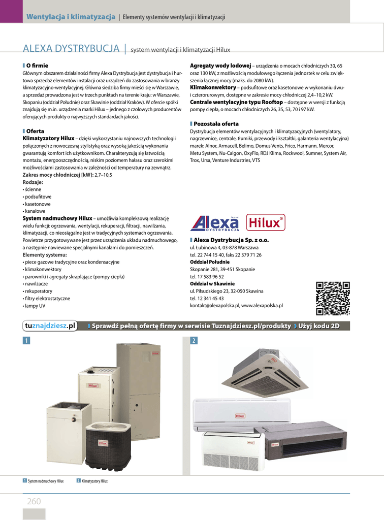 Wentylacja i klimatyzacja | Elementy systemów wentylacji i klimatyzacji Alexa dystrybucja | system wentylacji i klimatyzacji Hilux ❚ O firmie Głównym obszarem działalności firmy Alexa Dystrybucja jest dystrybucja i hurtowa sprzedaż elementów instalacji oraz urządzeń do zastosowania w branży klimatyzacyjno-wentylacyjnej. Główna siedziba firmy mieści się w Warszawie, a sprzedaż prowadzona jest w trzech punktach na terenie kraju: w Warszawie, Skopaniu (oddział Południe) oraz Skawinie (oddział Kraków). W ofercie spółki znajdują się m.in. urządzenia marki Hilux – jednego z czołowych producentów oferujących produkty o najwyższych standardach jakości. ❚ Oferta Klimatyzatory Hilux– dzięki wykorzystaniu najnowszych technologii połączonych z nowoczesną stylistyką oraz wysoką jakością wykonania gwarantują komfort ich użytkownikom. Charakteryzują się łatwością montażu, energooszczędnością, niskim poziomem hałasu oraz szerokimi możliwościami zastosowania w zależności od temperatury na zewnątrz. Zakres mocy chłodniczej [kW]: 2,7–10,5 Agregaty wody lodowej– urządzenia o mocach chłodniczych 30, 65 oraz 130 kW, z możliwością modułowego łączenia jednostek w celu zwiększenia łącznej mocy (maks. do 2080 kW). Klimakonwektory– podsufitowe oraz kasetonowe w wykonaniu dwui czterorurowym, dostępne w zakresie mocy chłodniczej 2,4–10,2 kW. Centrale wentylacyjne typu Rooftop– dostępne w wersji z funkcją pompy ciepła, o mocach chłodniczych 26, 35, 53, 70 i 97 kW. ❚ Pozostała oferta Dystrybucja elementów wentylacyjnych i klimatyzacyjnych (wentylatory, nagrzewnice, centrale, tłumiki, przewody i kształtki, galanteria wentylacyjna) marek: Alnor, Armacell, Belimo, Domus Vents, Frico, Harmann, Mercor, Metu System, Nu-Calgon, OxyFlo, RDJ Klima, Rockwool, Sumner, System Air, Trox, Ursa, Venture Industries, VTS Rodzaje: • ścienne • podsufitowe • kasetonowe • kanałowe System nadmuchowy Hilux– umożliwia kompleksową realizację wielu funkcji: ogrzewania, wentylacji, rekuperacji, filtracji, nawilżania, klimatyzacji, co nieosiągalne jest w tradycyjnych systemach ogrzewania. Powietrze przygotowywane jest przez urządzenia układu nadmuchowego, a następnie nawiewane specjalnymi kanałami do pomieszczeń. Elementy systemu: • piece gazowe tradycyjne oraz kondensacyjne • klimakonwektory • parowniki i agregaty skraplające (pompy ciepła) • nawilżacze • rekuperatory • filtry elektrostatyczne • lampy UV ❚ Alexa Dystrybucja Sp. z o.o. ul. Łubinowa 4, 03-878 Warszawa tel. 22 744 15 40, faks 22 379 71 26 Oddział Południe Skopanie 281, 39-451 Skopanie tel. 17 583 96 52 Oddział w Skawinie ul. Piłsudskiego 23, 32-050 Skawina tel. 12 341 45 43 [email protected], www.alexapolska.pl ❱ Sprawdź pełną ofertę firmy w serwisie Tuznajdziesz.pl/produkty ❱ Użyj kodu 2D 1 1 System nadmuchowy Hilux 260 2 2 Klimatyzatory Hilux